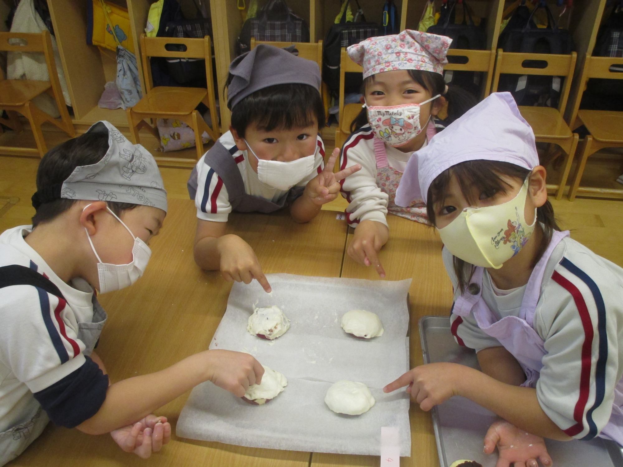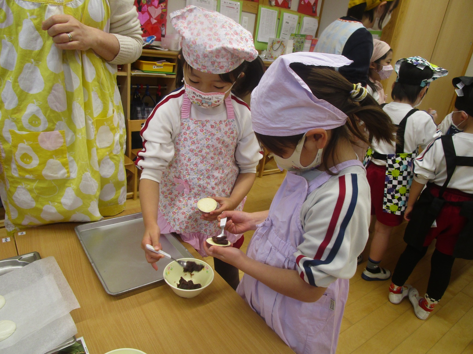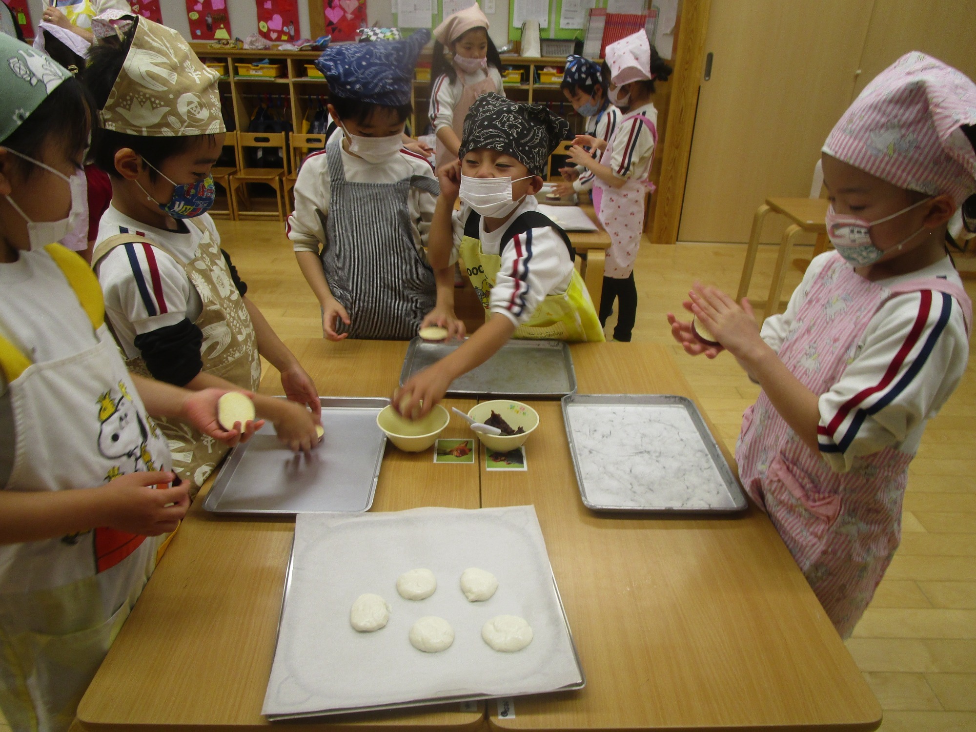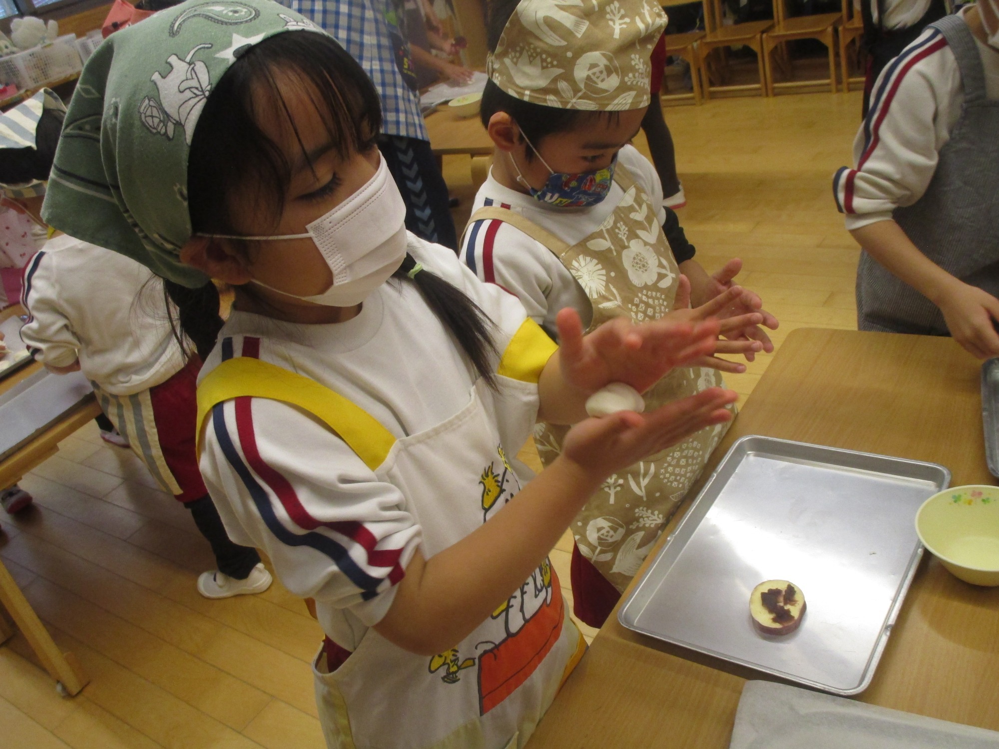 「手にいっぱいくっつくな~」「きれいに出来たよ☆」「あんこが生地にまざってチョコレートみたいな色になっちゃった」
