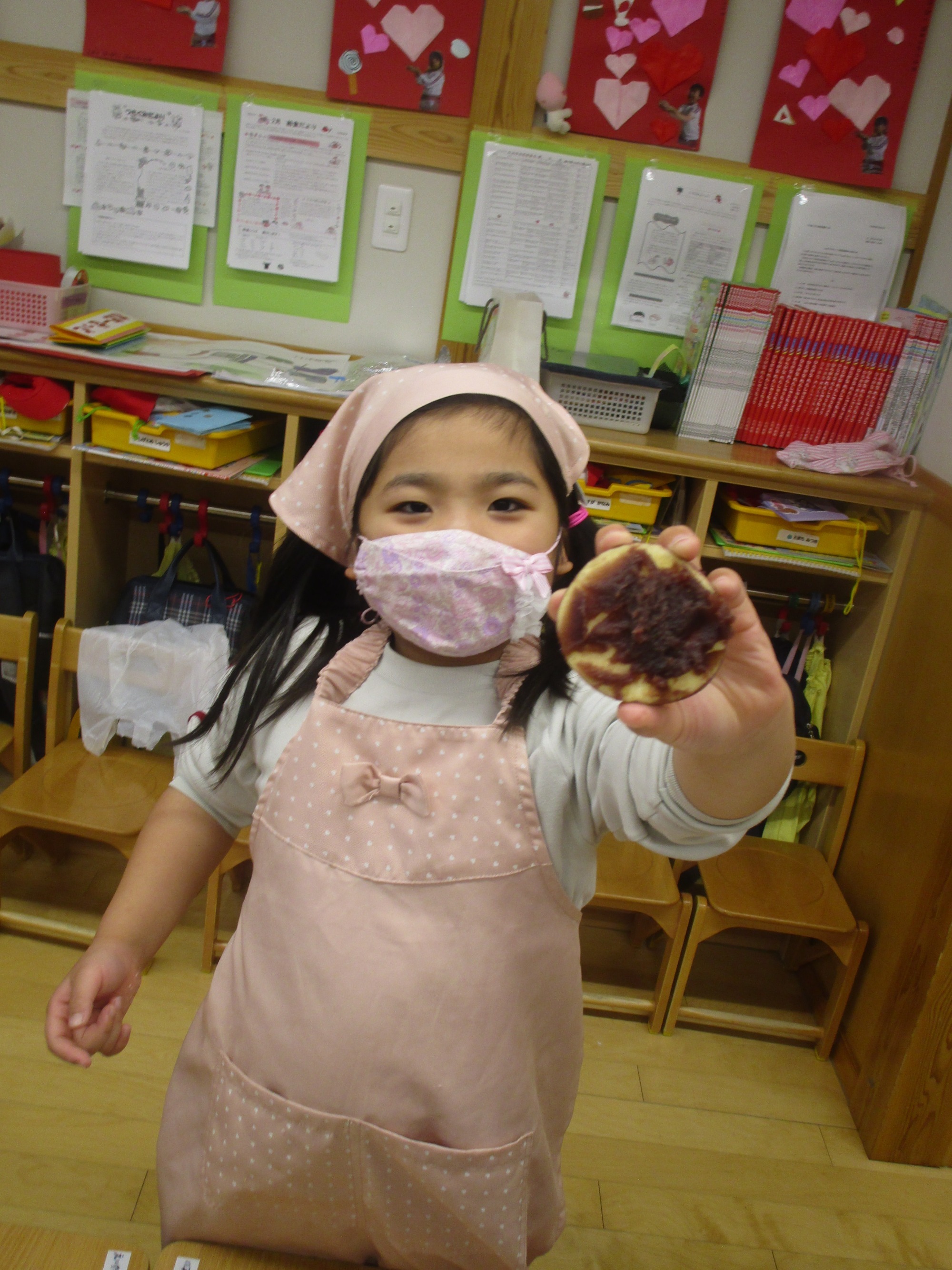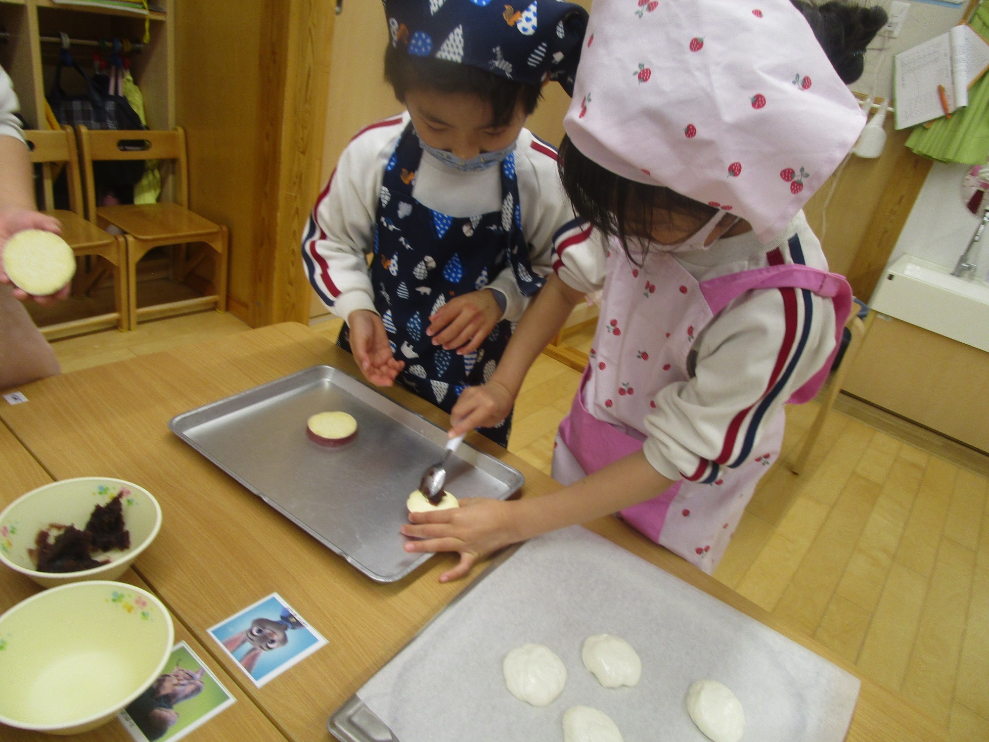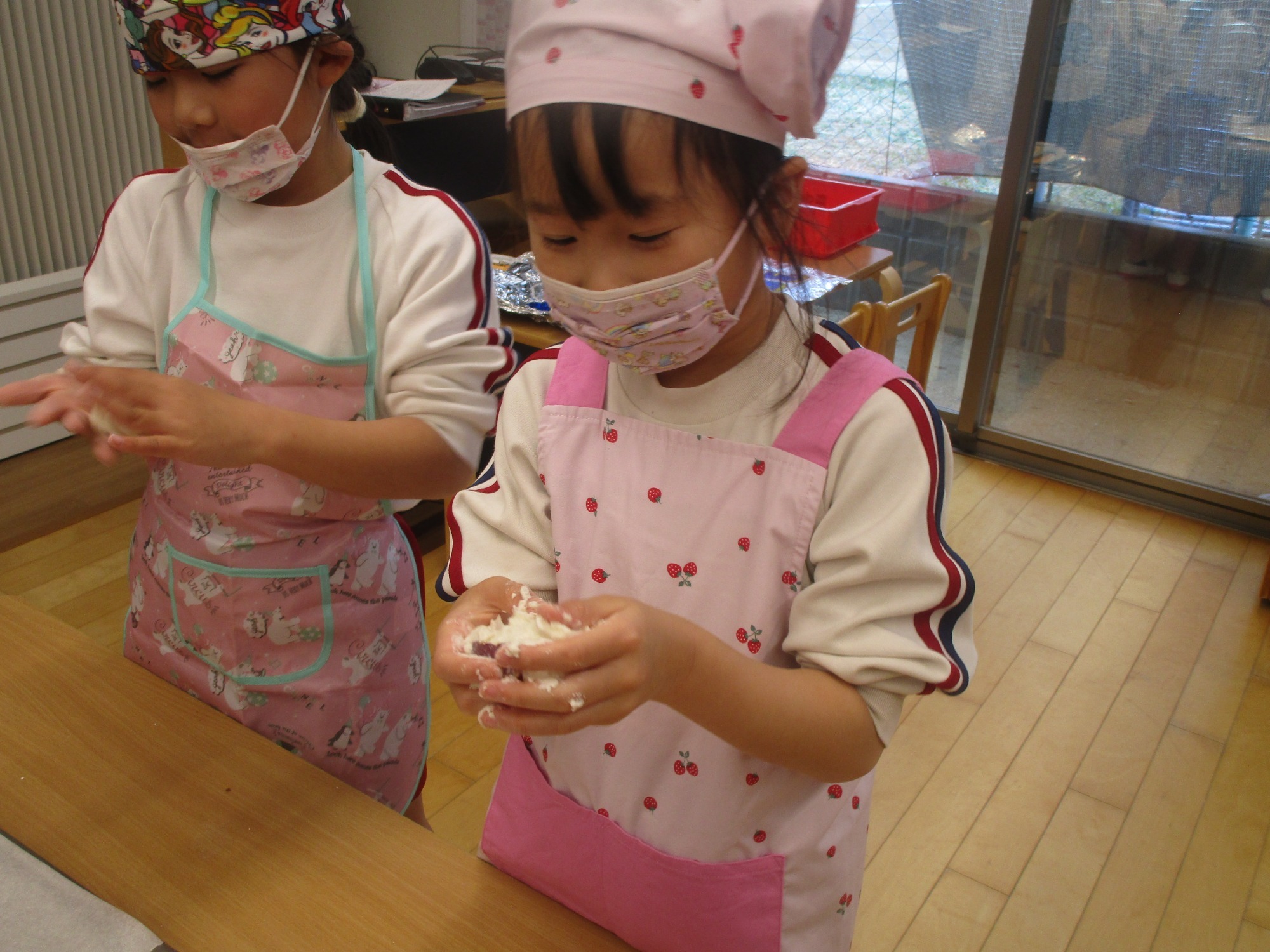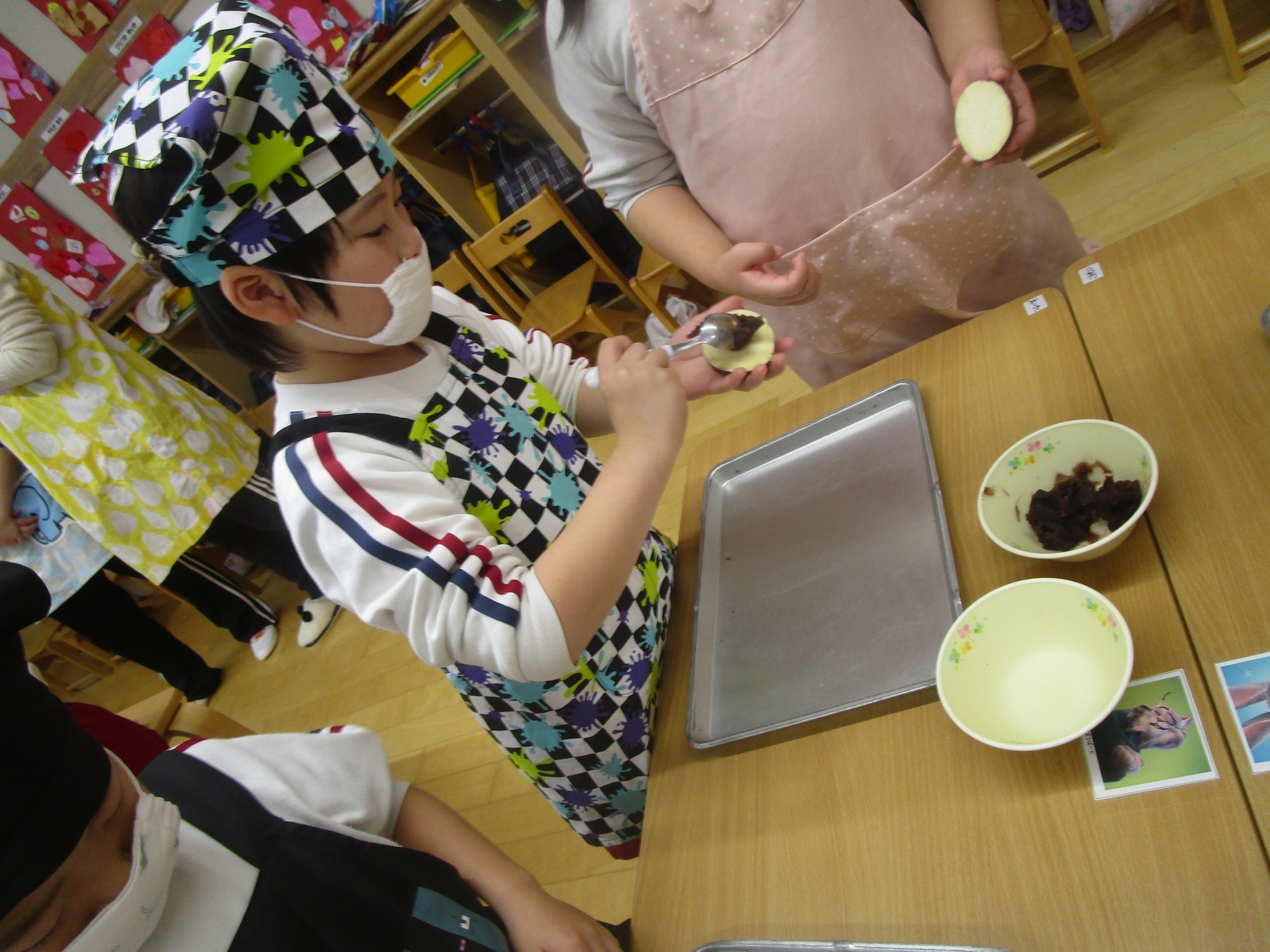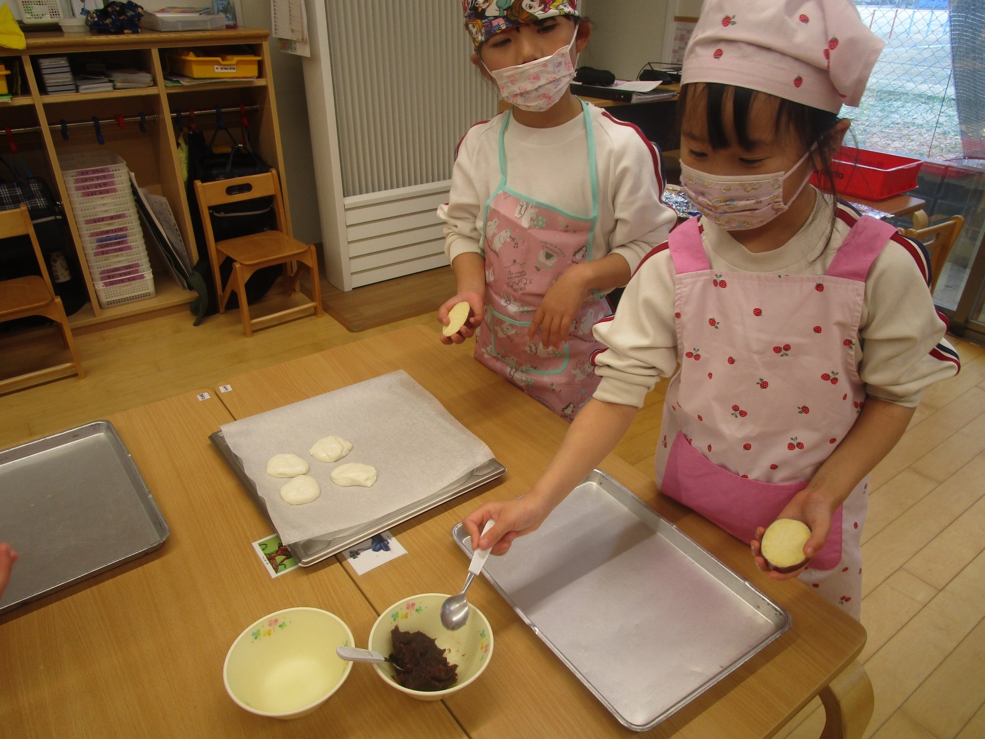 「手にいっぱいくっつくな~」「きれいに出来たよ☆」「あんこが生地にまざってチョコレートみたいな色になっちゃった」