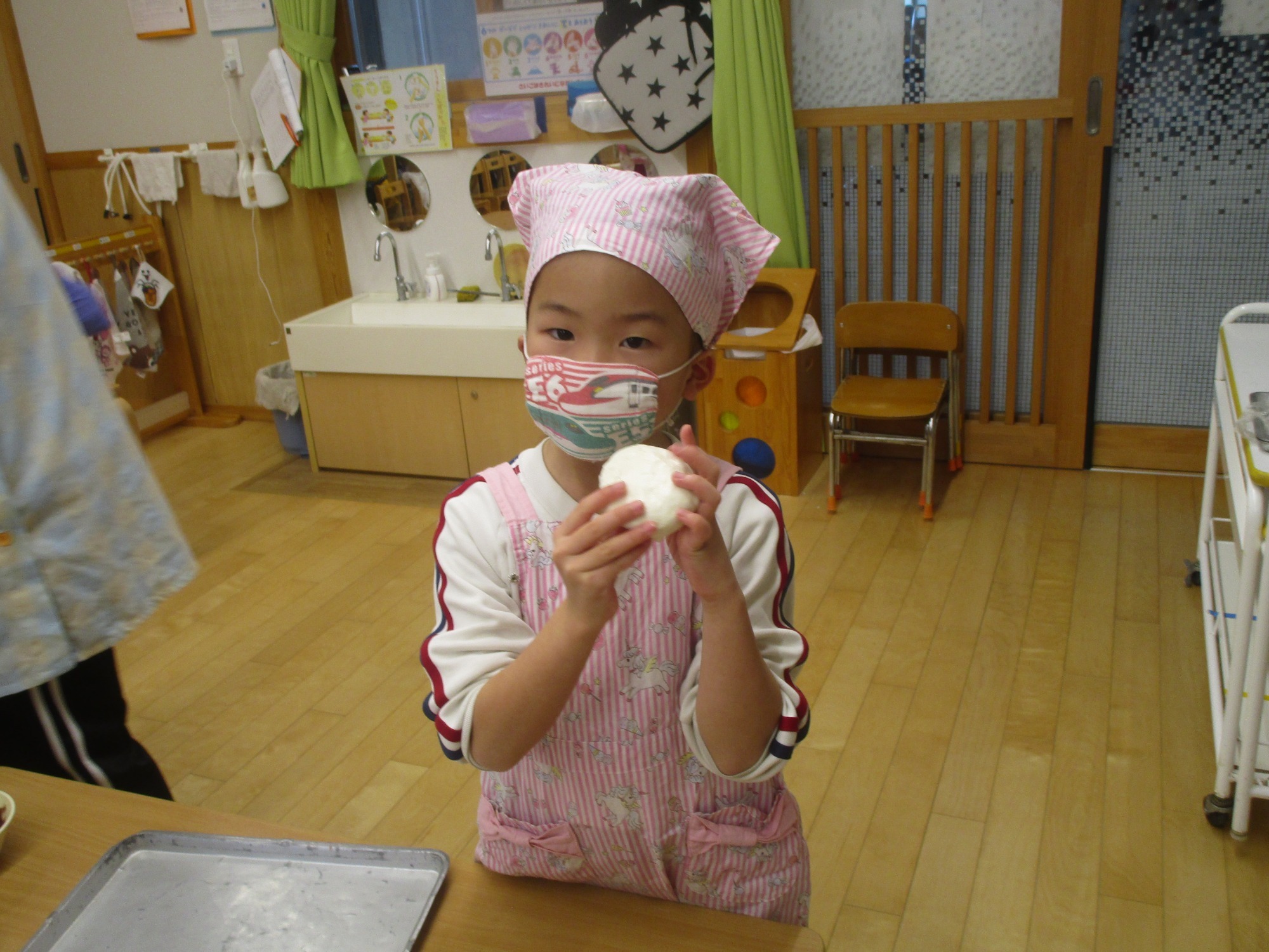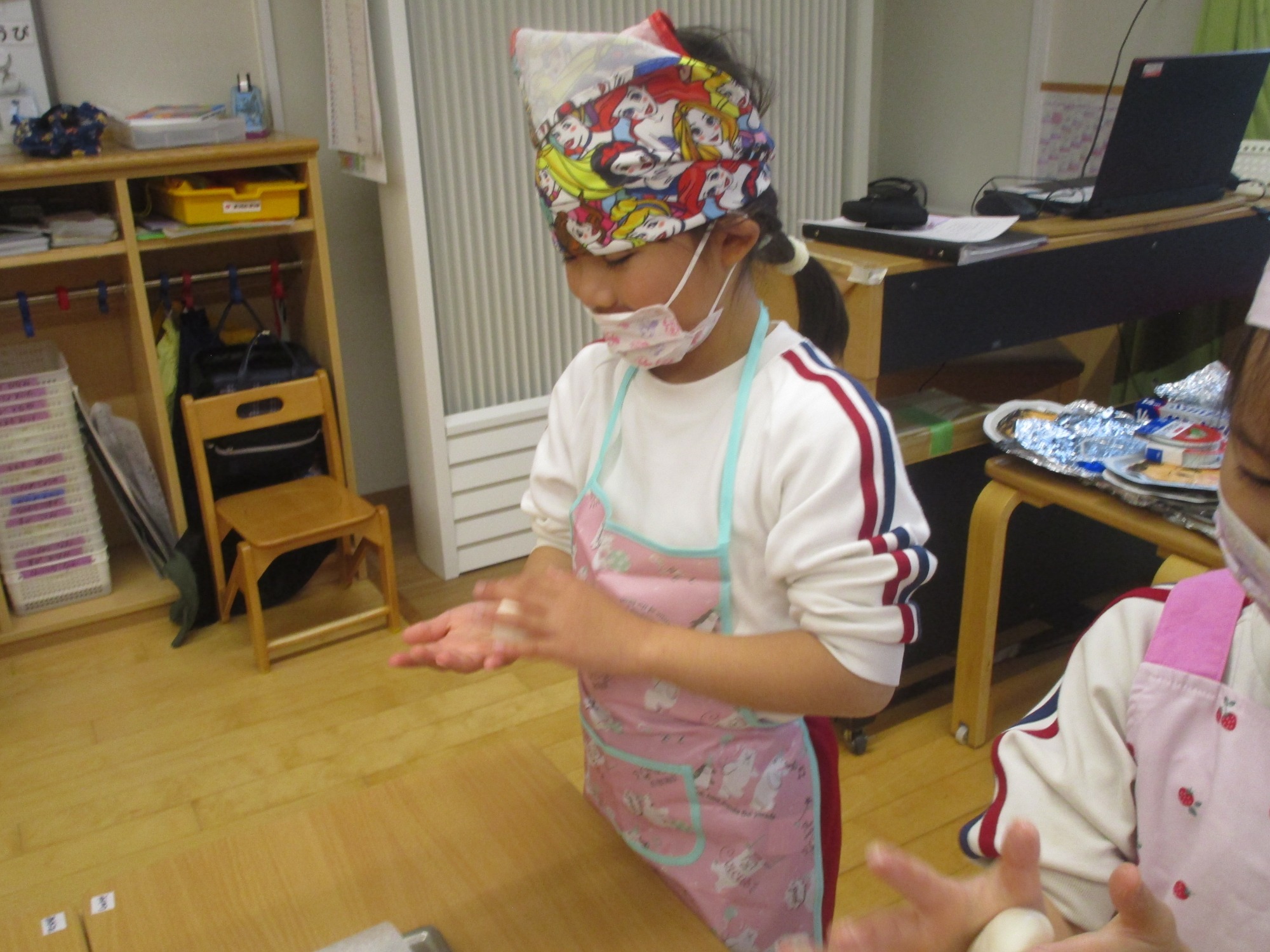 みんなに生地を配ってから、「くるくる丸めて、手のひらでつぶして平たくしてね」と、作り方を説明しました。