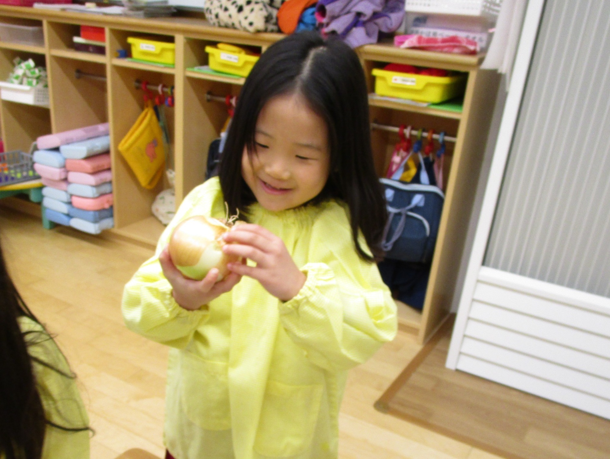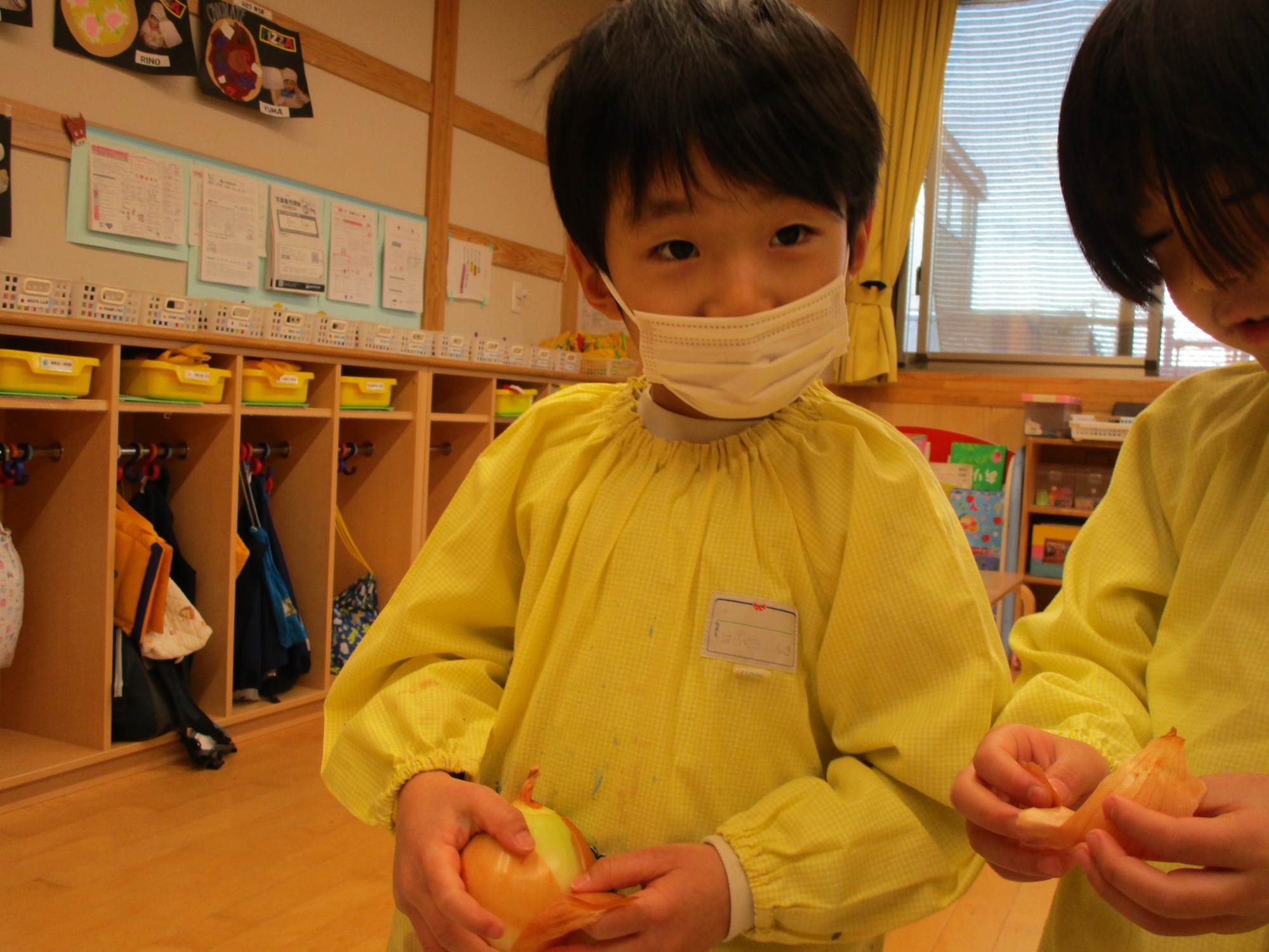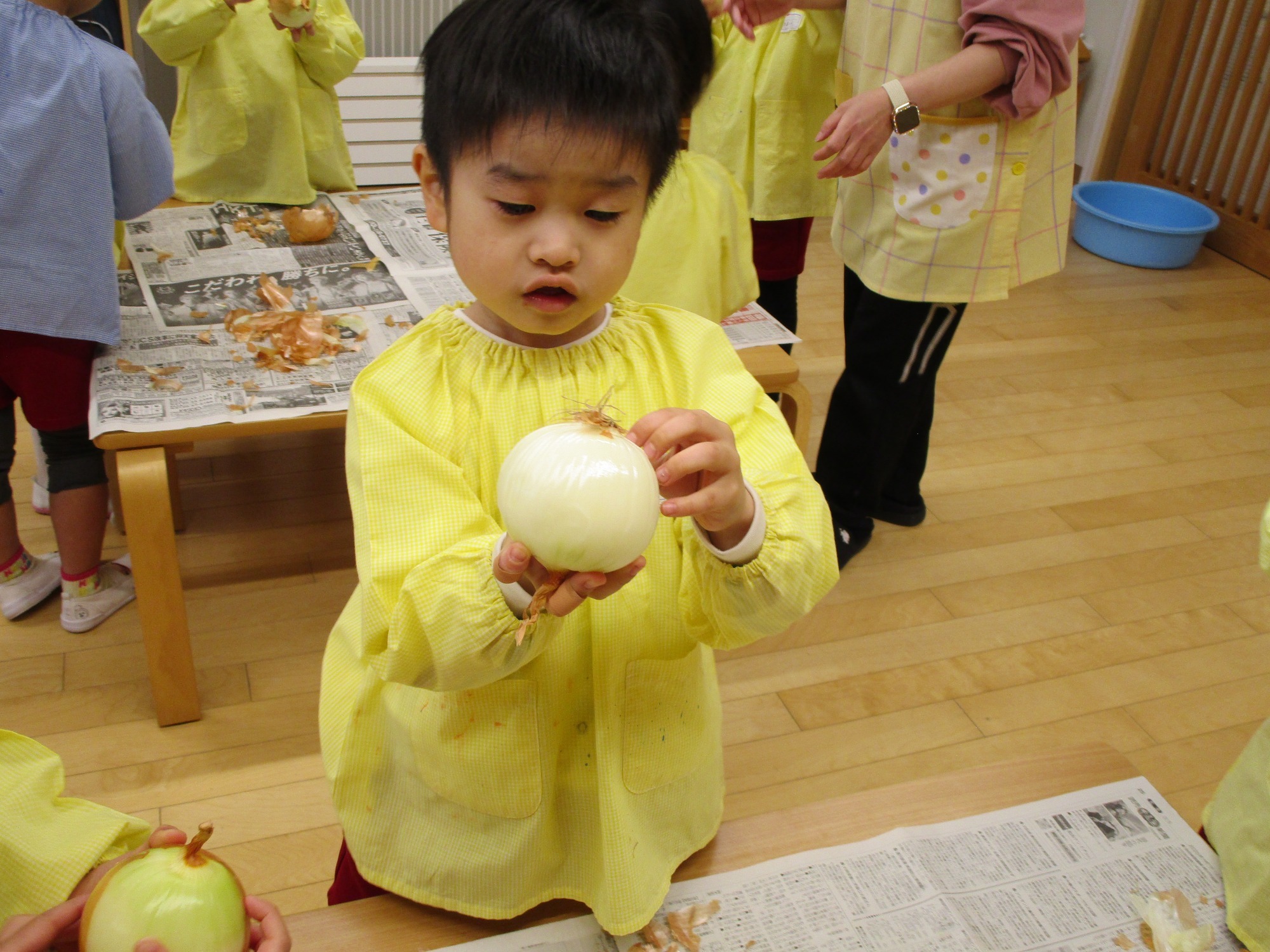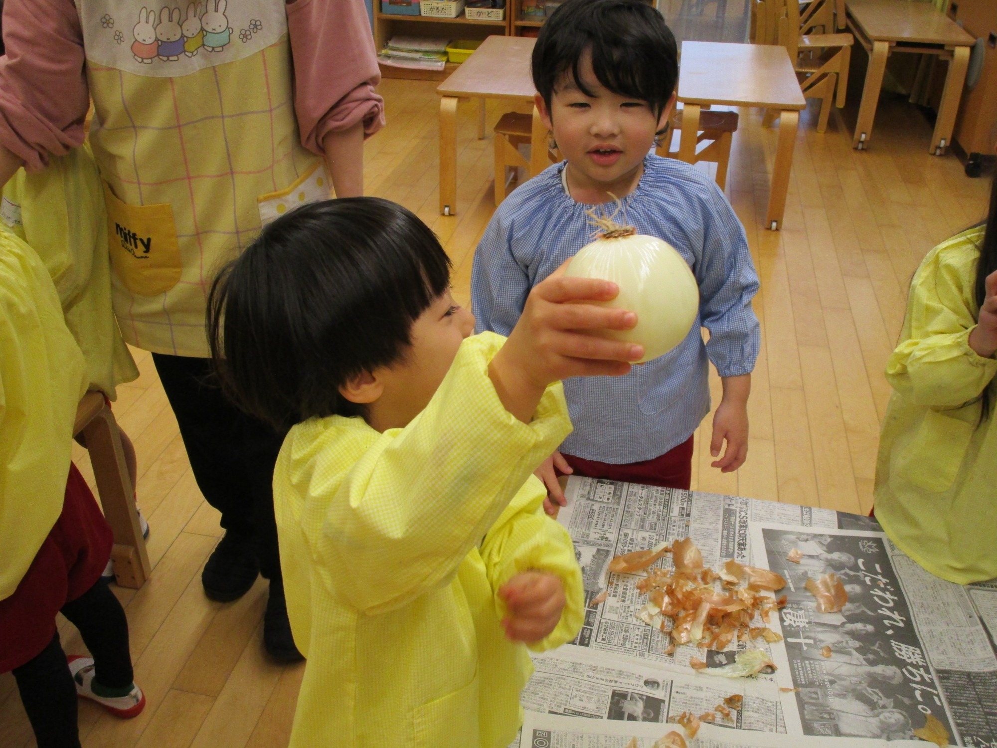玉ねぎを持って・・・「どこからむくのかな?」「茶色のところをむくんだね」「白いところがみえたよ!」
