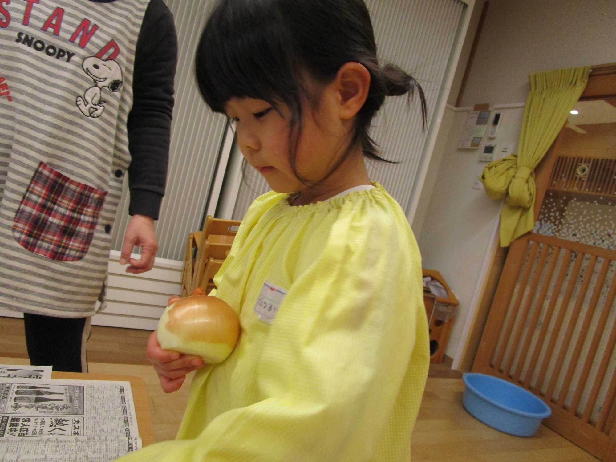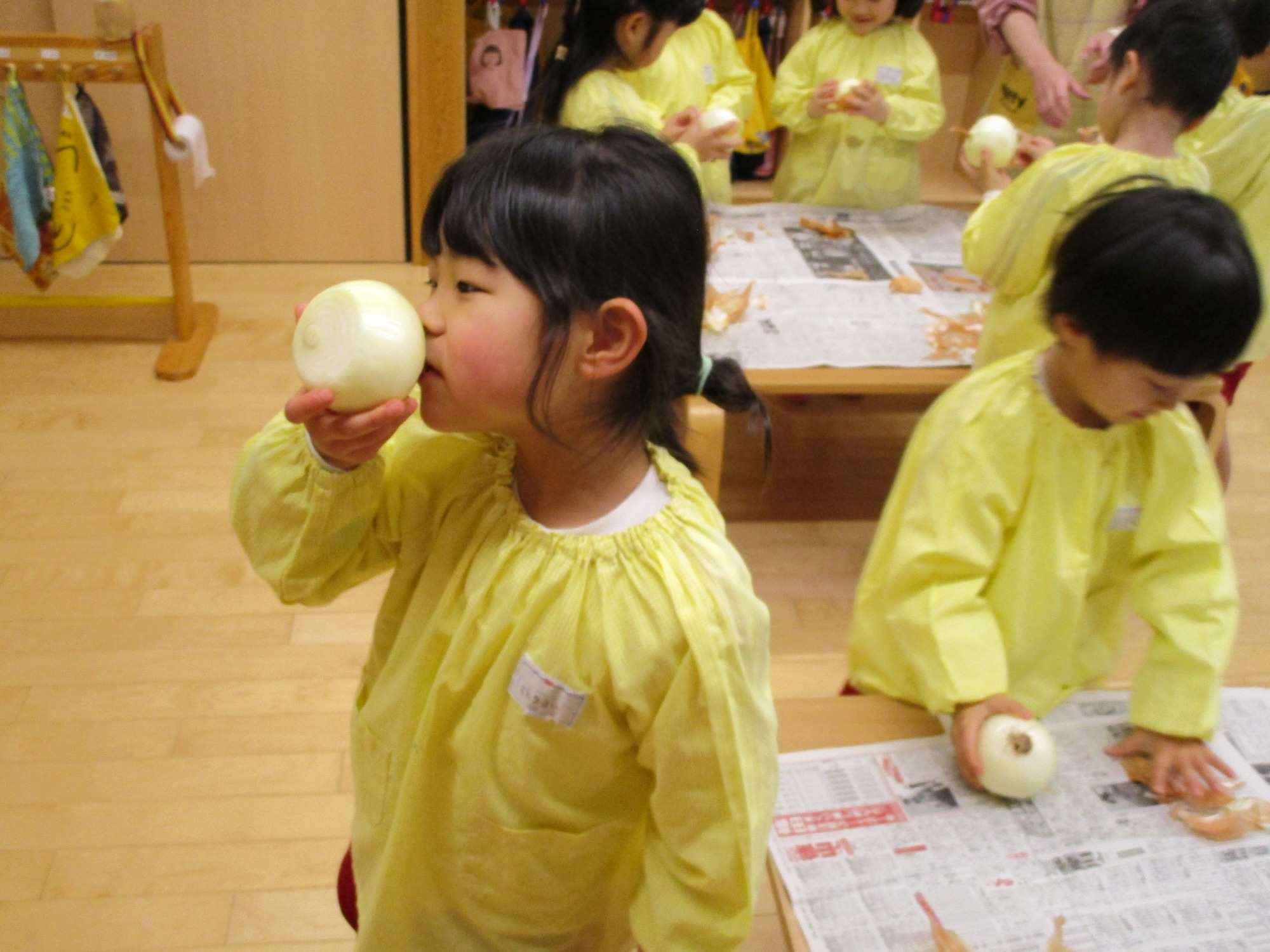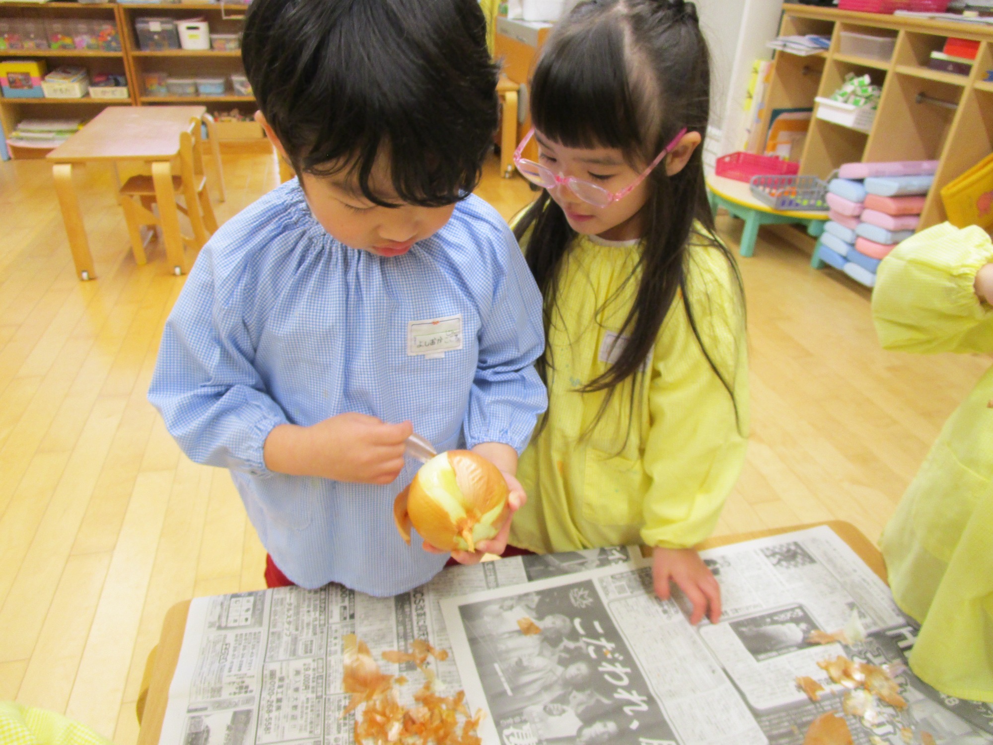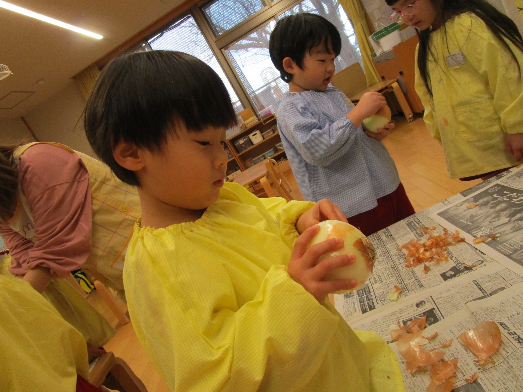 玉ねぎを持って・・・「どこからむくのかな?」「茶色のところをむくんだね」「白いところがみえたよ!」