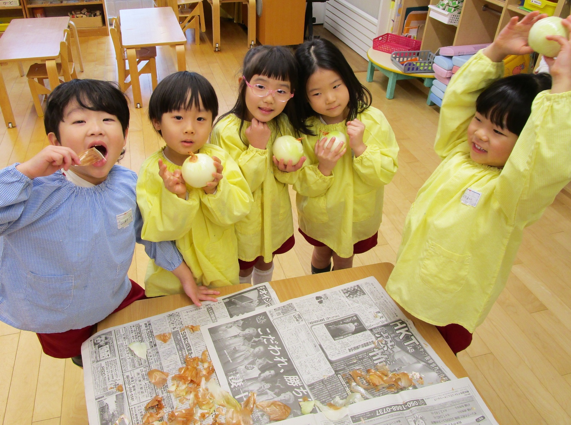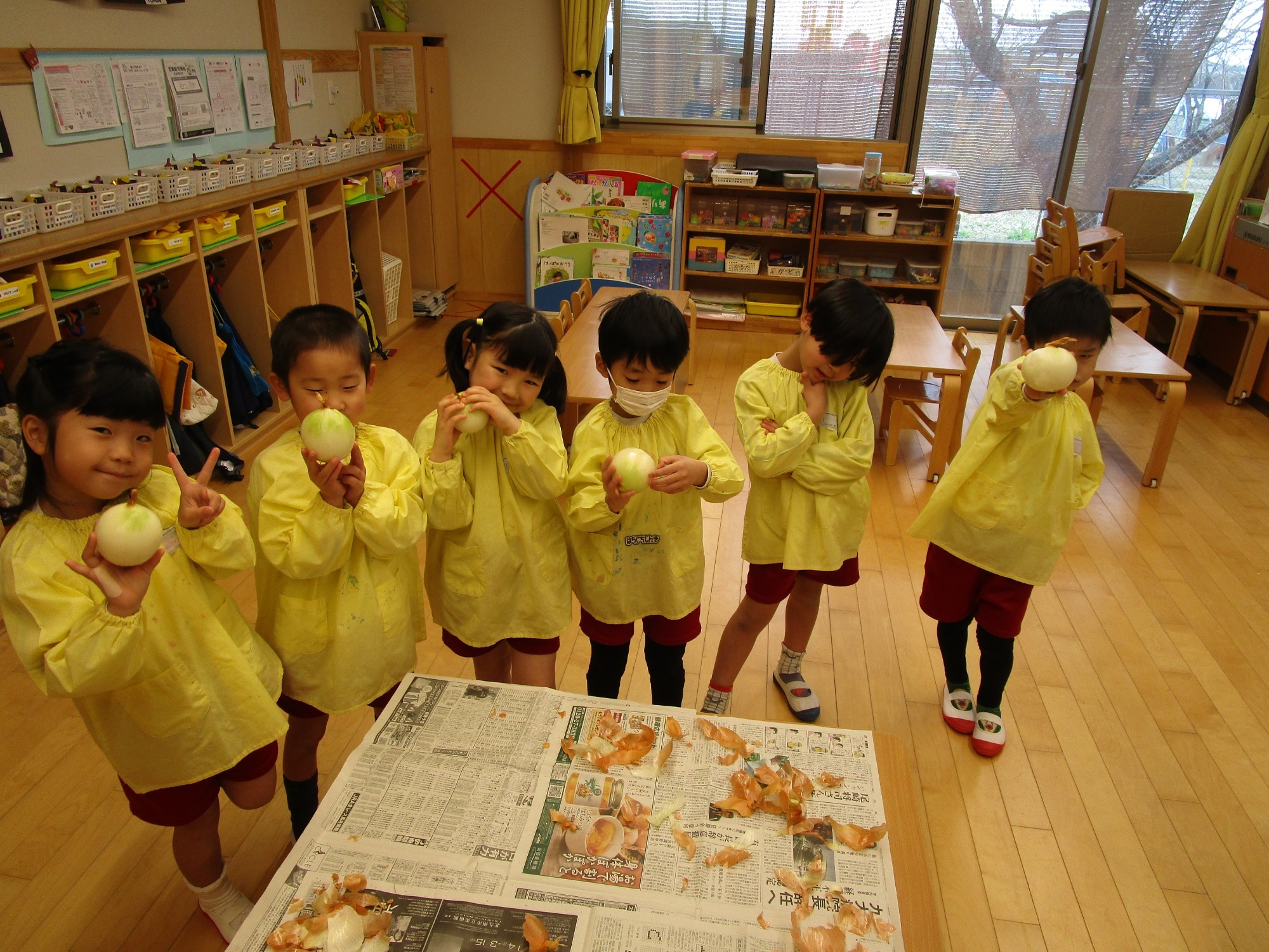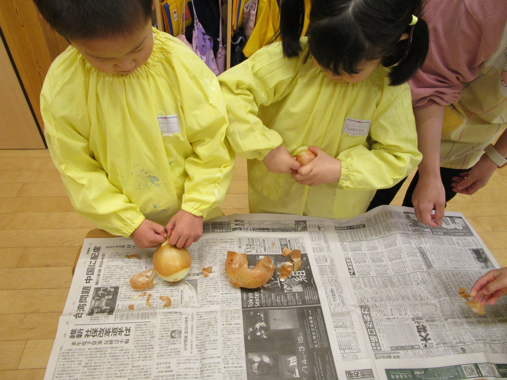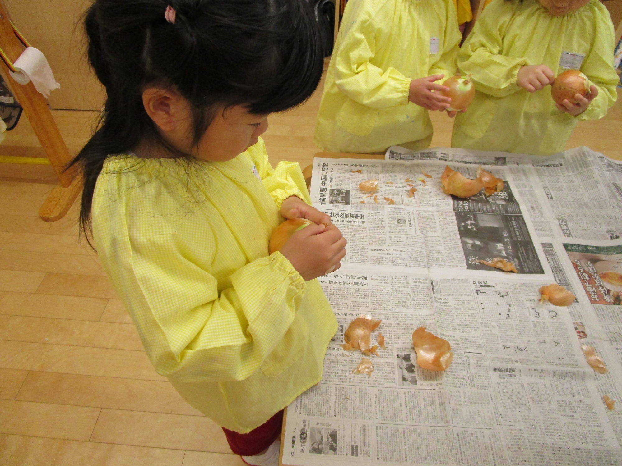 玉ねぎを持って・・・「どこからむくのかな?」「茶色のところをむくんだね」「白いところがみえたよ!」