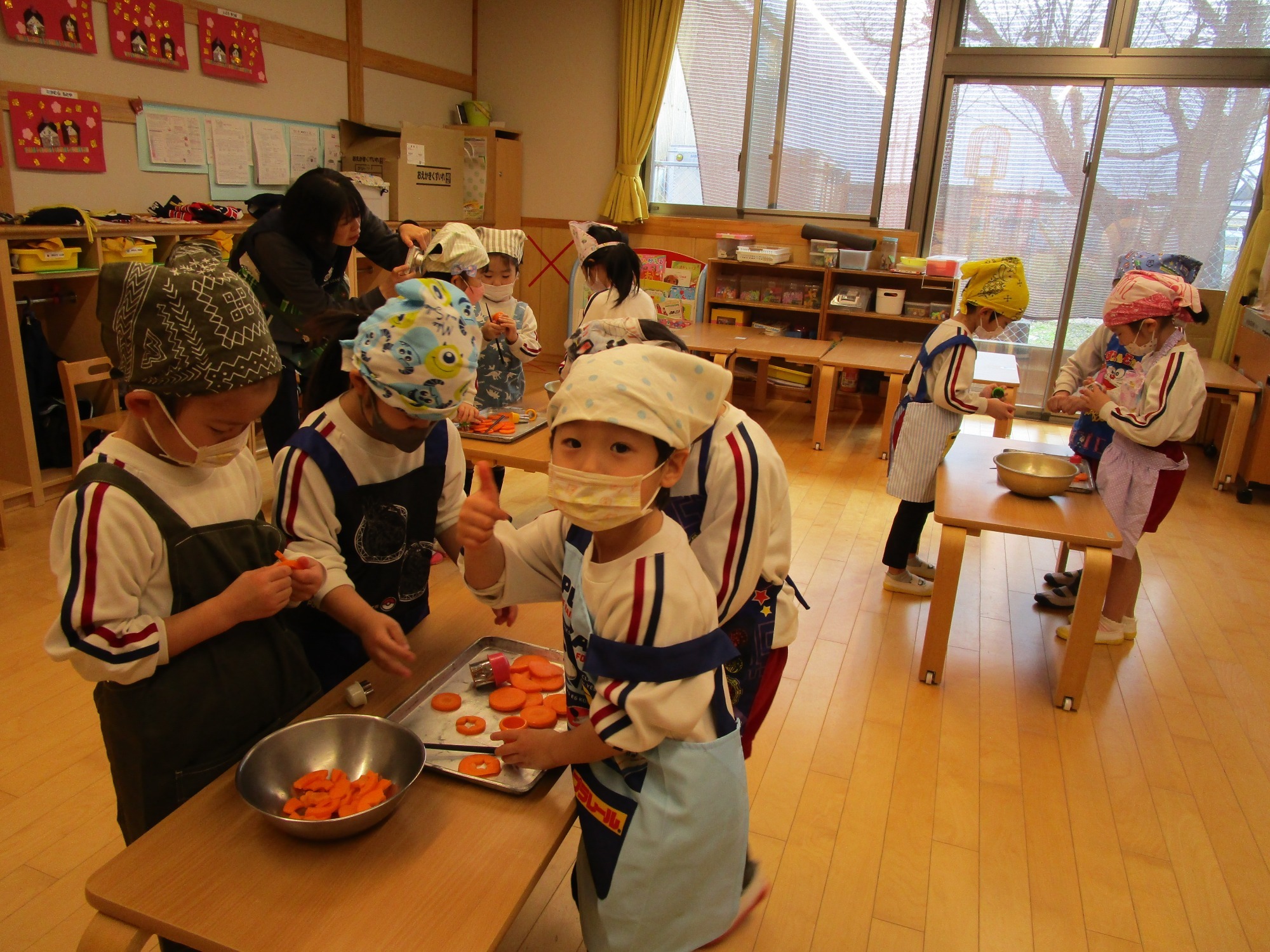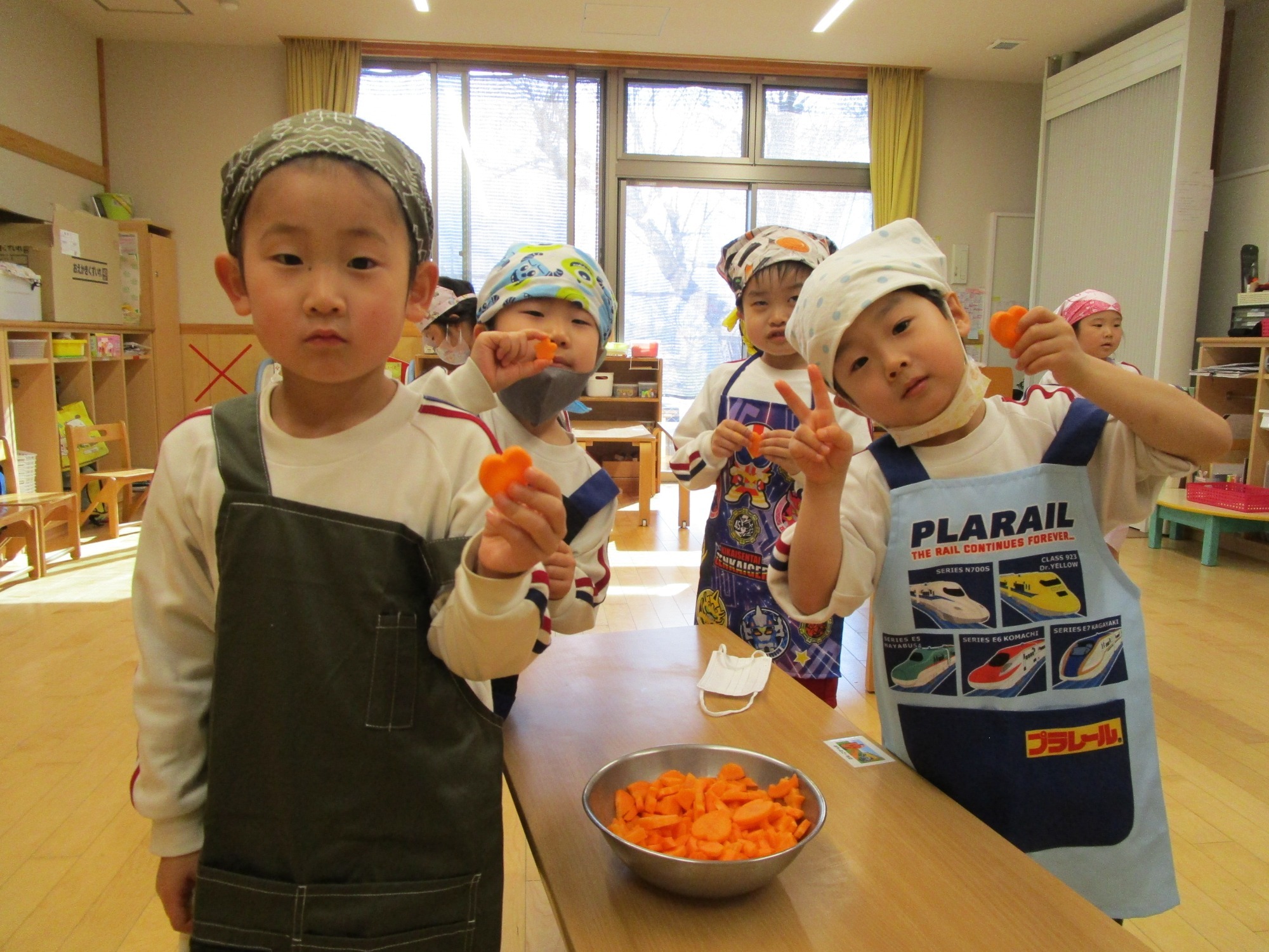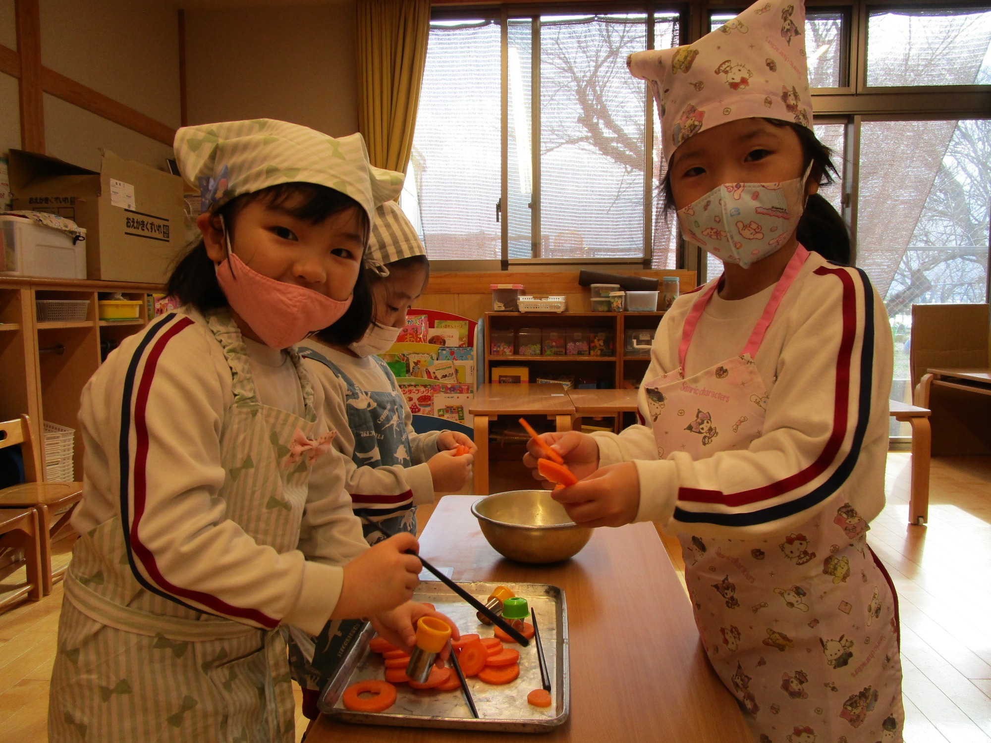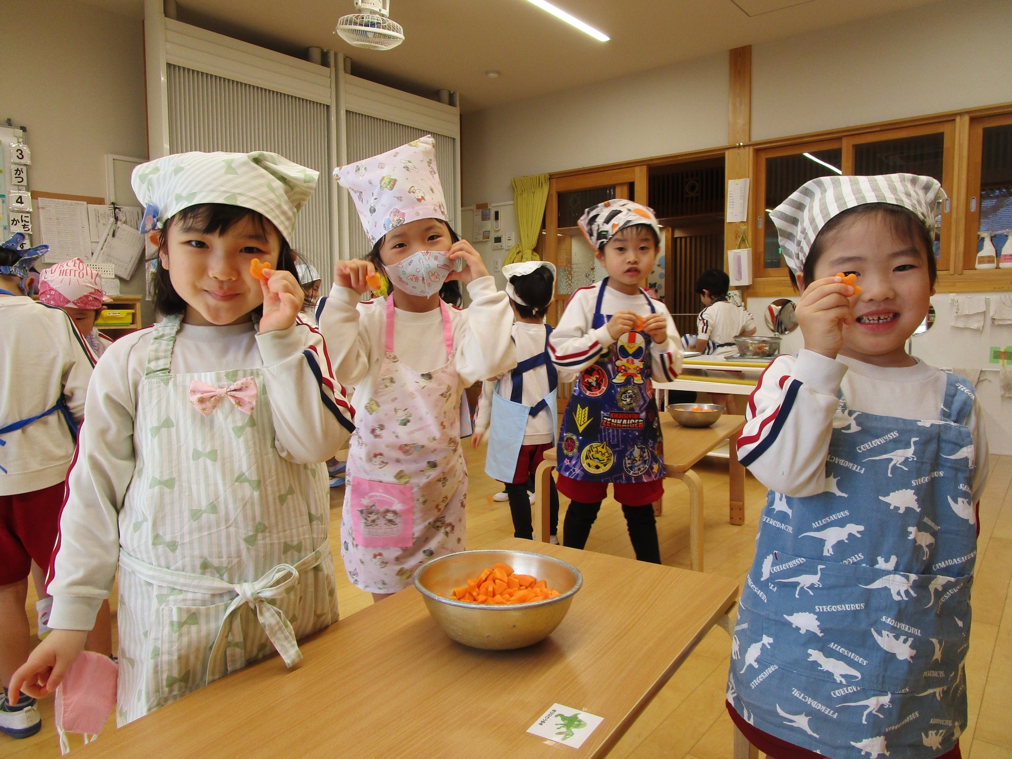 今日は、つき組さんのクッキングで、人参の型抜きをしました。