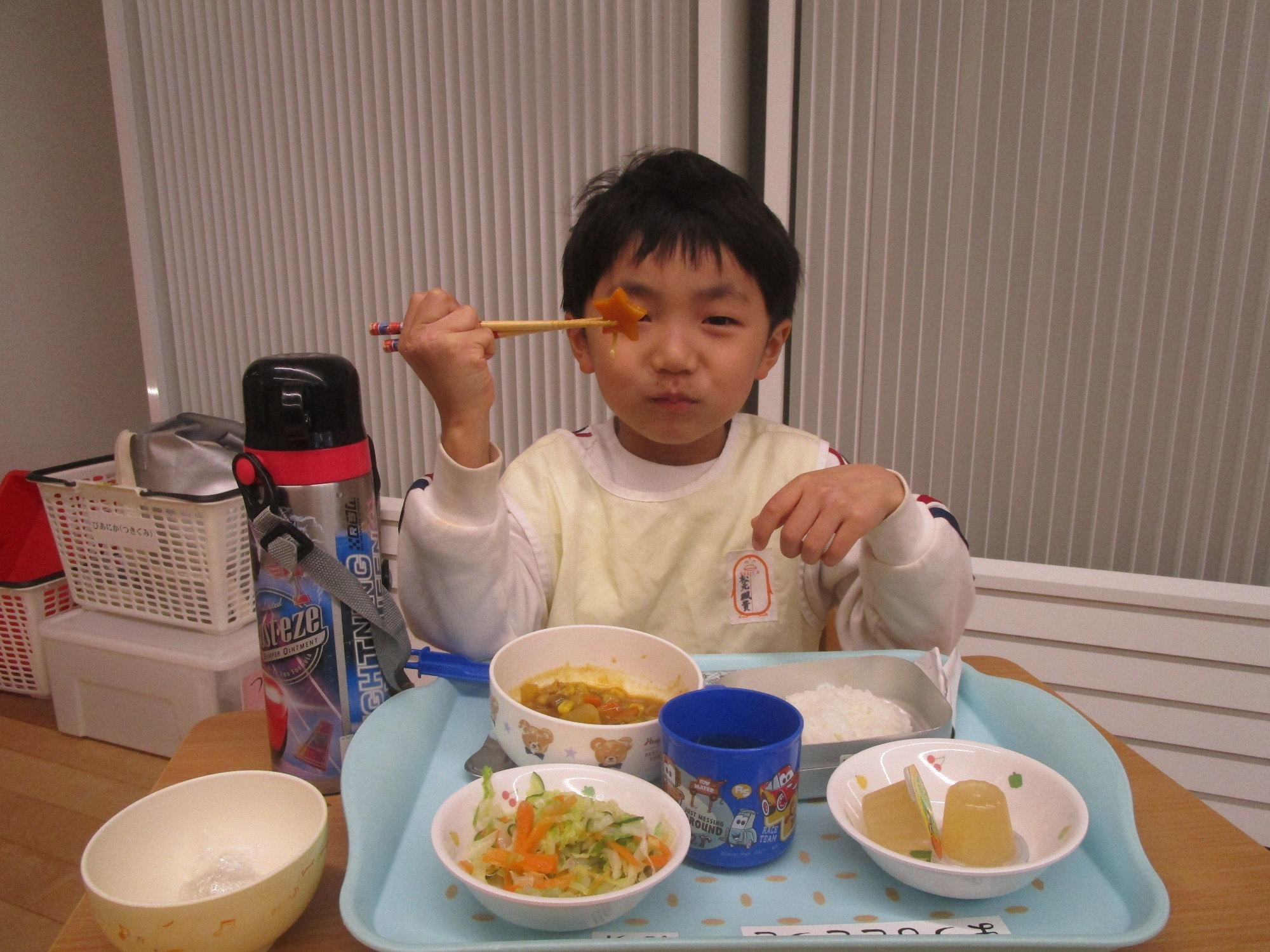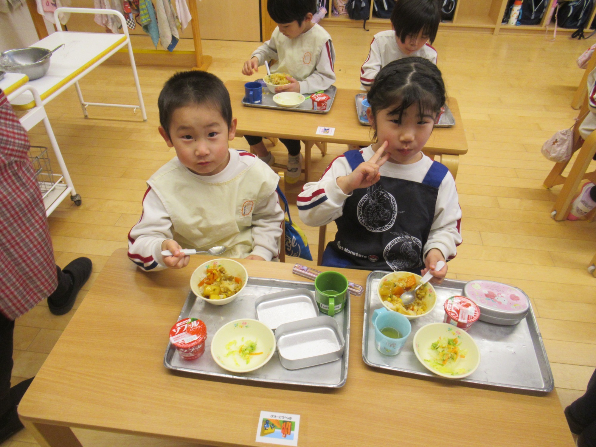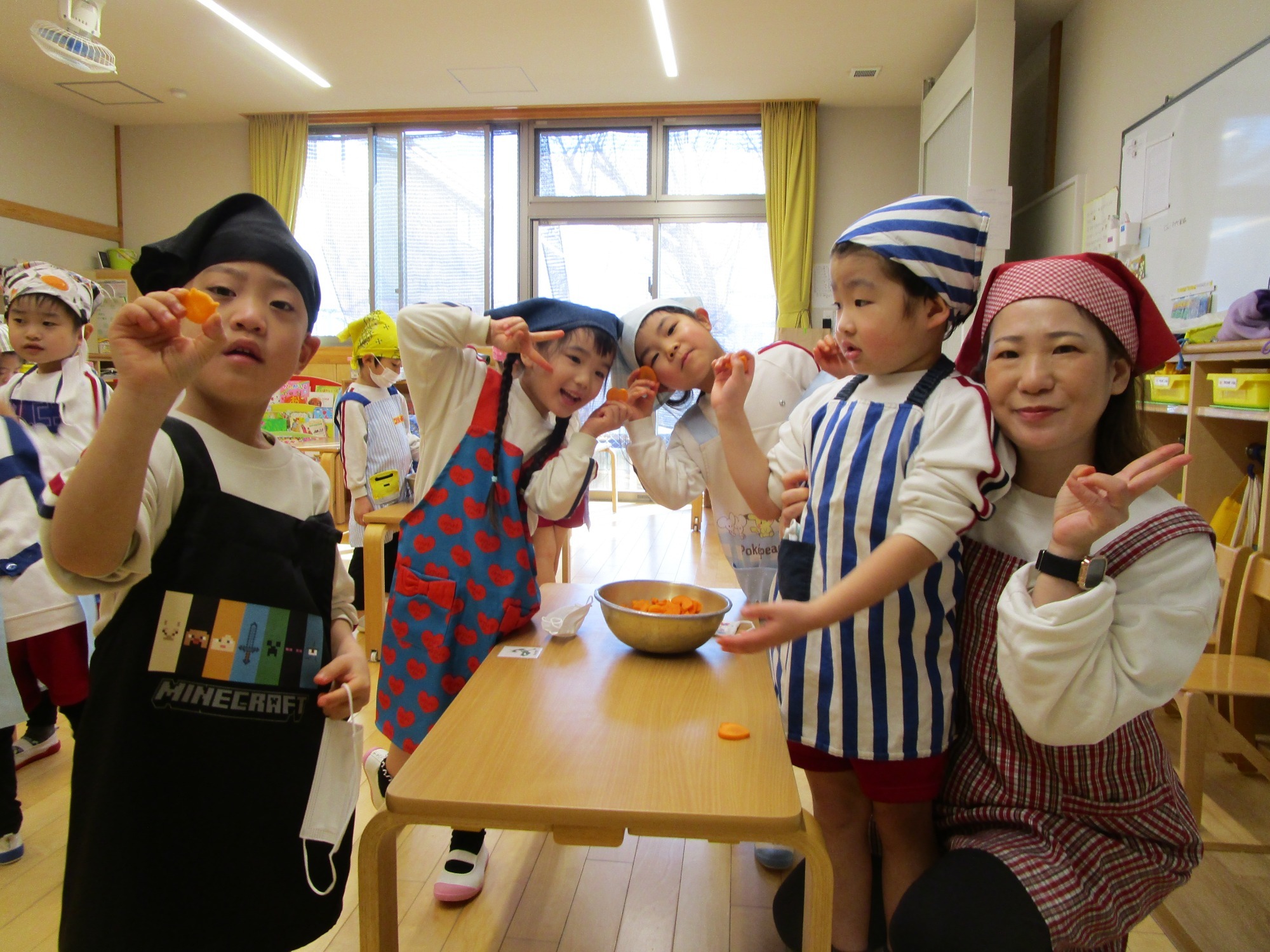 給食の時間になり、お雑煮の中から、可愛い形のにんじんをみんなで探します!