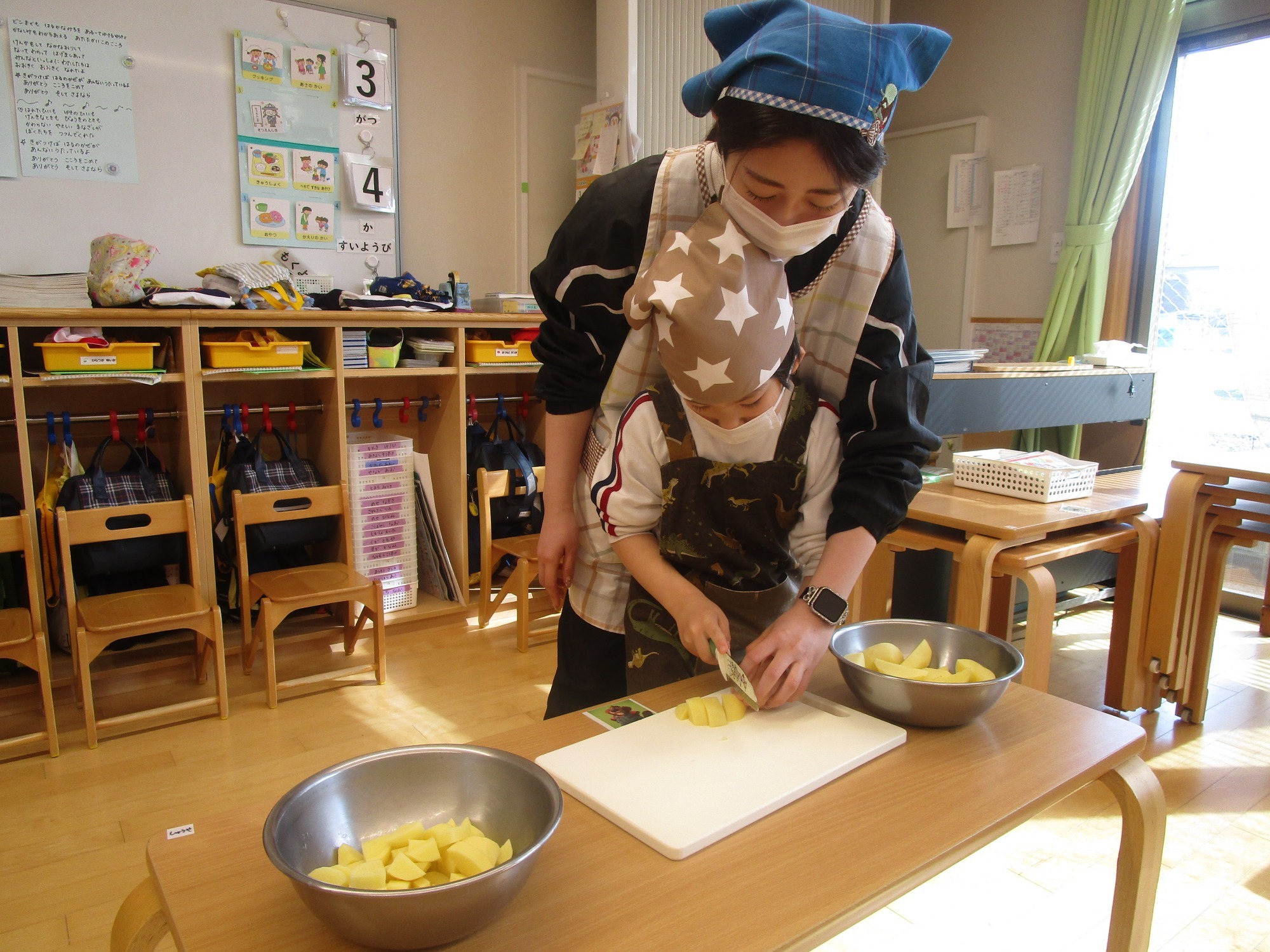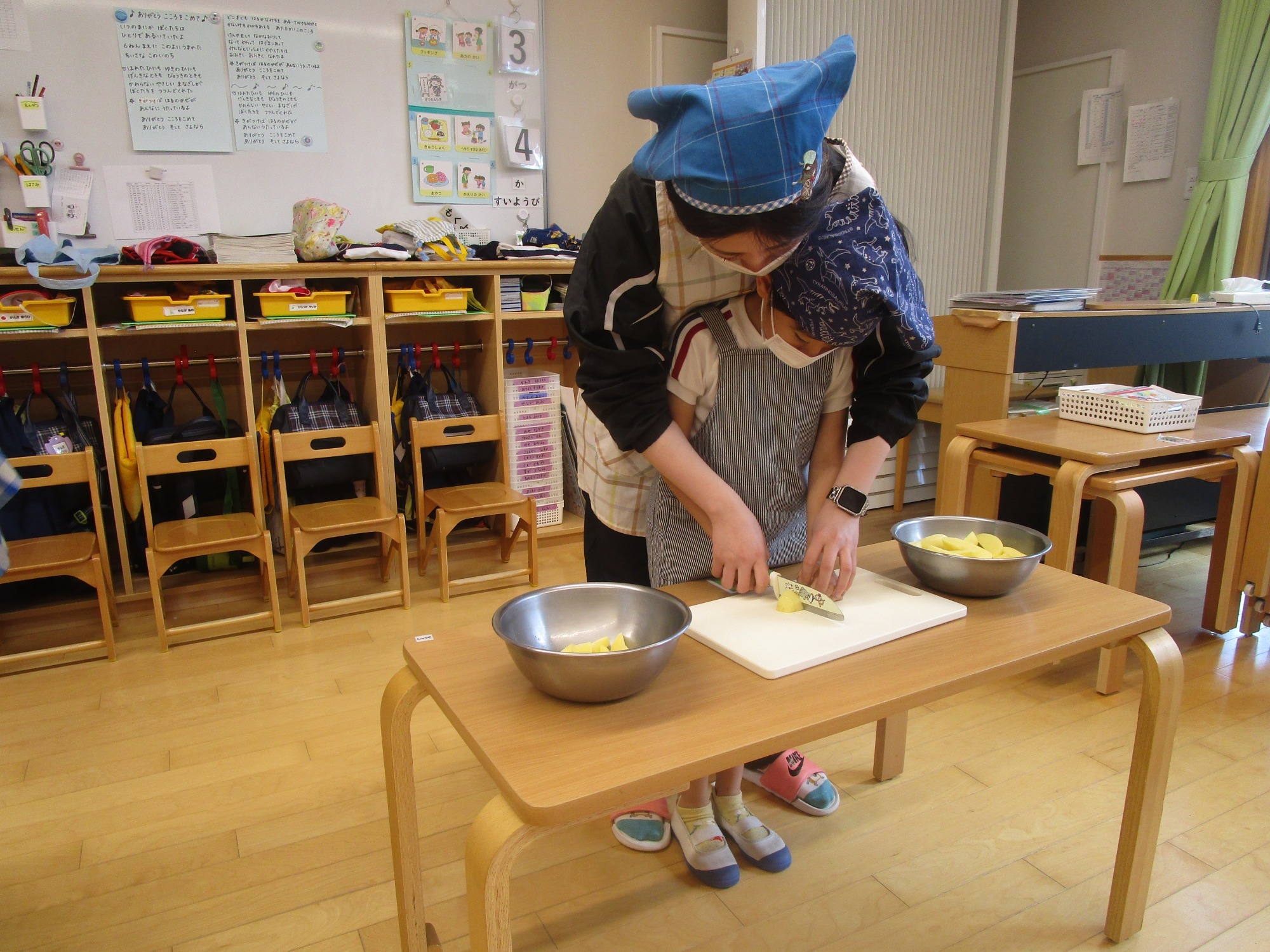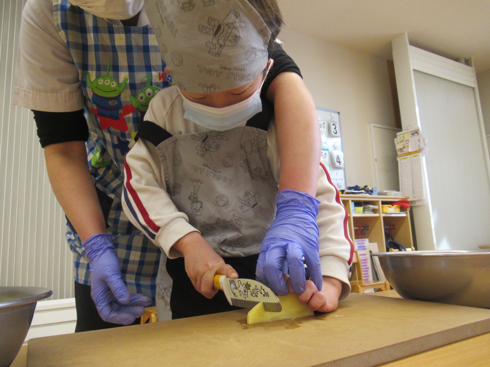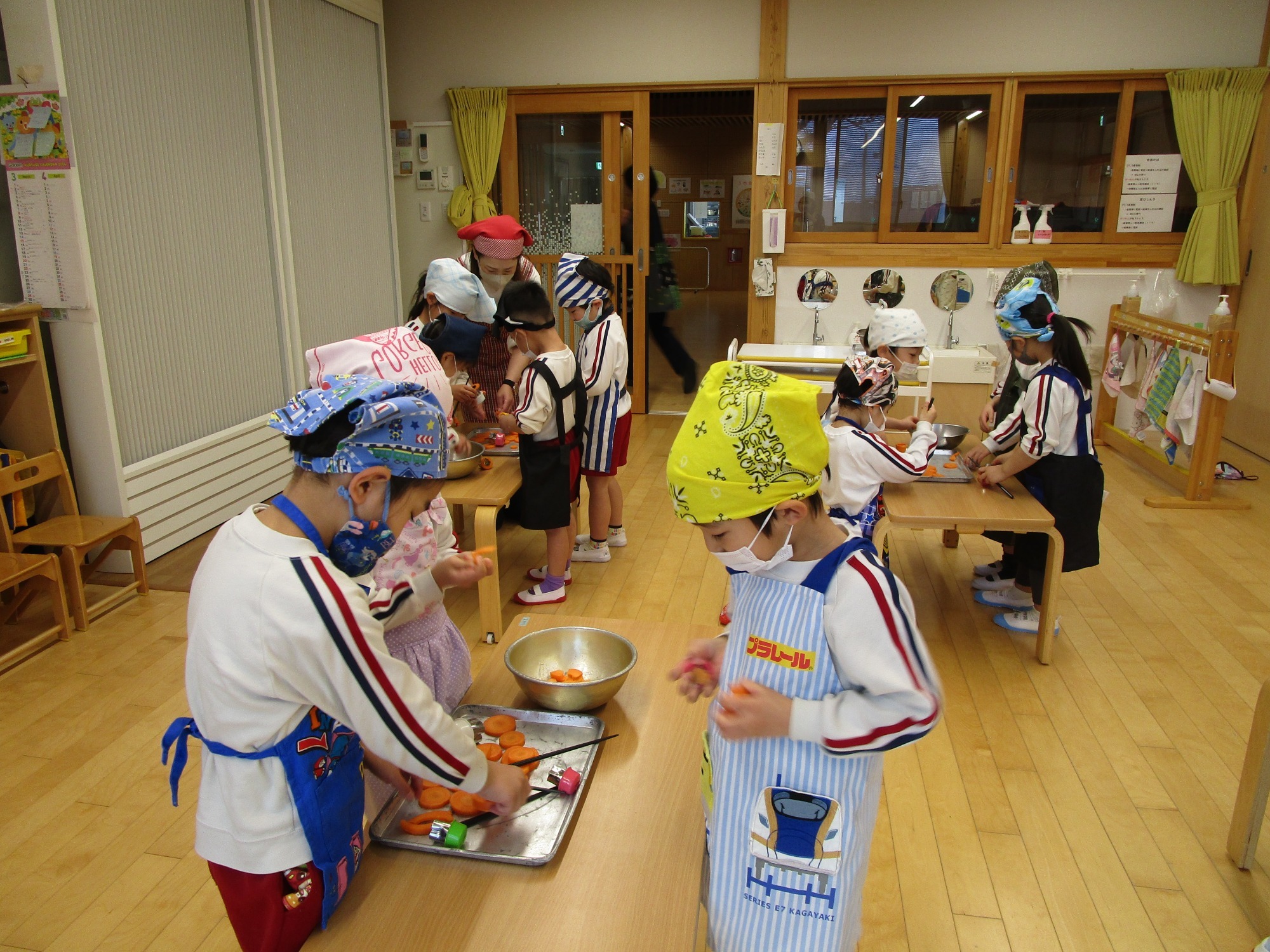 今日は、ほし組さんとつき組さんで「カレーの野菜切り」のクッキングをしました。