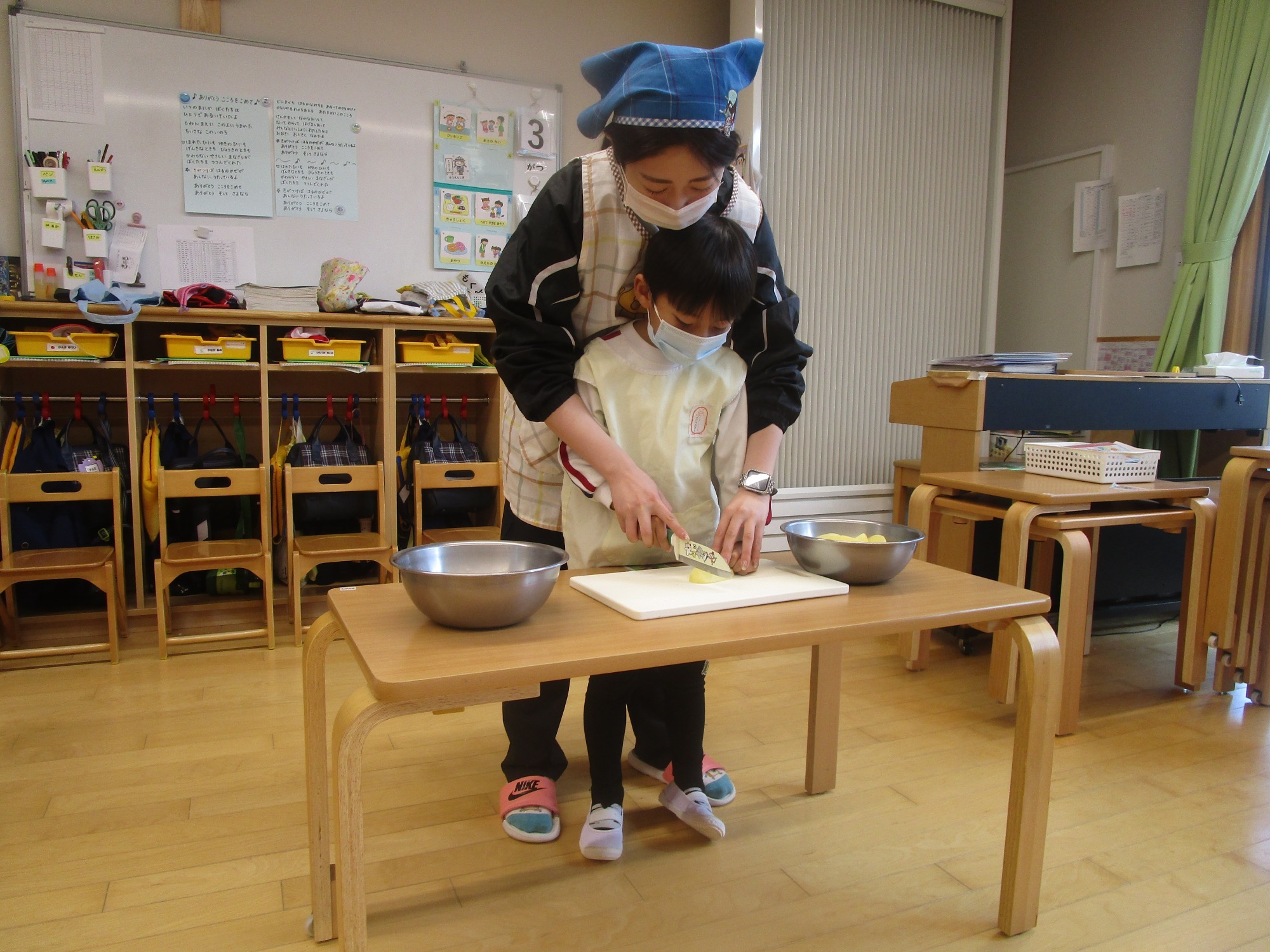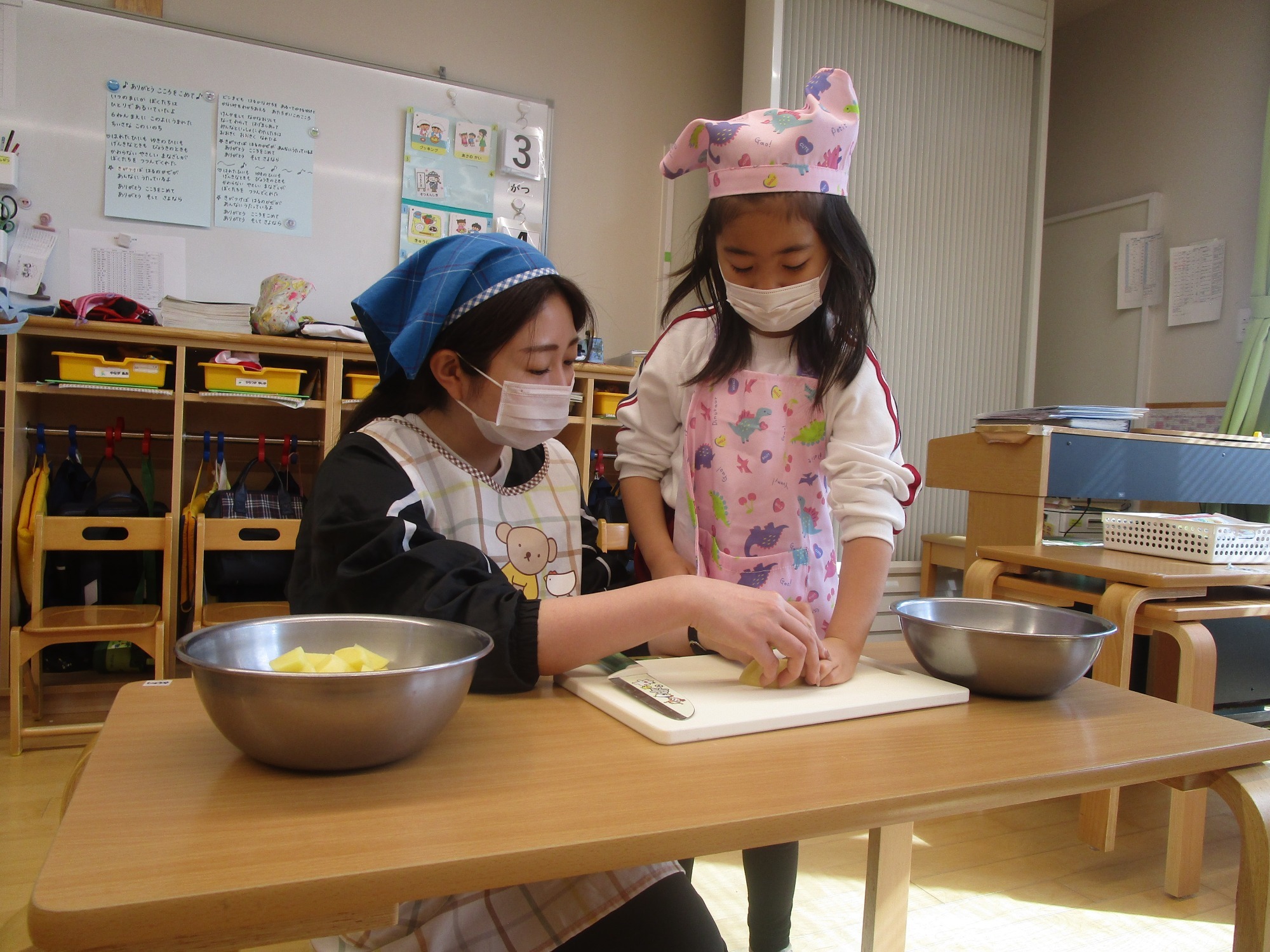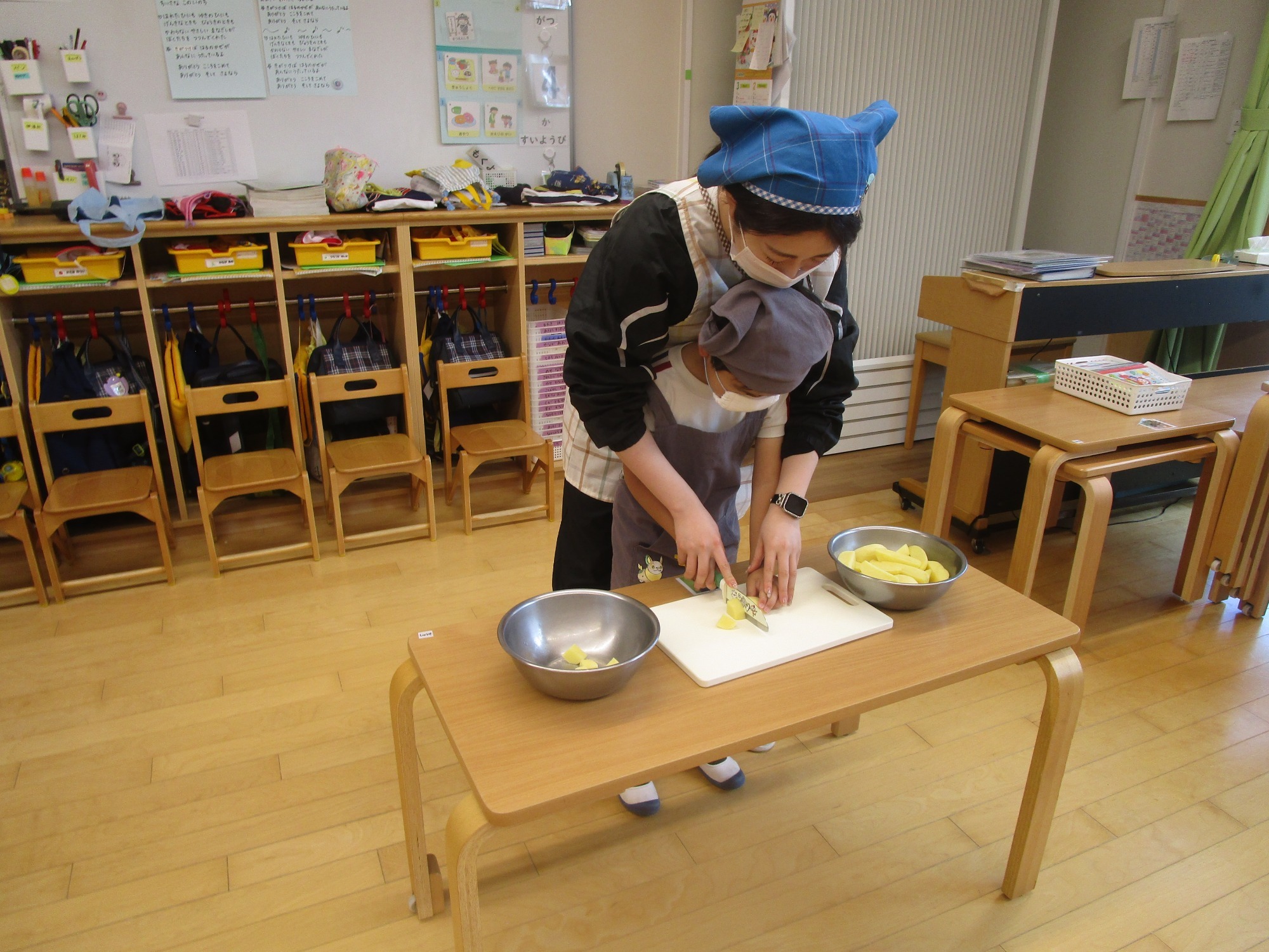 今日は、ほし組さんとつき組さんで「カレーの野菜切り」のクッキングをしました。