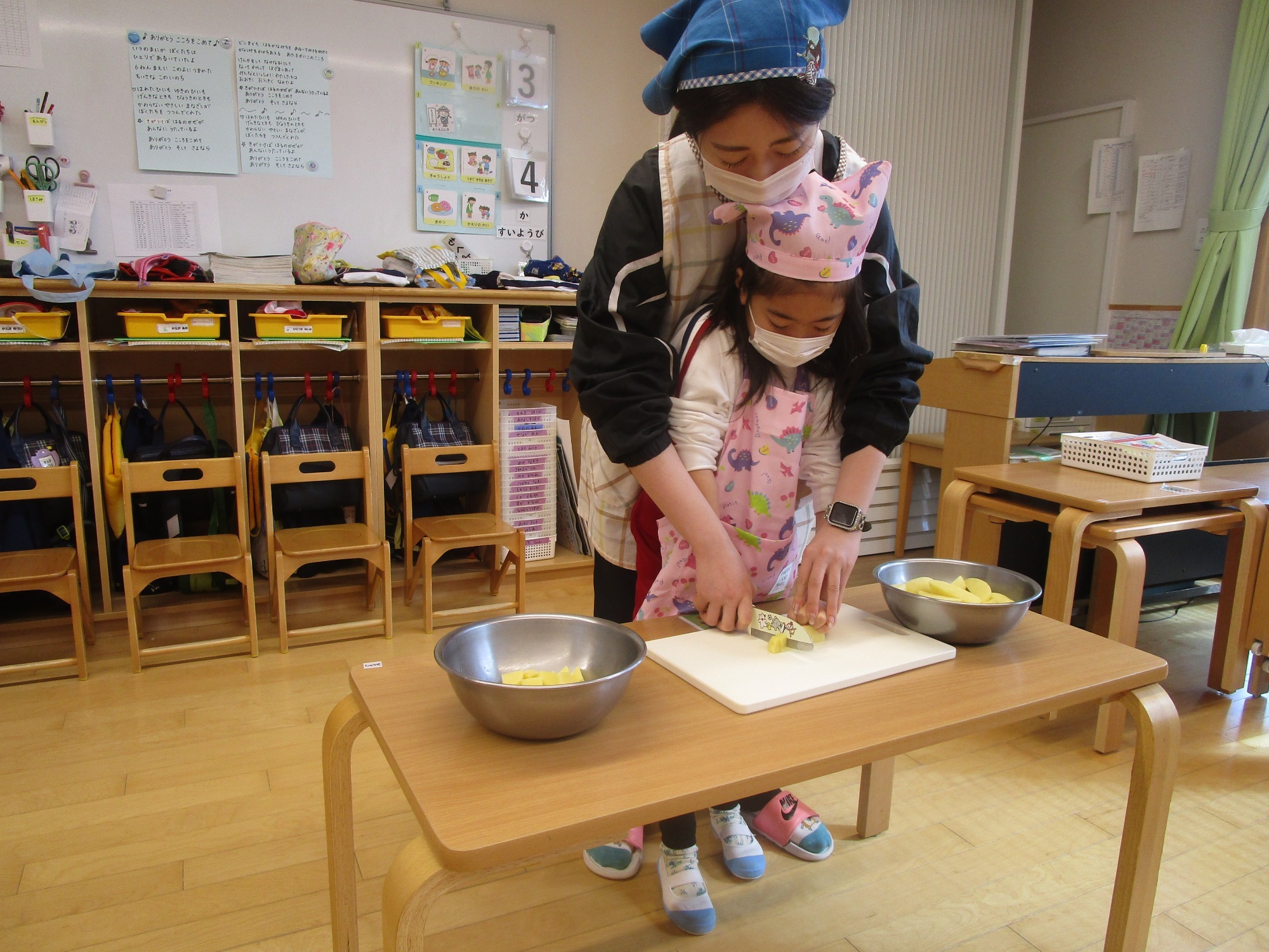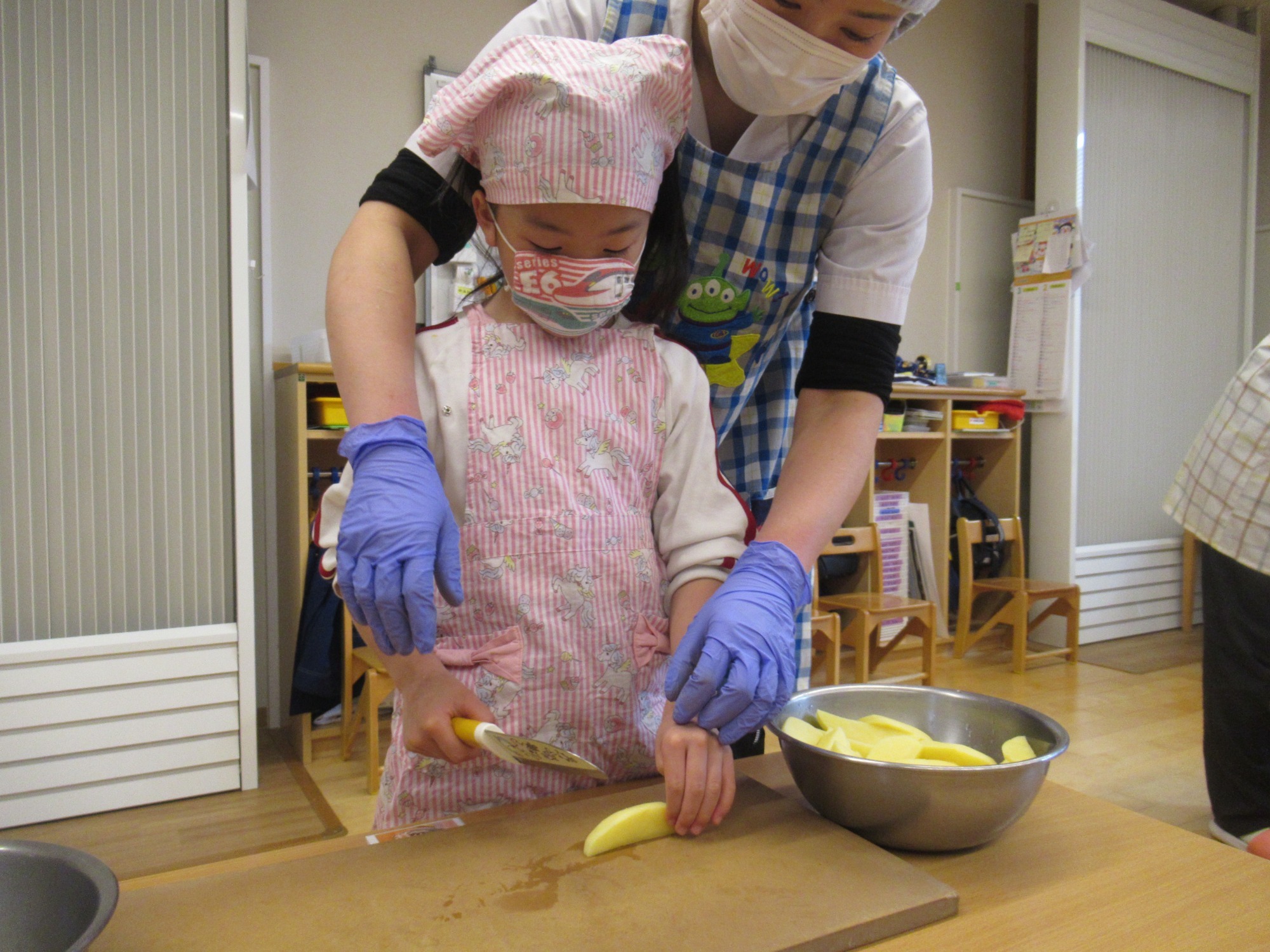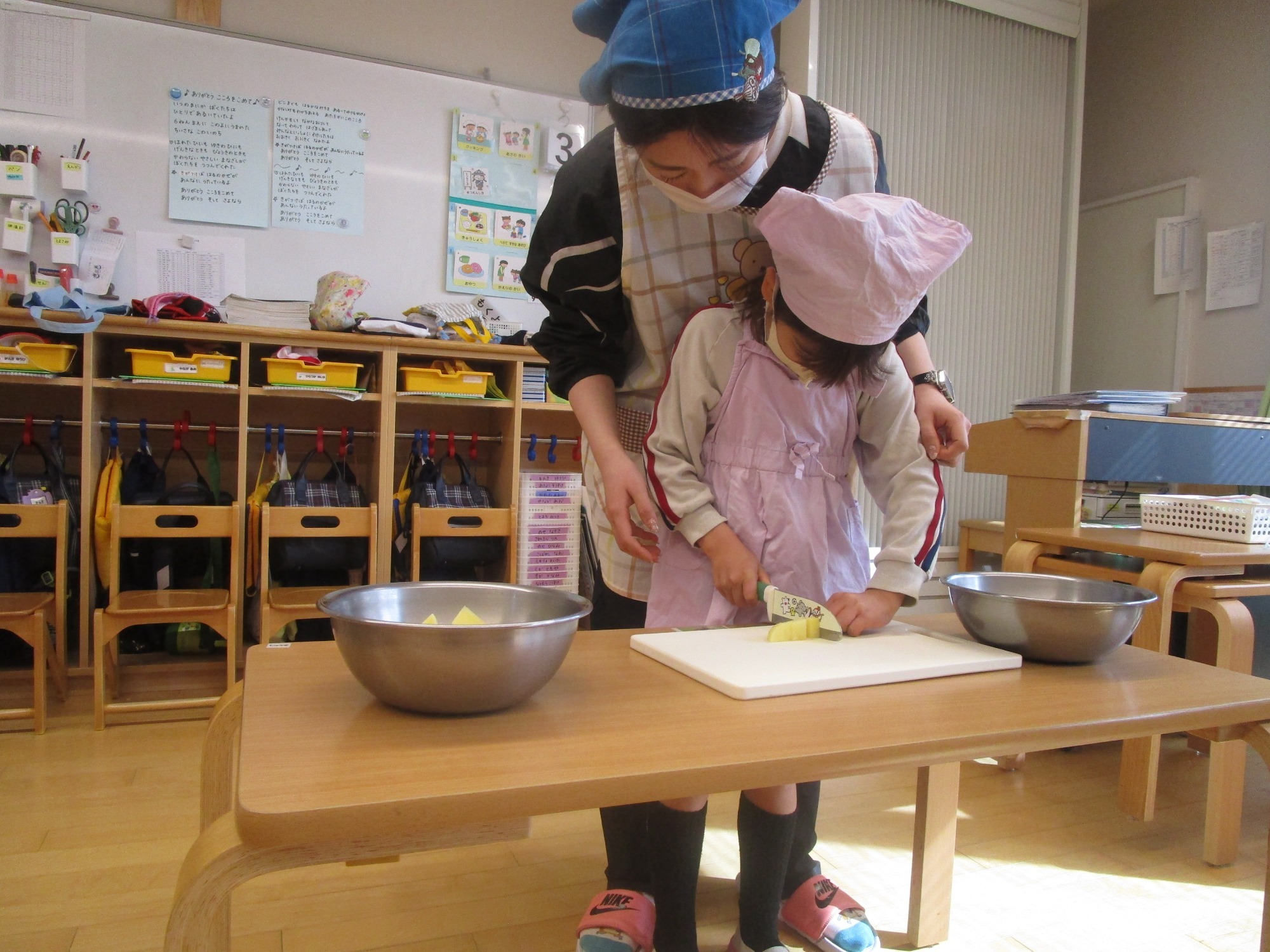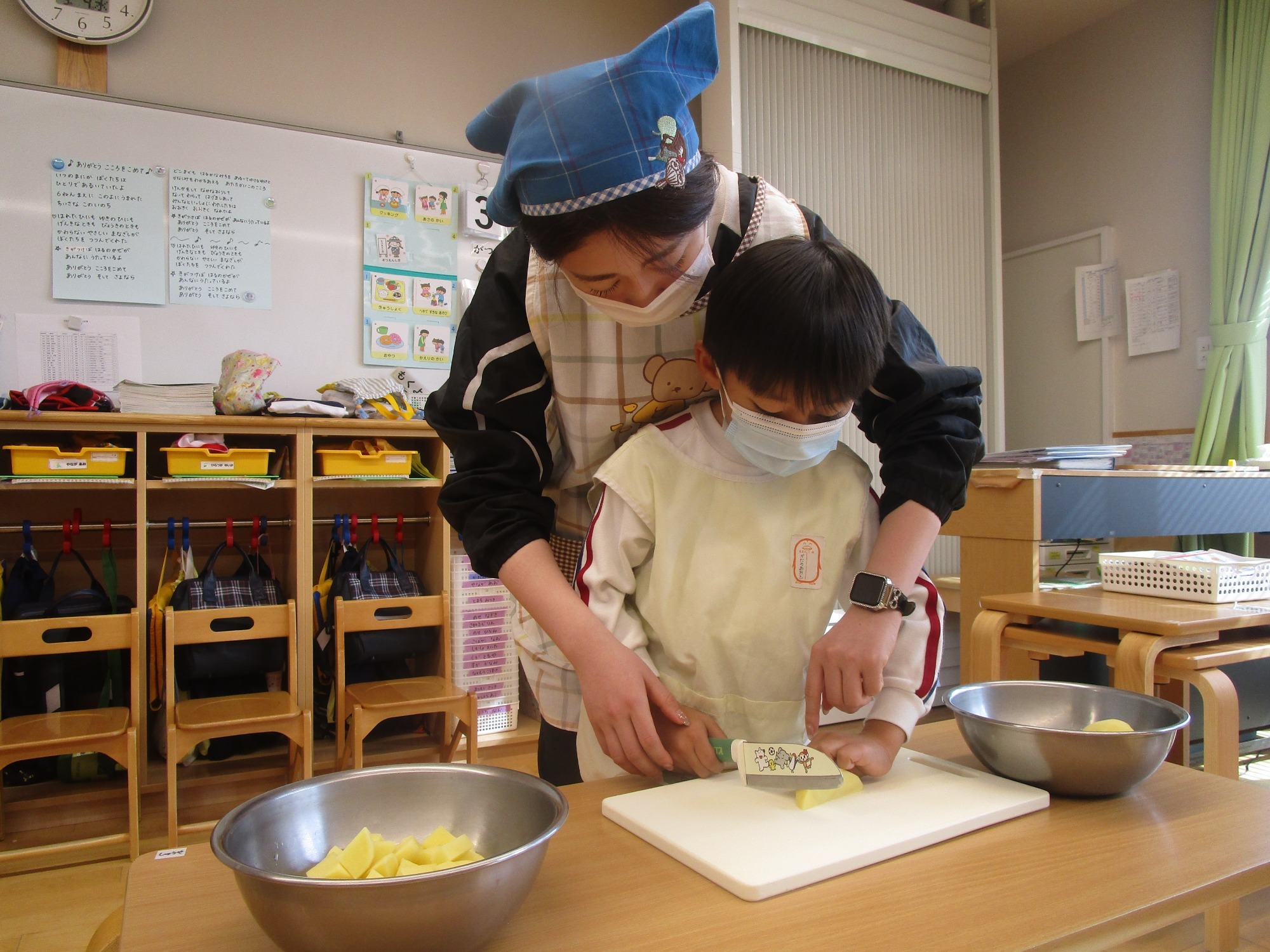 今日は、ほし組さんとつき組さんで「カレーの野菜切り」のクッキングをしました。