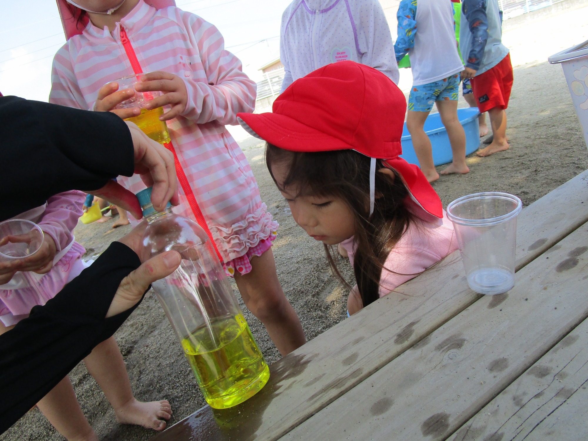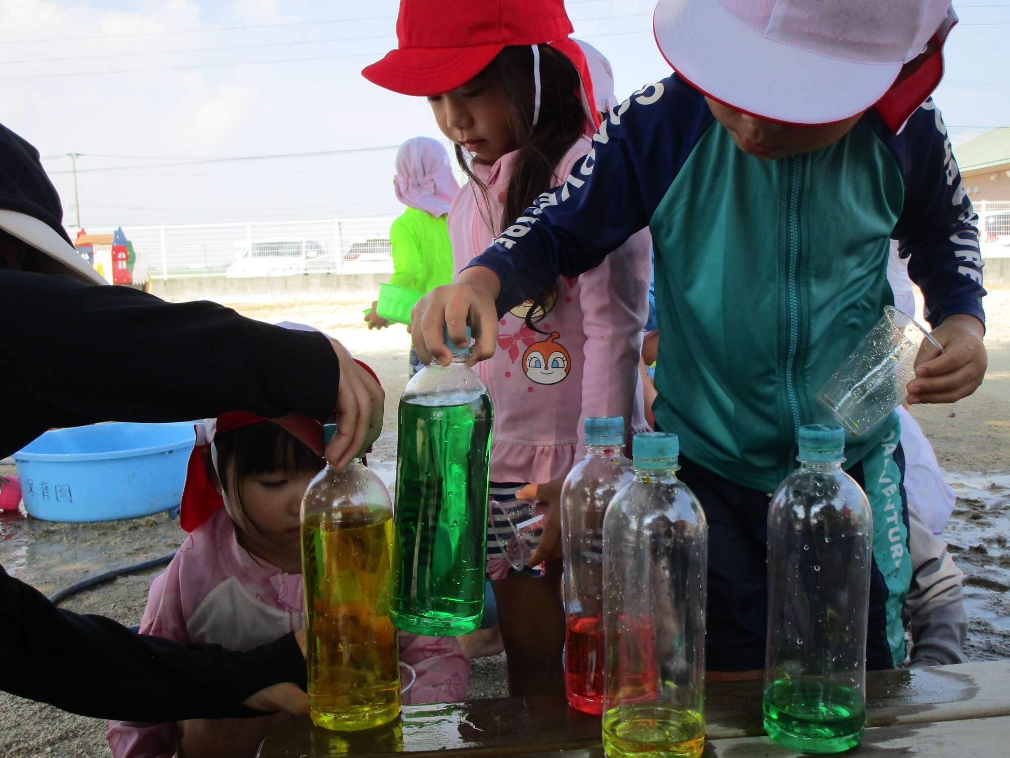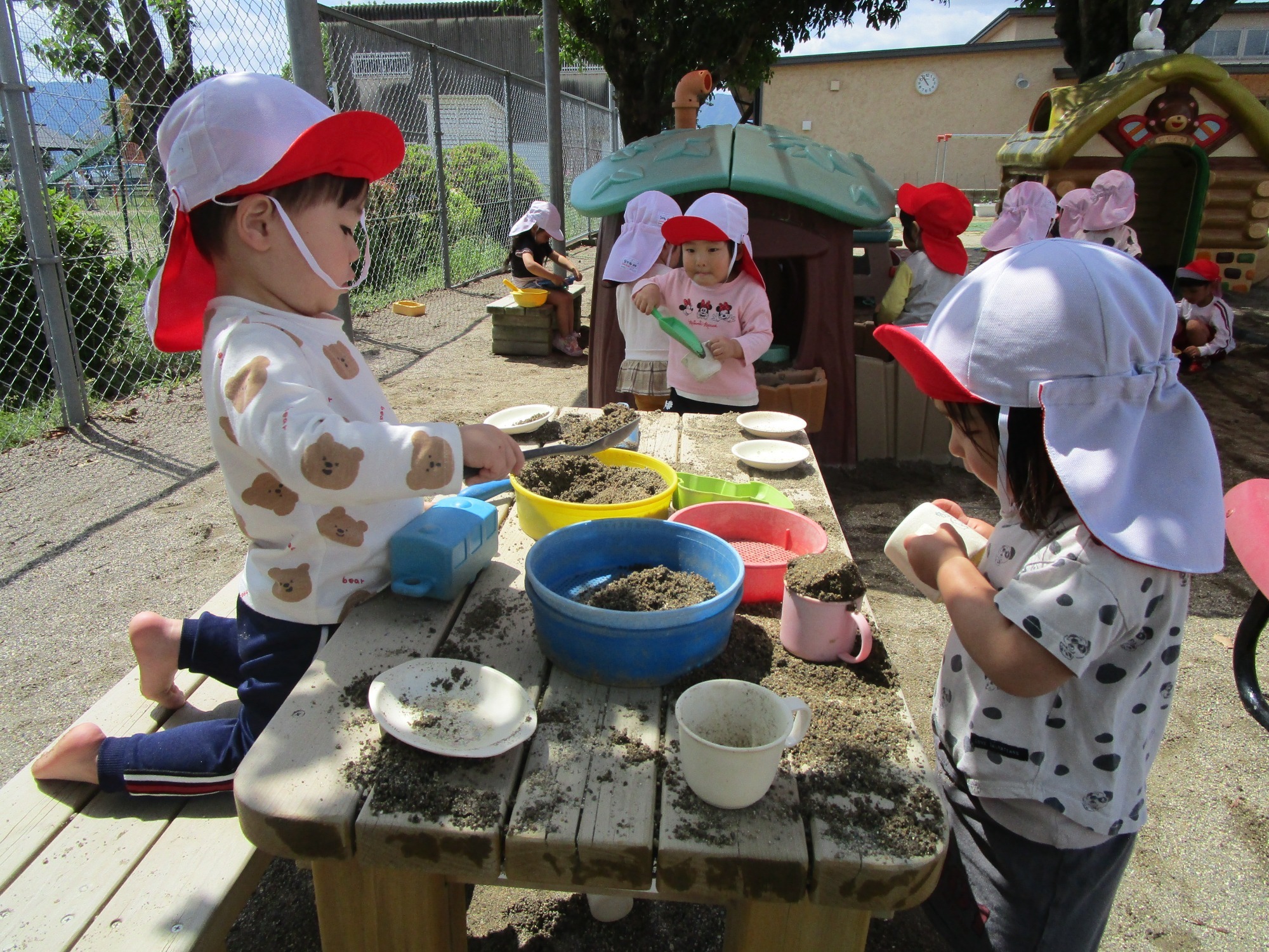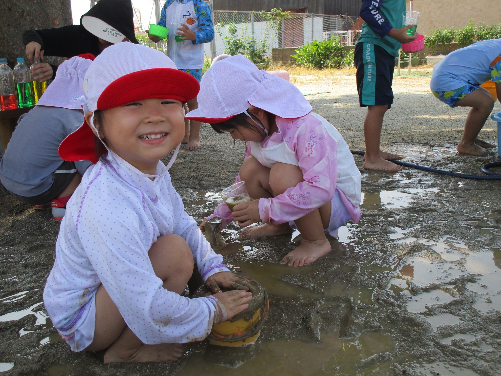 目を輝かせ「きれいね~」と色水あそびも泥あそびも気持ちいい~感触を楽しみながら夢中であそびました!!