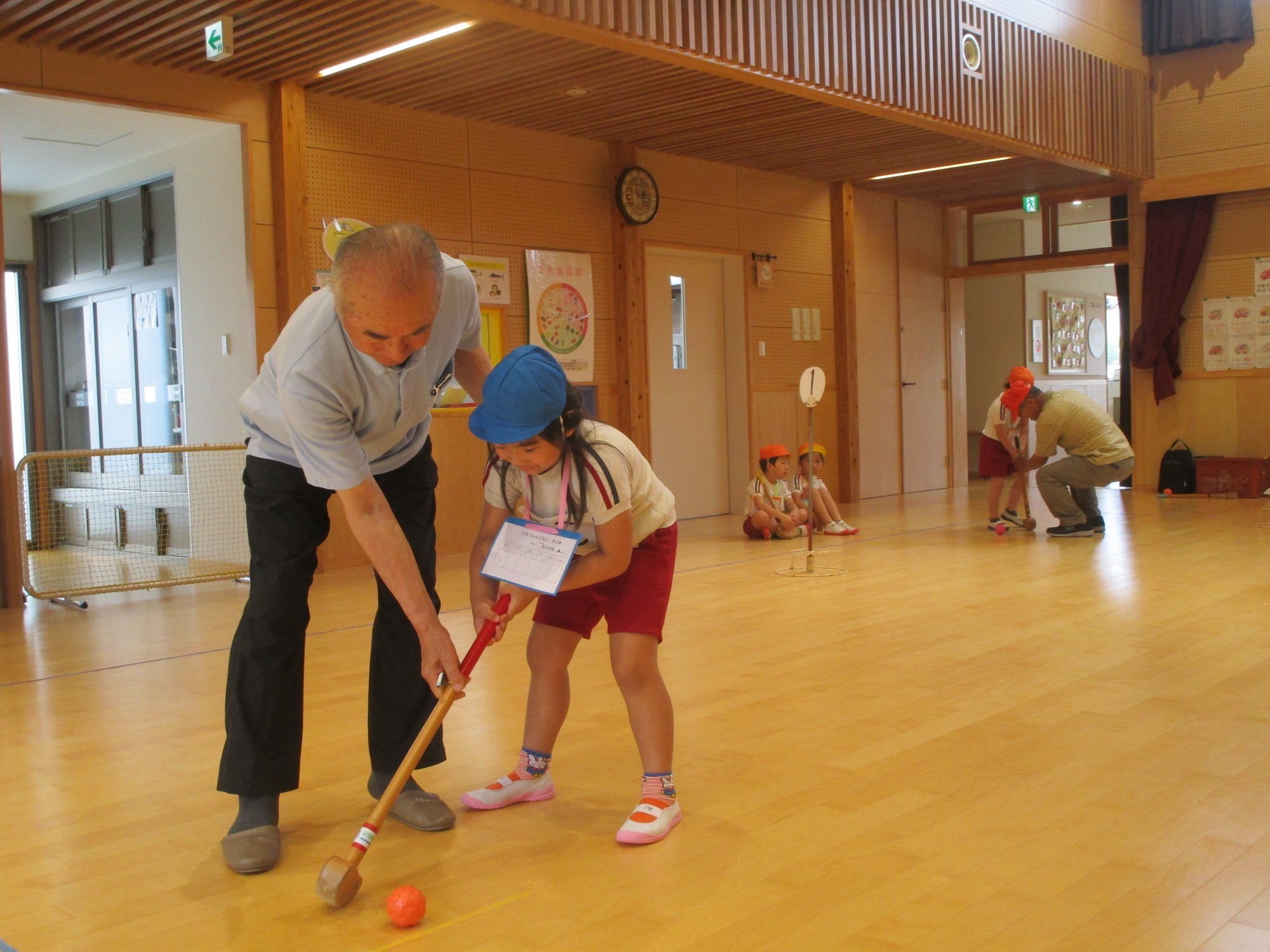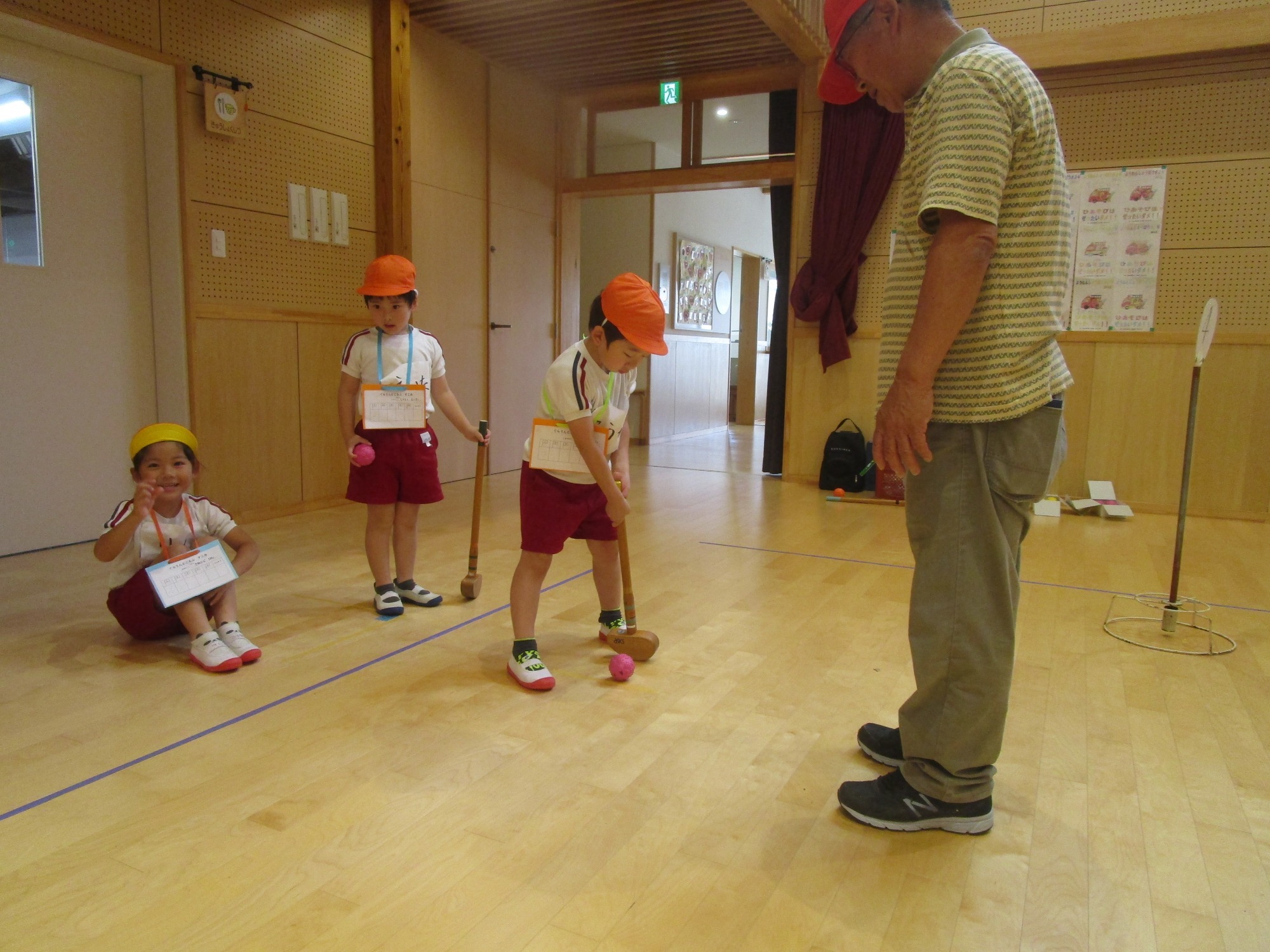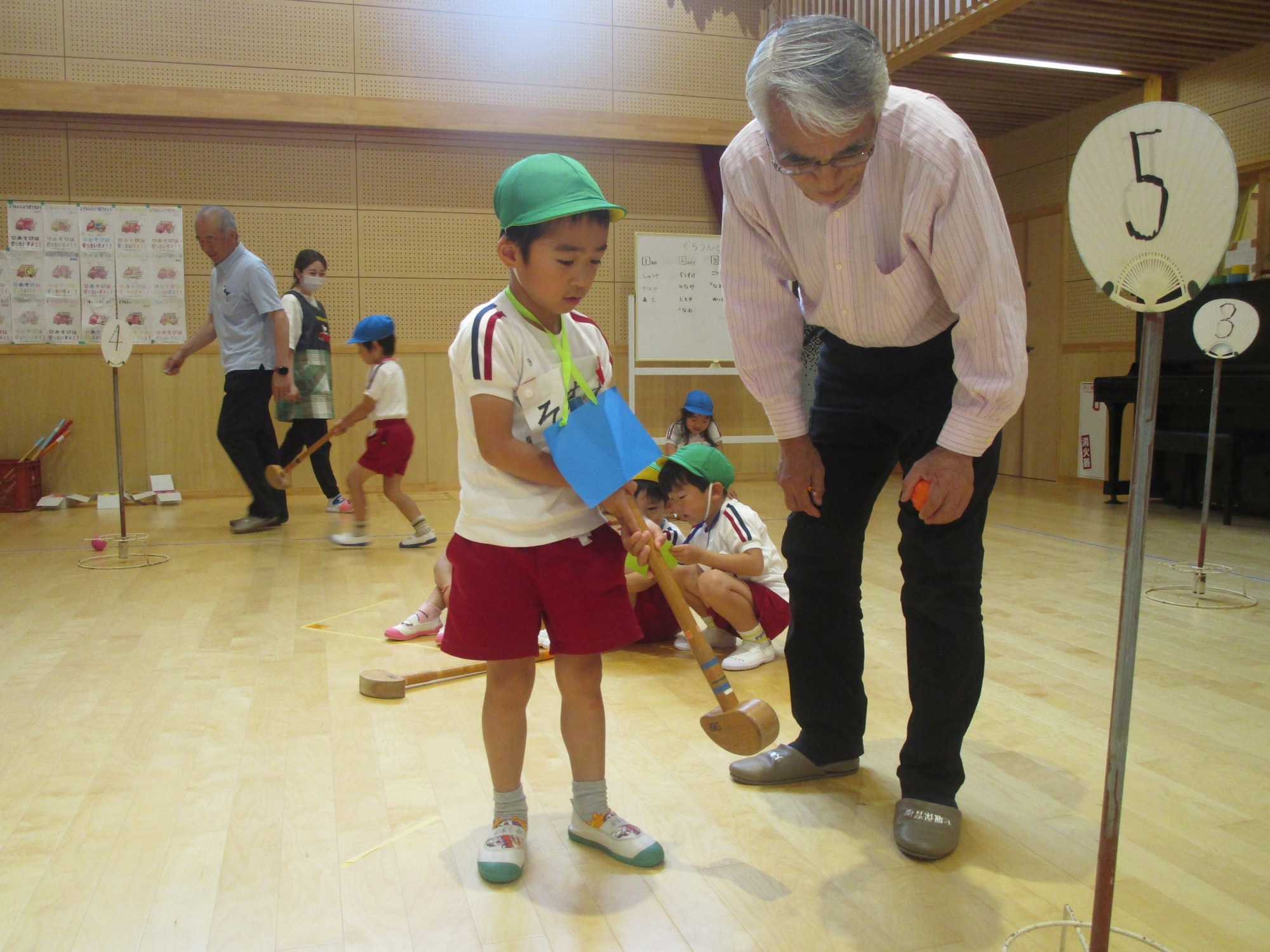 地域の方にクラブの持ち方や打ち方などを最初に教えて頂きました。5つのコースを順番に回っていきスコアをつけていきました。回数を重ねるごとにコツを掴む子どもたち。ホールインワンを達成する子どもも何人もいてとても盛り上がりました。初めてグランドゴルフを体験した子どもたちは楽しさのあまりにこのクラブ保育園にもほしいな~とつぶやいていましたよ😊