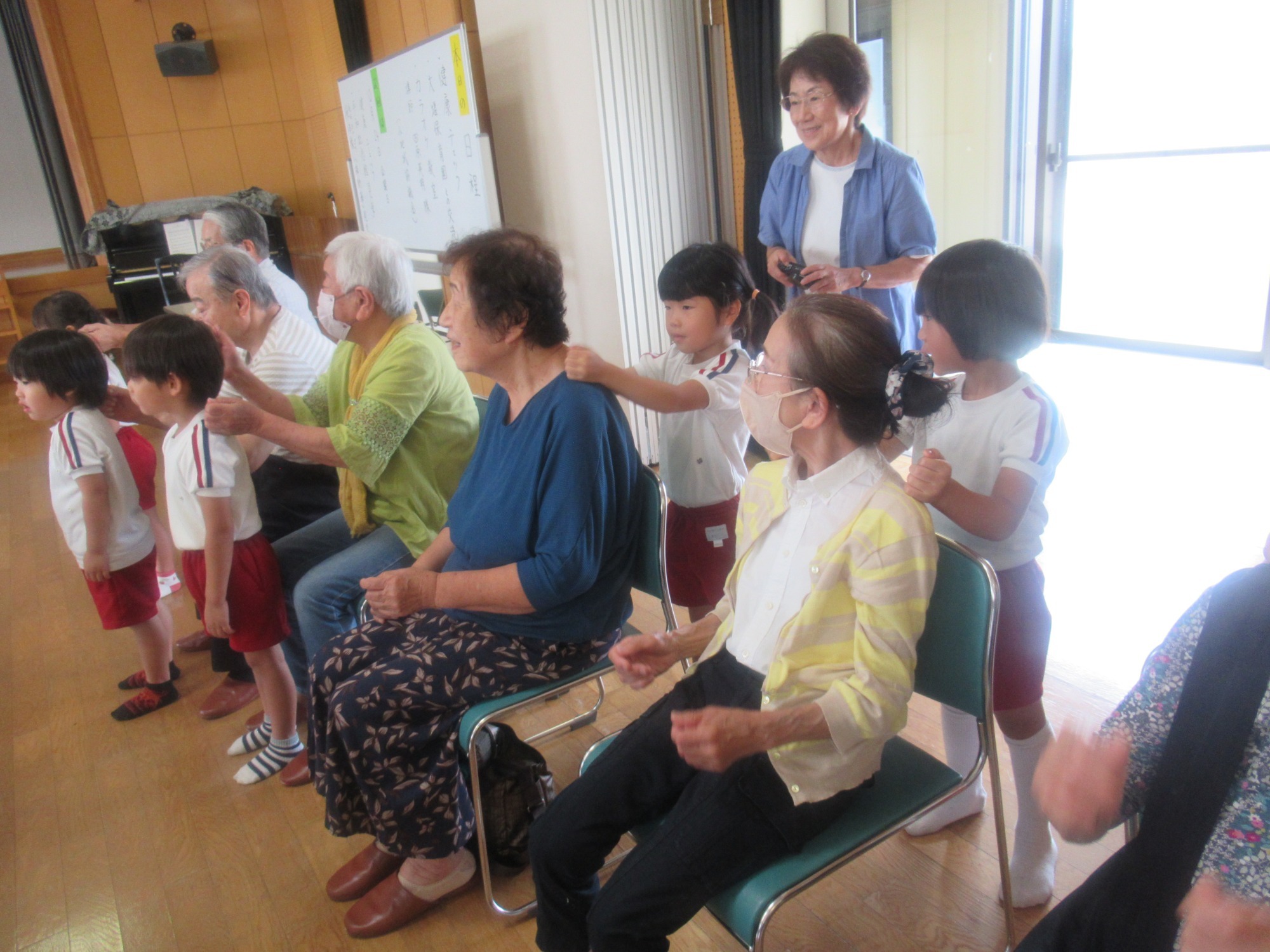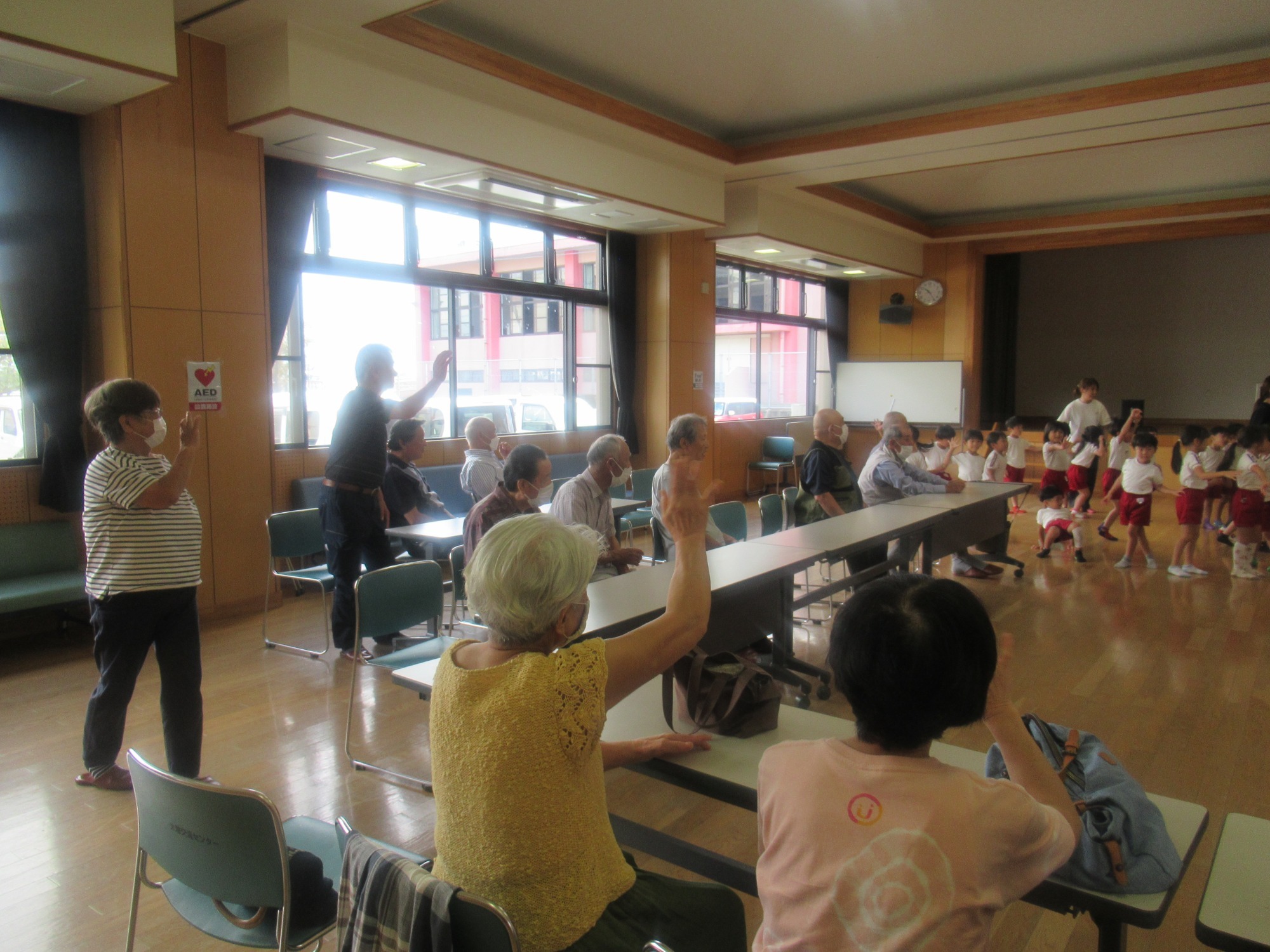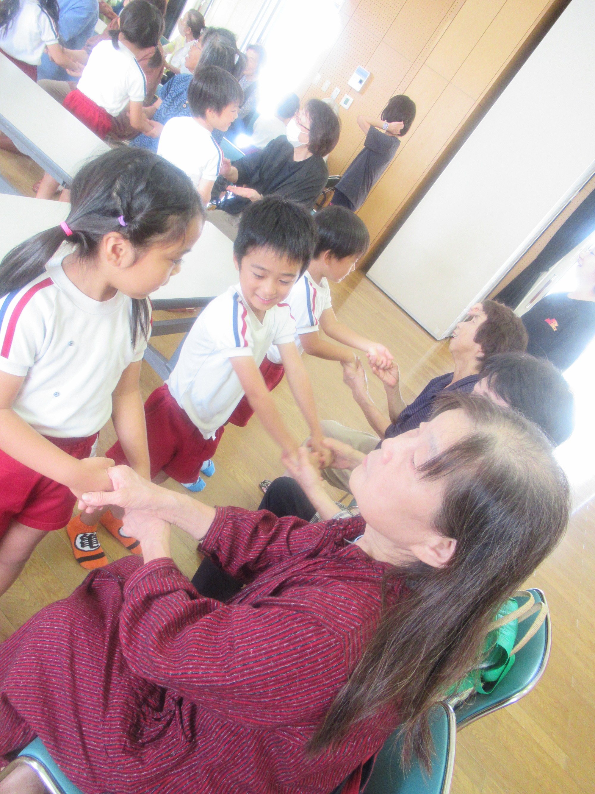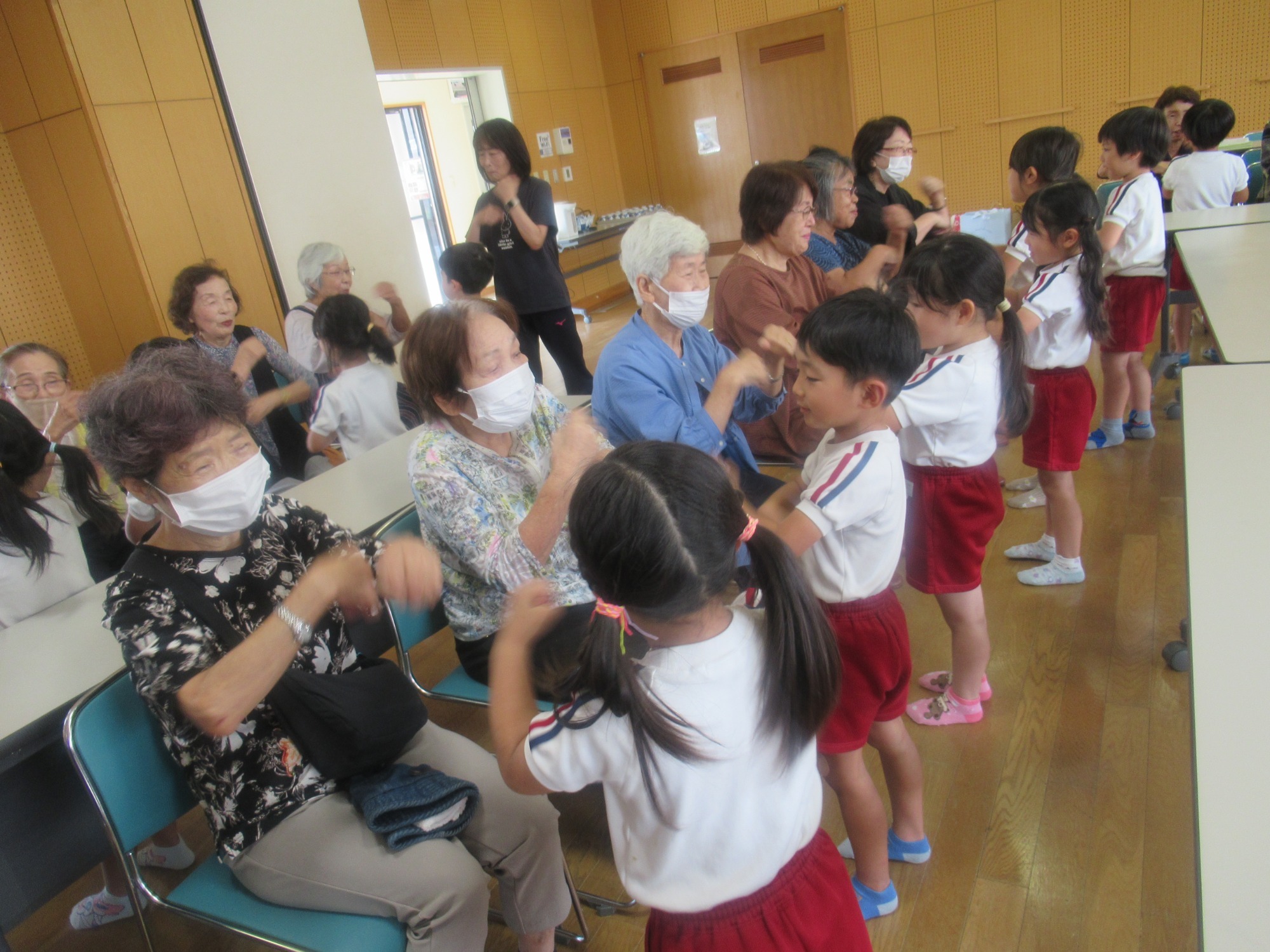 子どもたちは歌をうたったり、一緒に手遊びをしたり一緒に体を動かしたりしながら、たくさんのスキンシップをとることができました。初めは緊張もあるかなと思っていましたが、積極的に話をして笑顔で接する子どもたち。その姿に地域の方々も「かわいいね」「元気をもらったよ」とにこにこ笑顔。会場全体があたたかい雰囲気に包まれました。