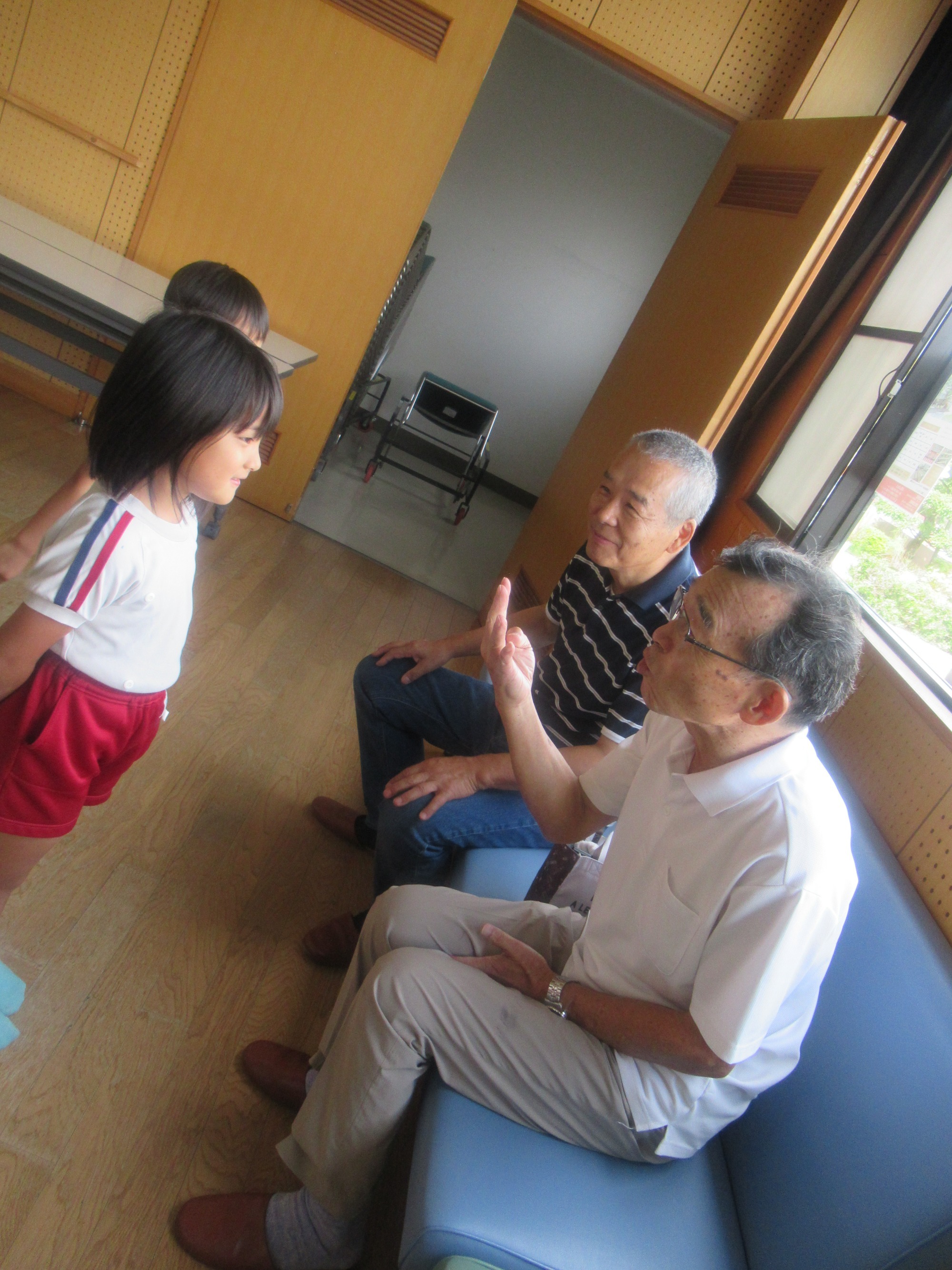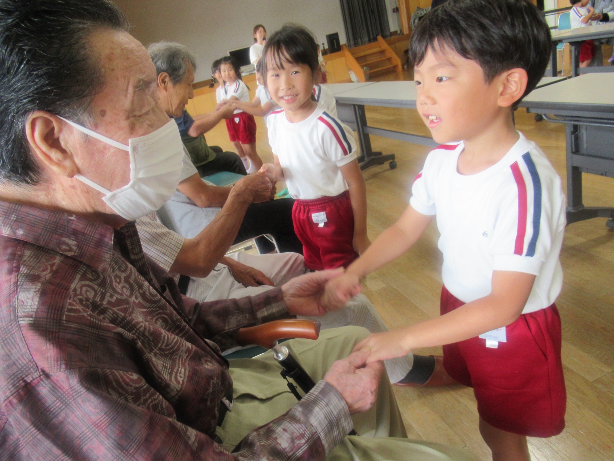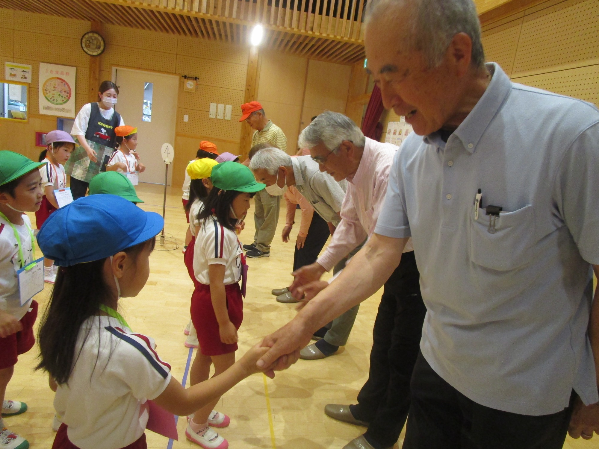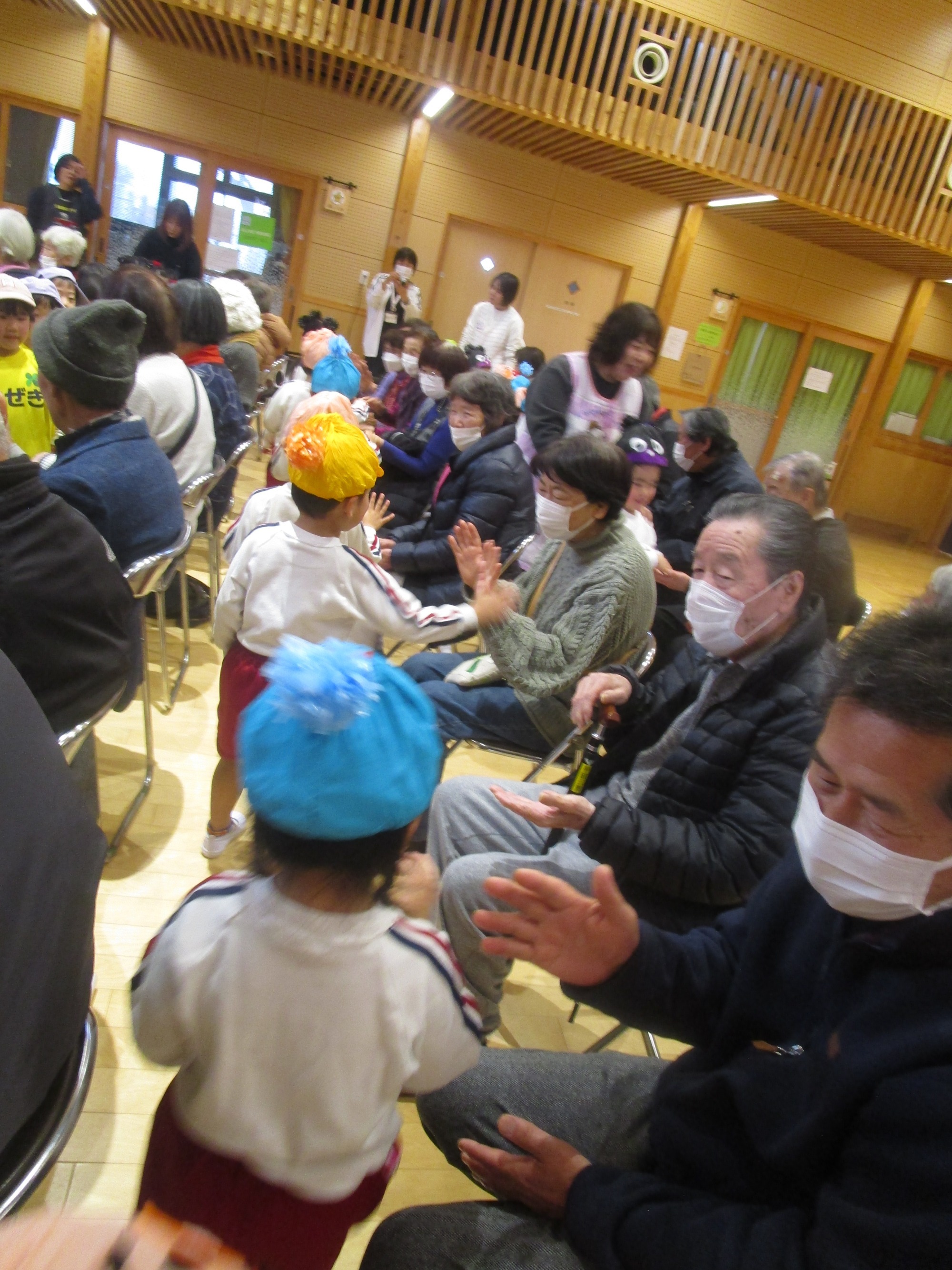 子どもたちは歌をうたったり、一緒に手遊びをしたり一緒に体を動かしたりしながら、たくさんのスキンシップをとることができました。初めは緊張もあるかなと思っていましたが、積極的に話をして笑顔で接する子どもたち。その姿に地域の方々も「かわいいね」「元気をもらったよ」とにこにこ笑顔。会場全体があたたかい雰囲気に包まれました。