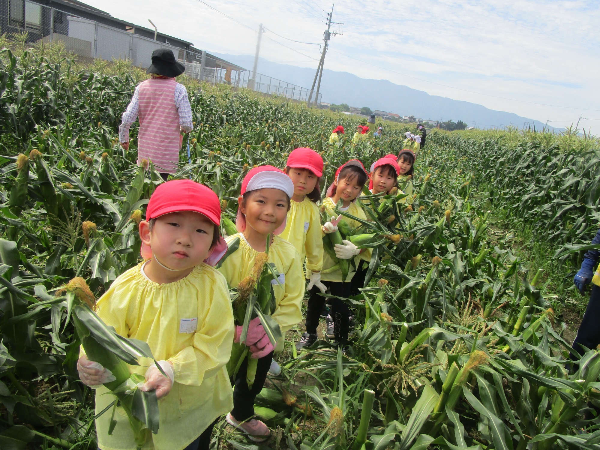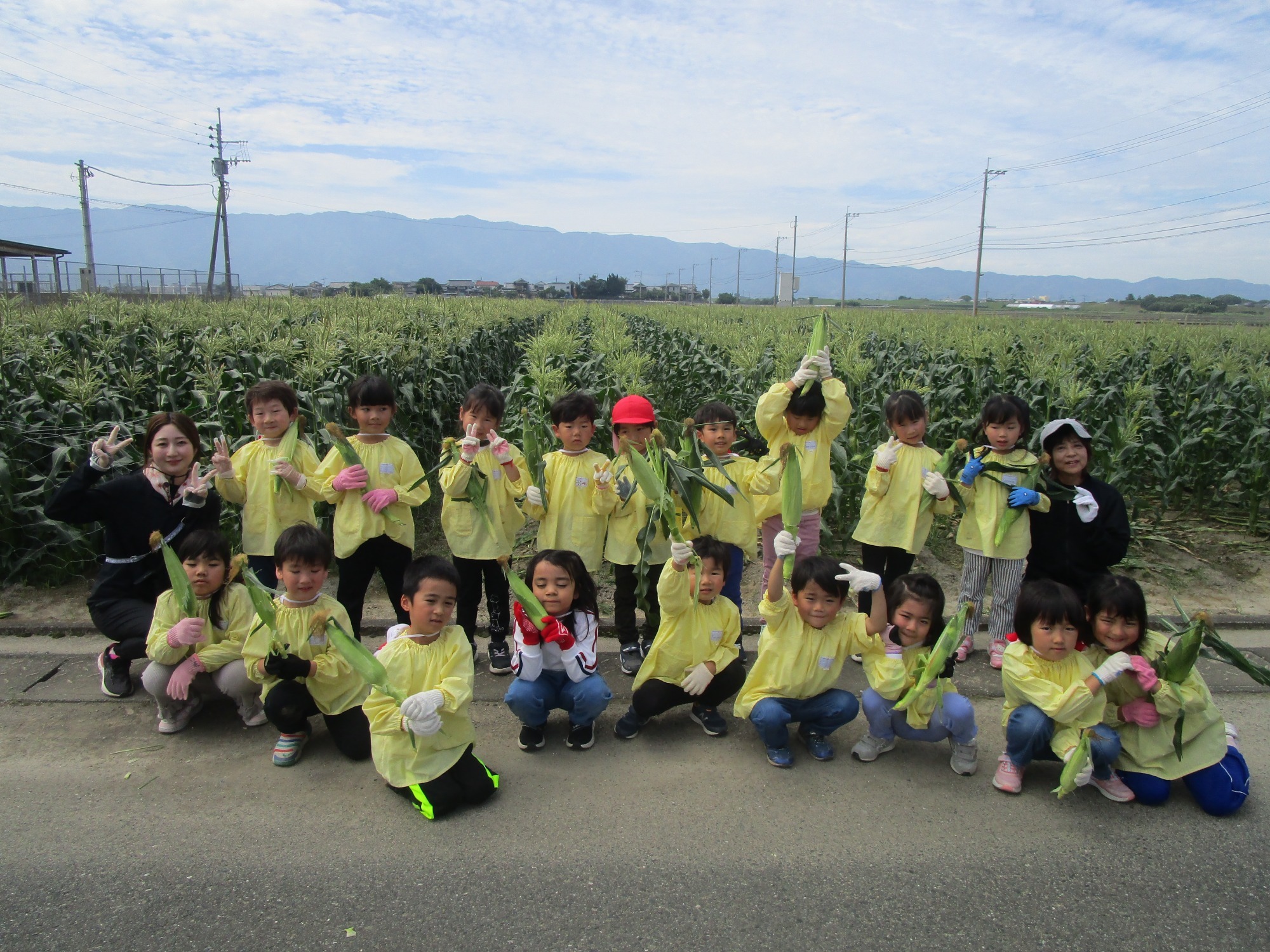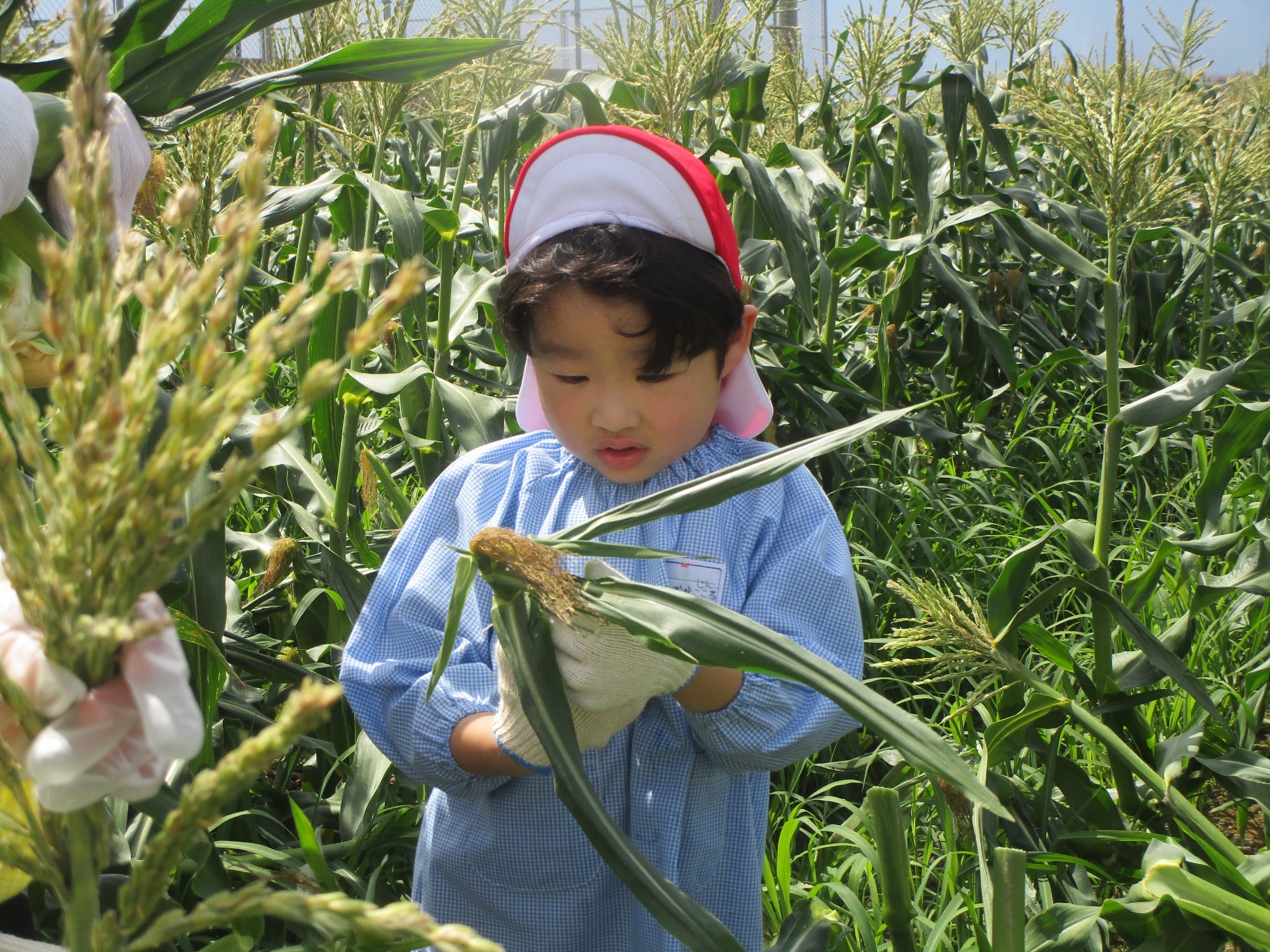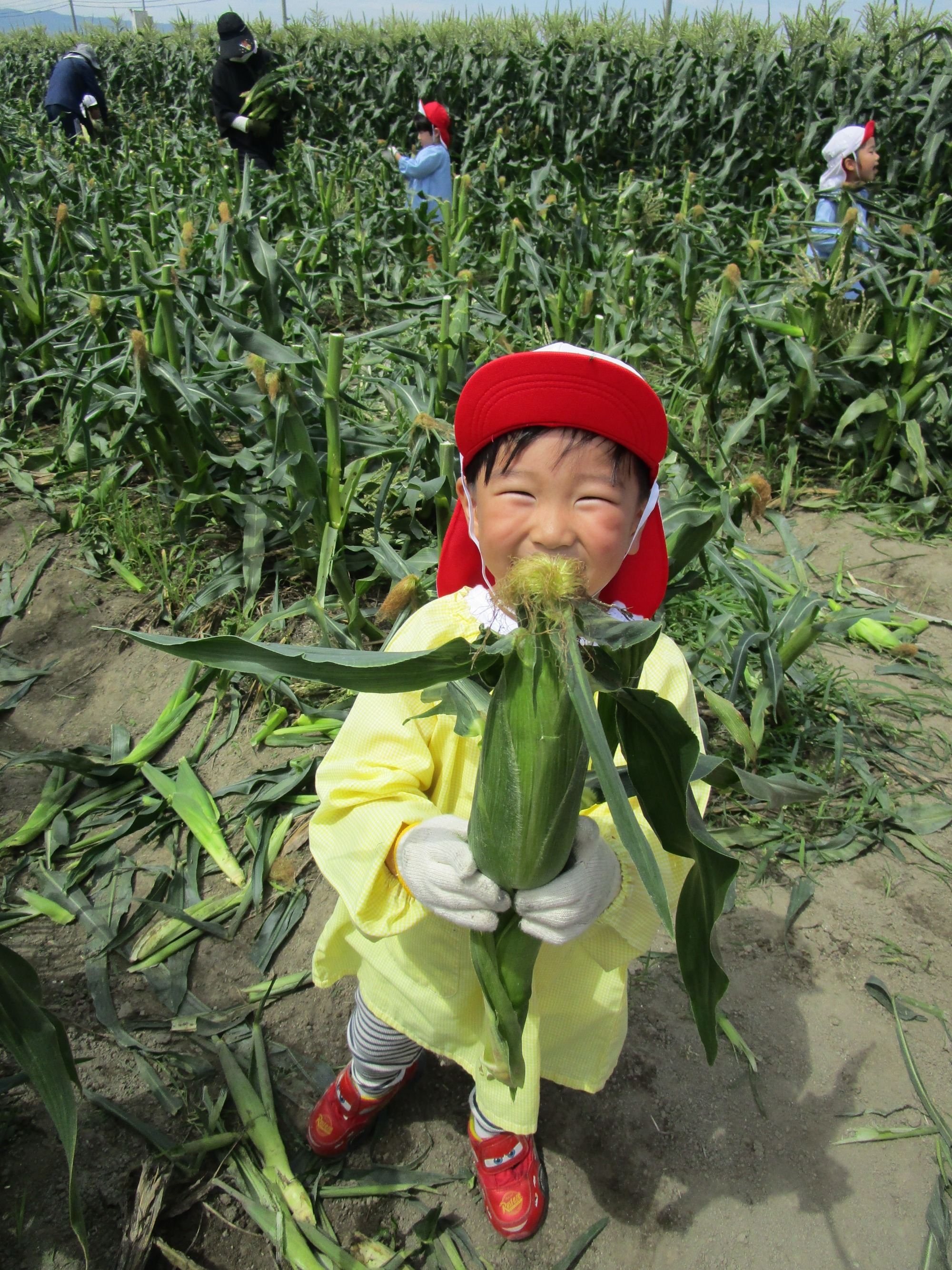 園児のおじいちゃんのご厚意で楽しくトウモロコシ狩りに挑戦!