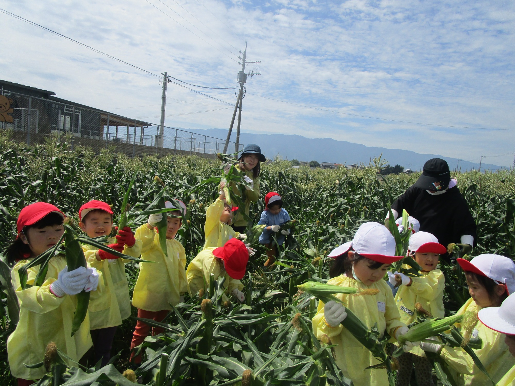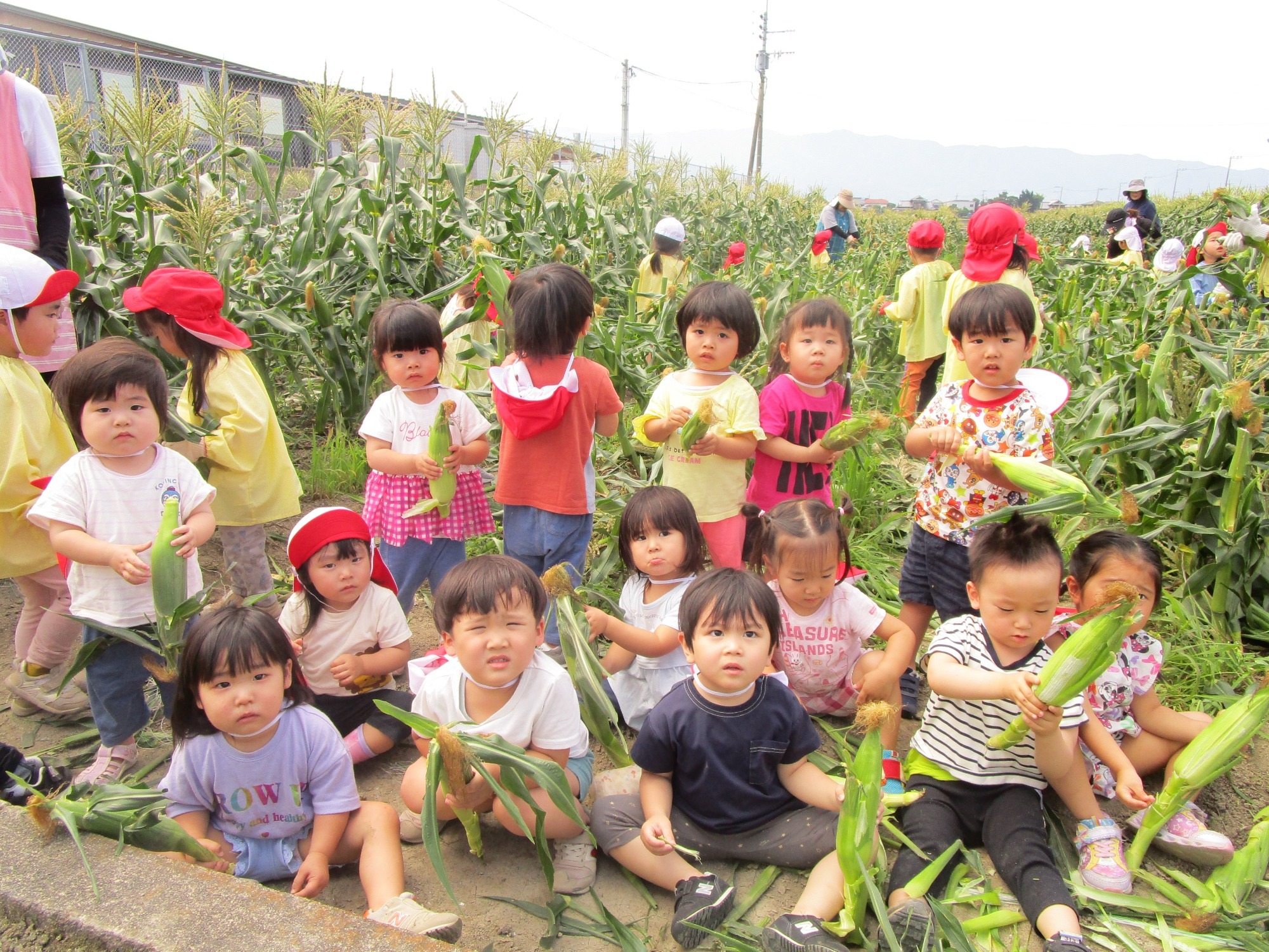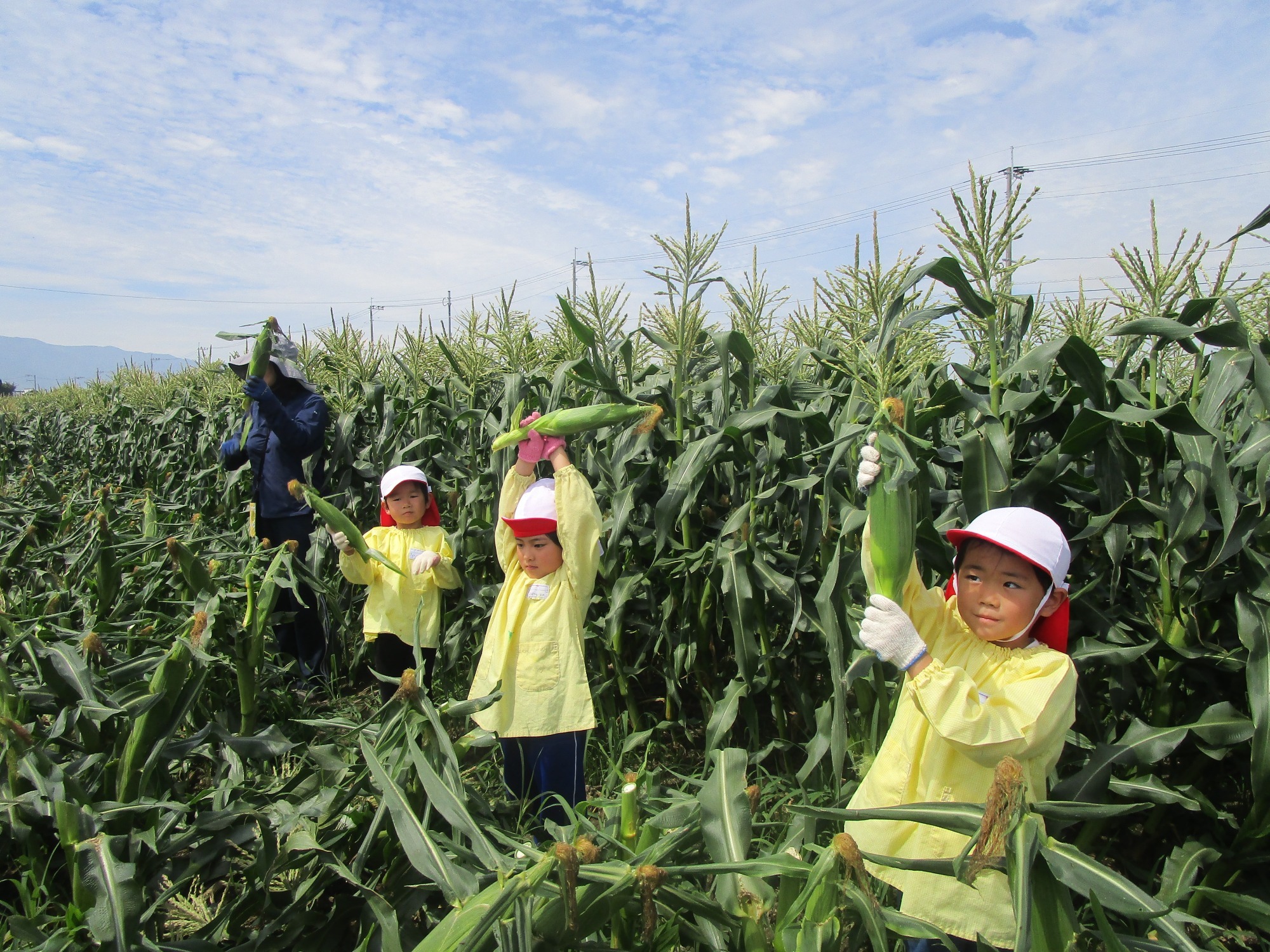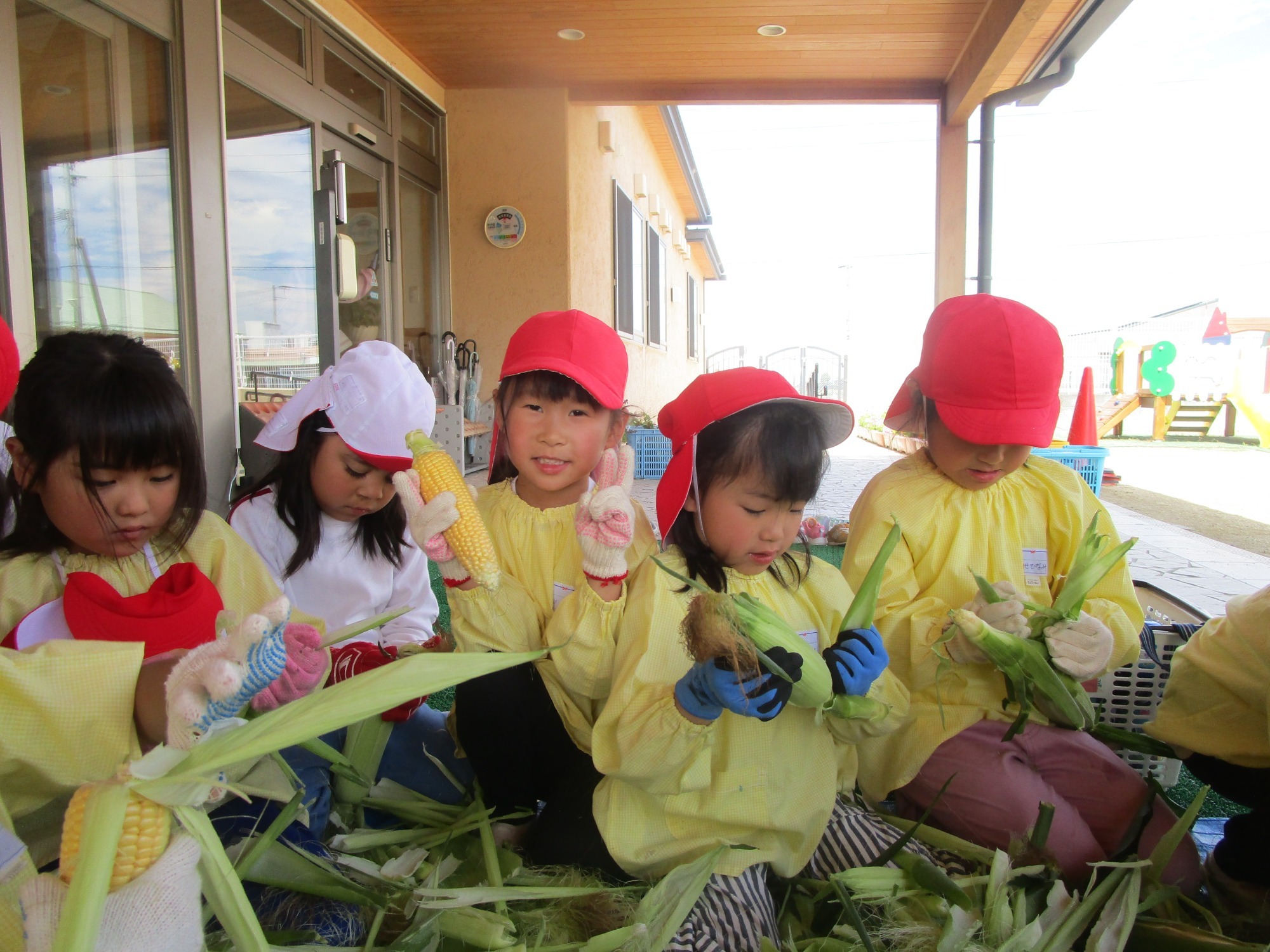 園児のおじいちゃんのご厚意で楽しくトウモロコシ狩りに挑戦!