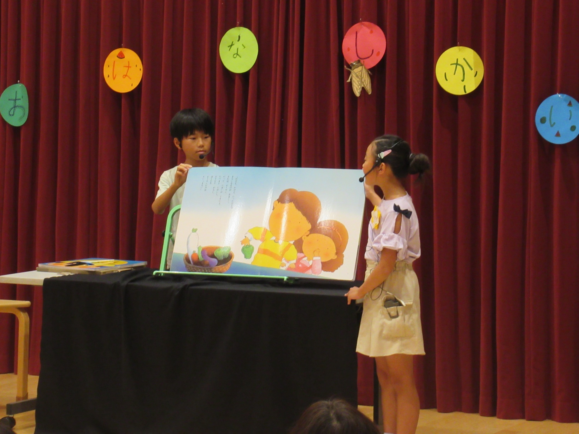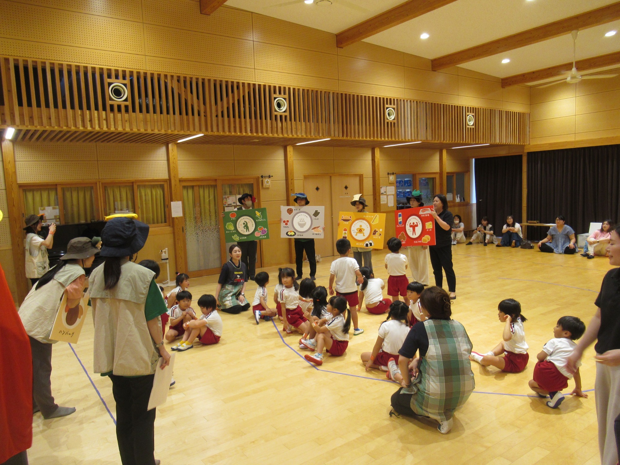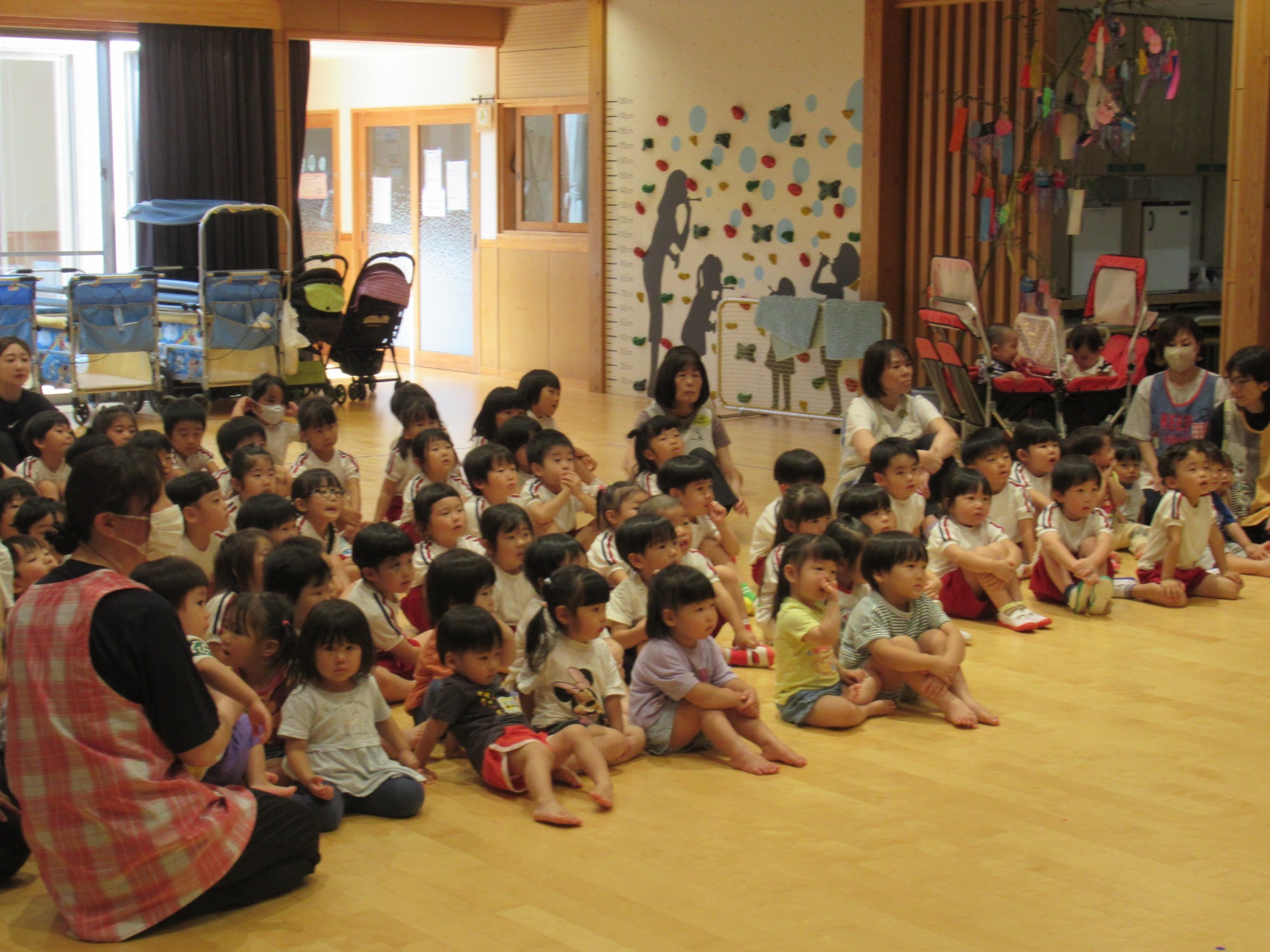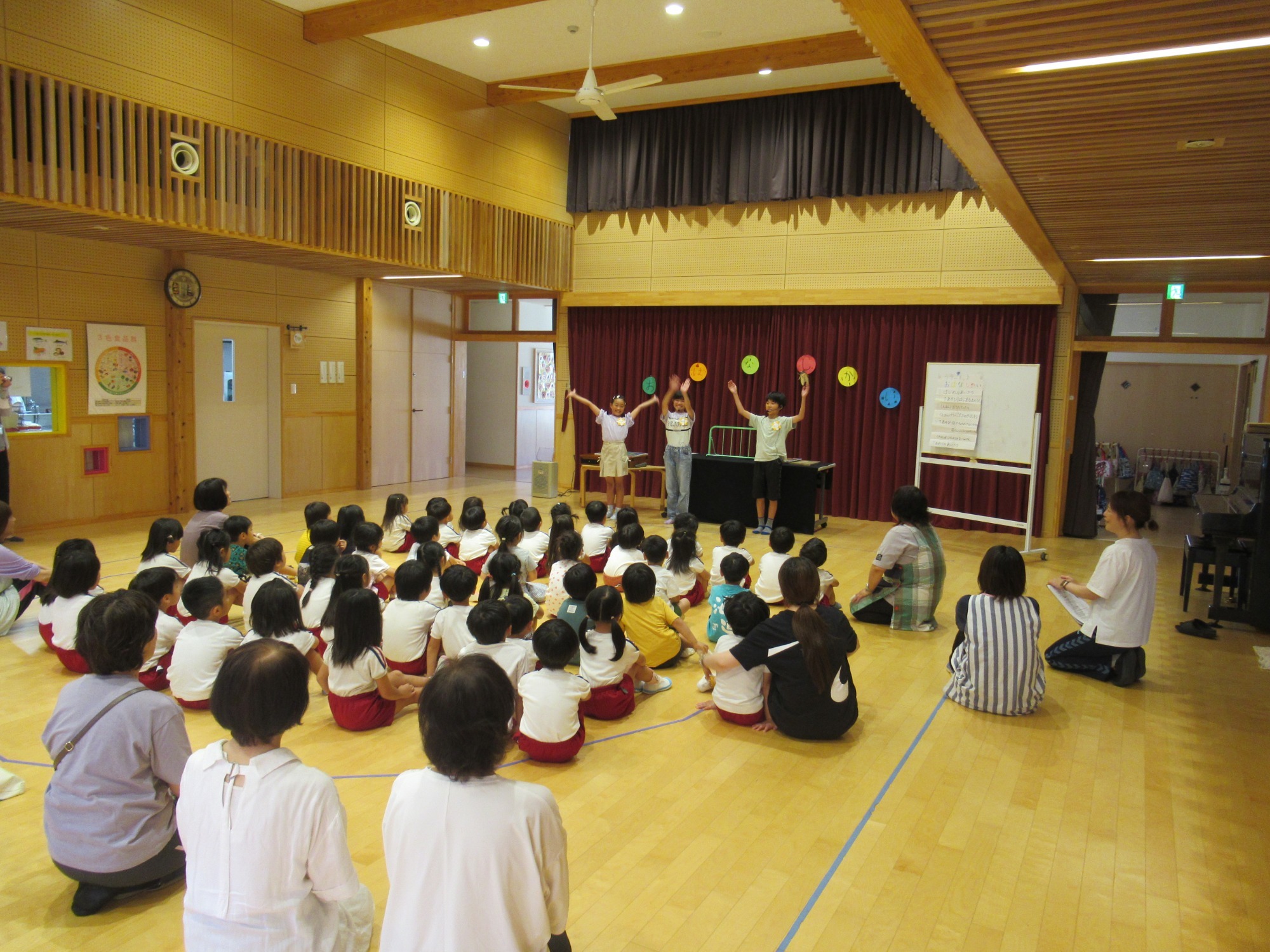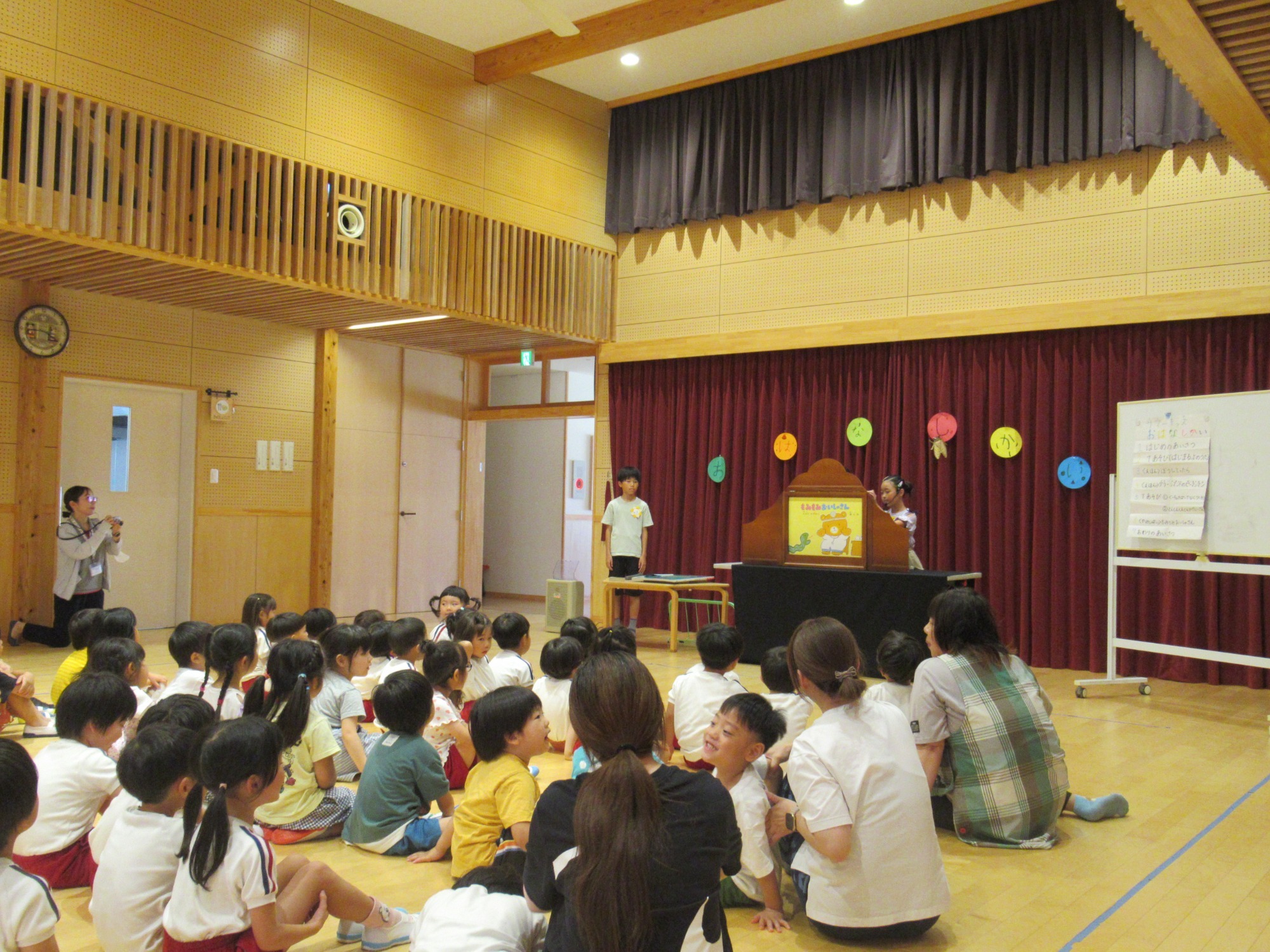大堰保育園に小学生のお話ボランティア「サマーキッズ」のお兄さん、お姉さんたちが来てくれました。絵本の読み聞かせや手遊び、紙芝居をしてもらいました。子どもたちはワクワクしながら参加しました。優しい声で読まれる絵本に子どもたちは目を輝かせて夢中で聞き入っていました。サマーキッズの皆さん、素敵な時間をありがとうございました。