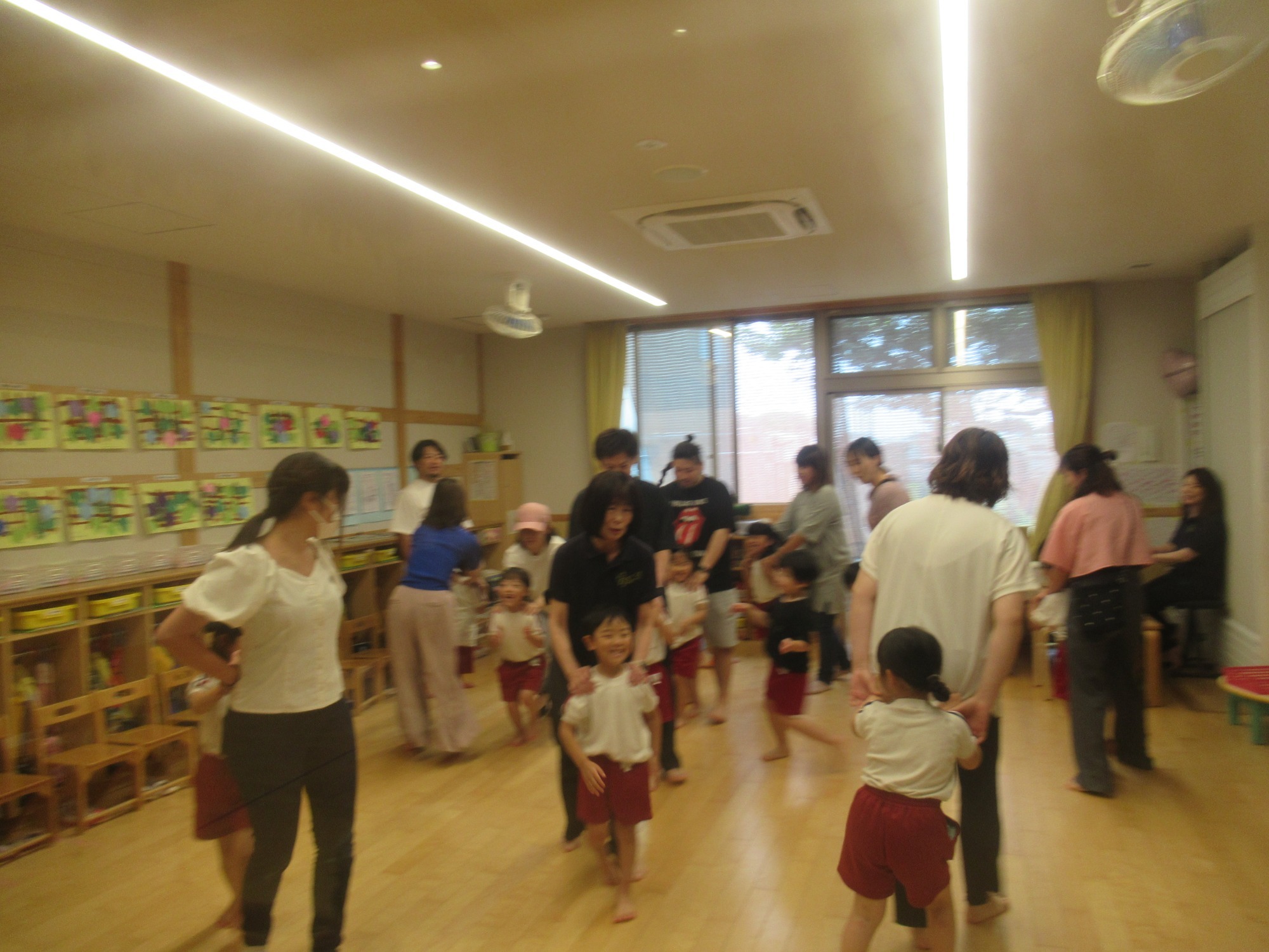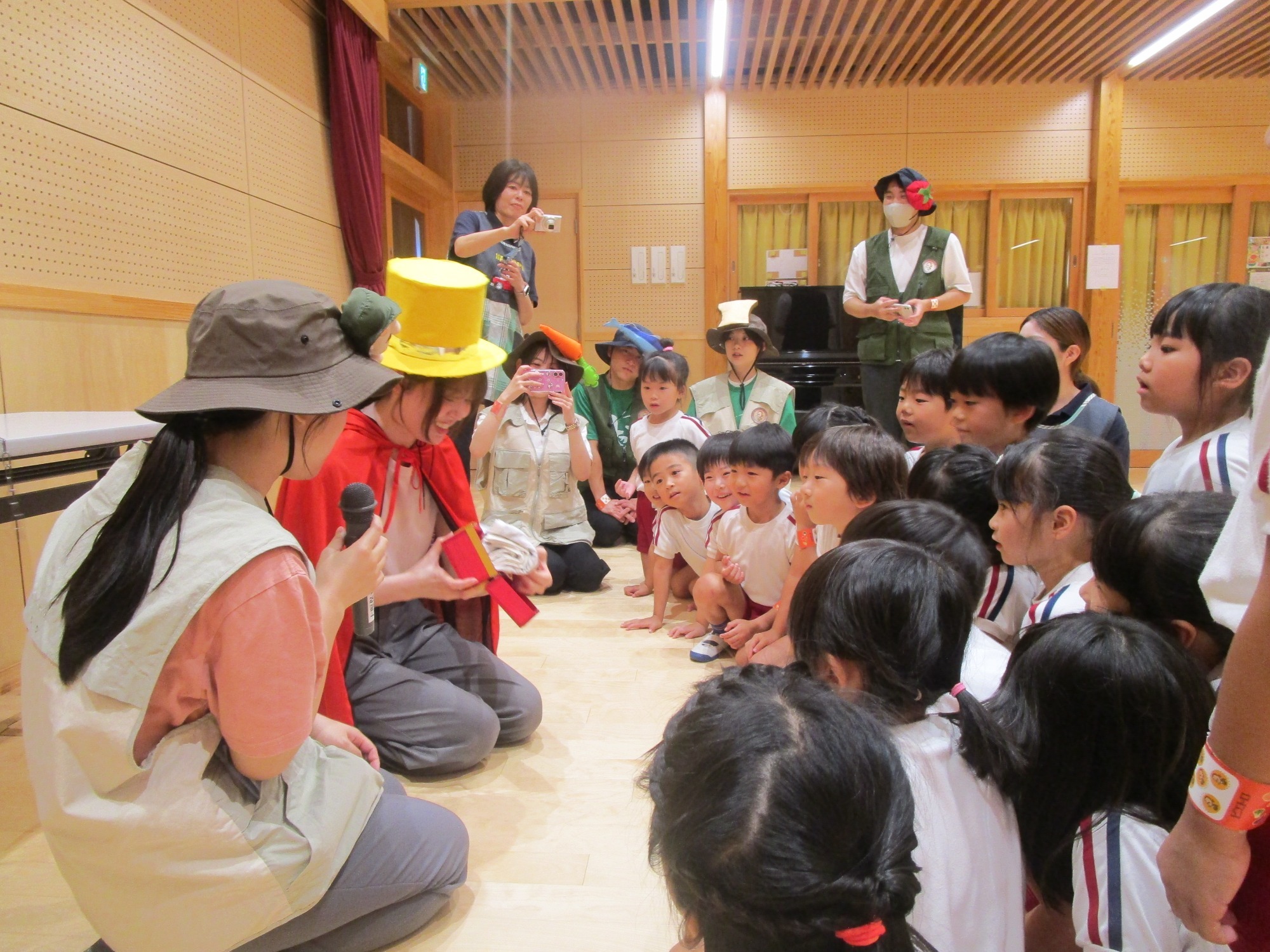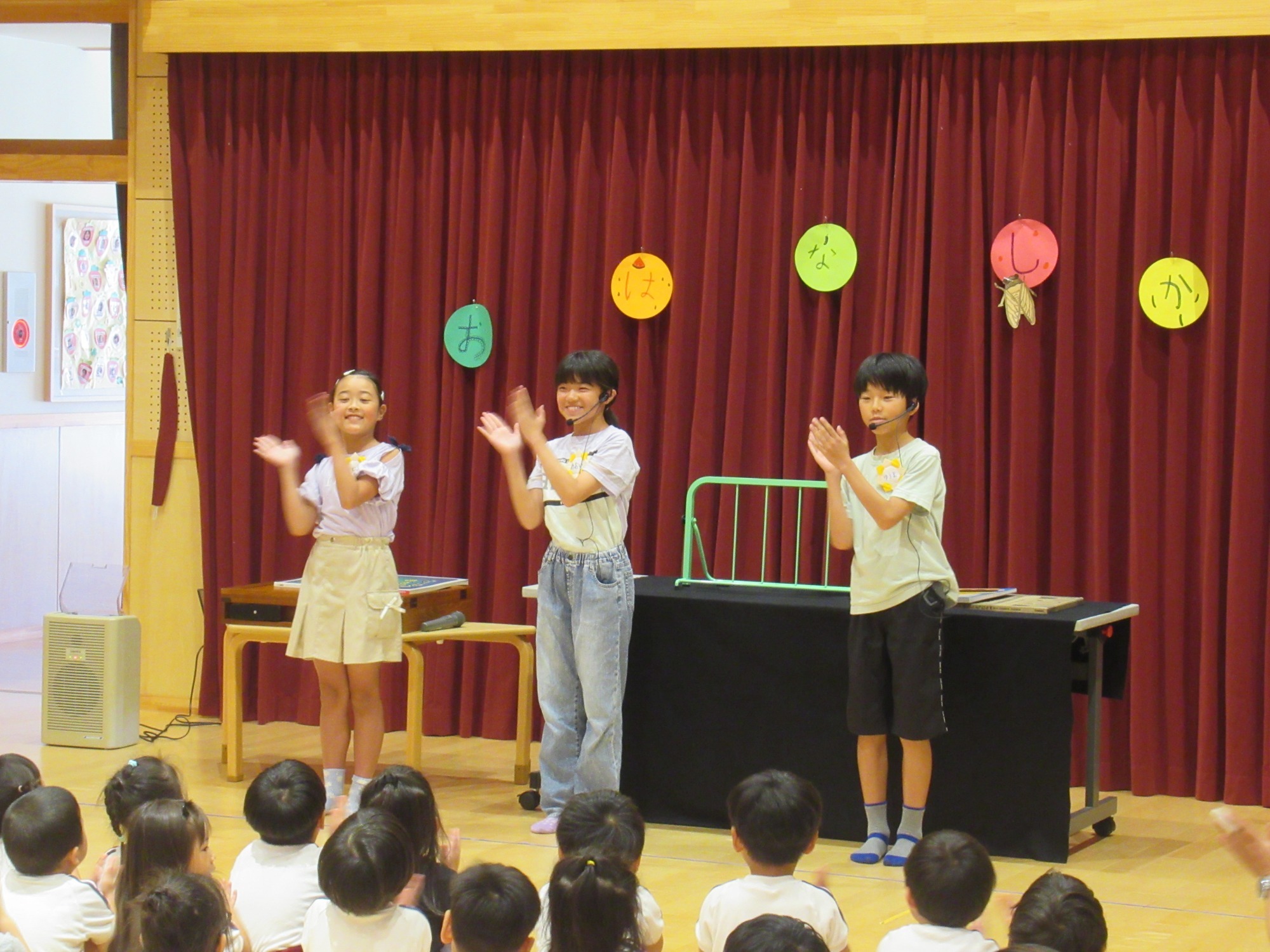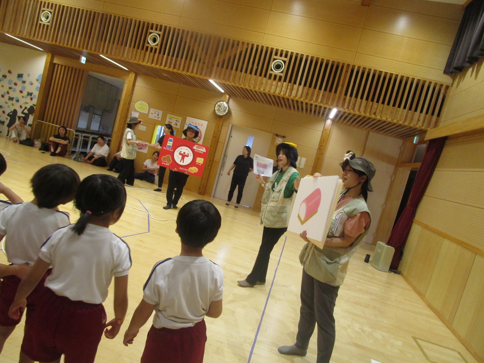 大堰保育園に小学生のお話ボランティア「サマーキッズ」のお兄さん、お姉さんたちが来てくれました。絵本の読み聞かせや手遊び、紙芝居をしてもらいました。子どもたちはワクワクしながら参加しました。優しい声で読まれる絵本に子どもたちは目を輝かせて夢中で聞き入っていました。サマーキッズの皆さん、素敵な時間をありがとうございました。