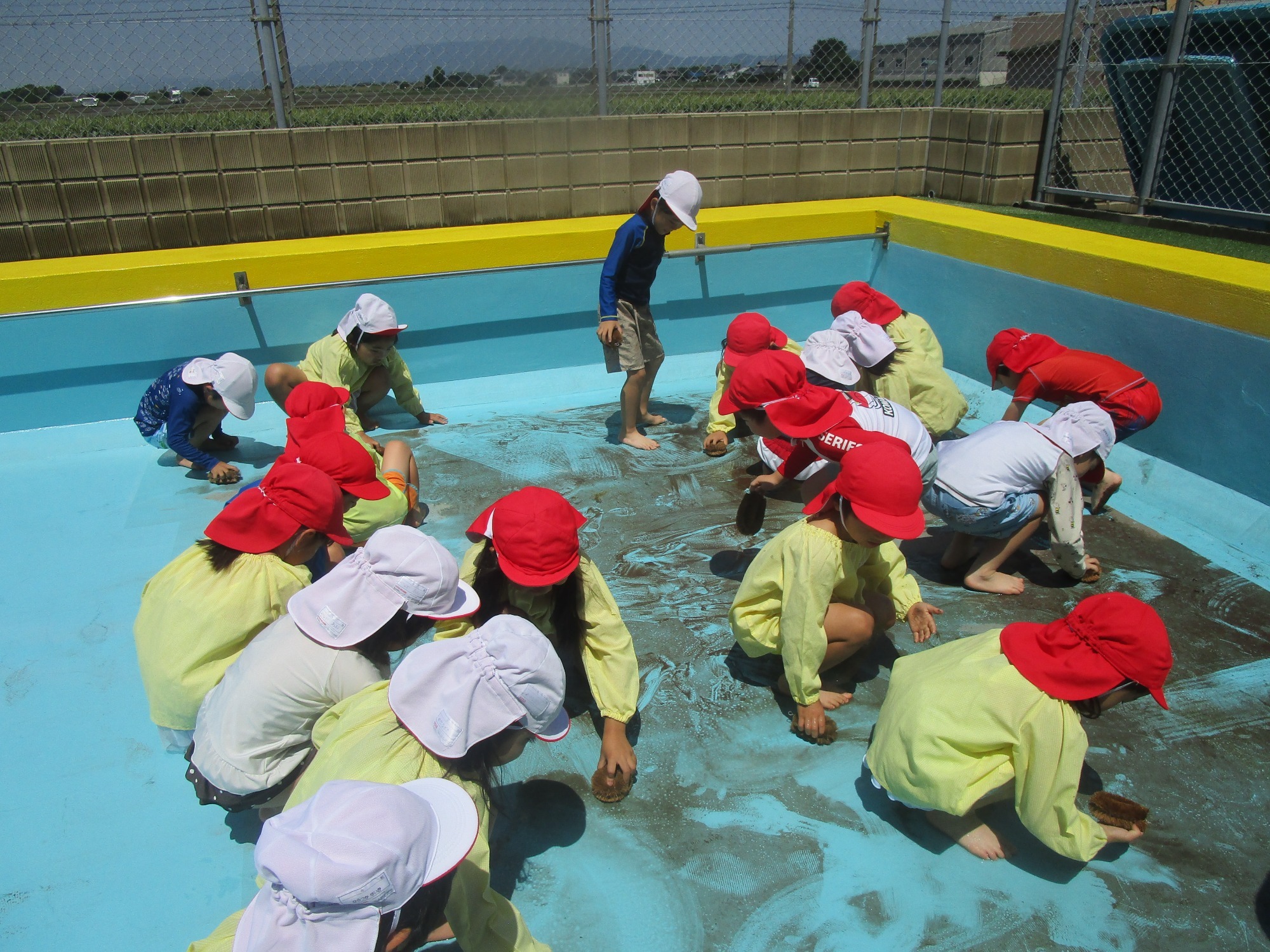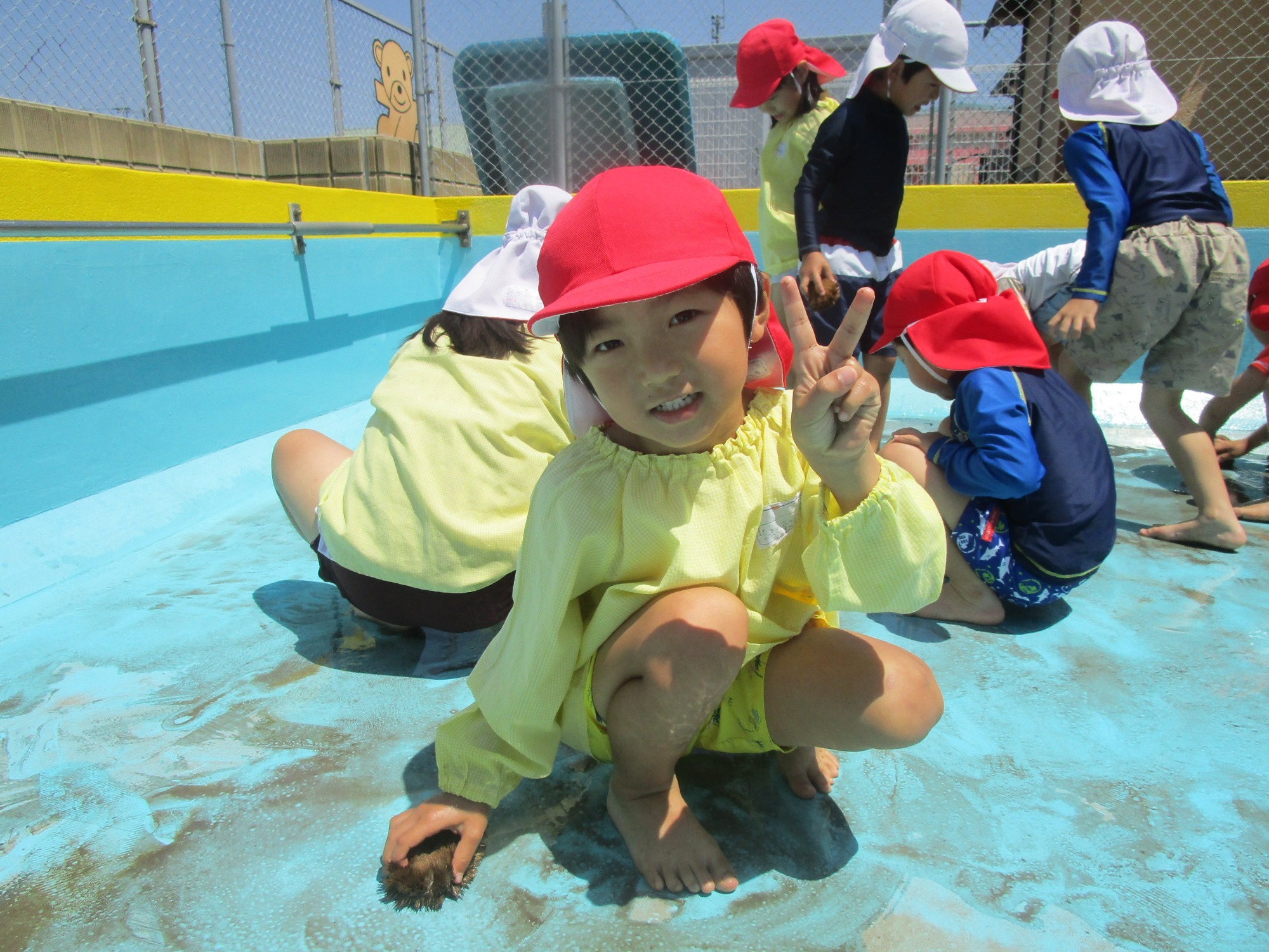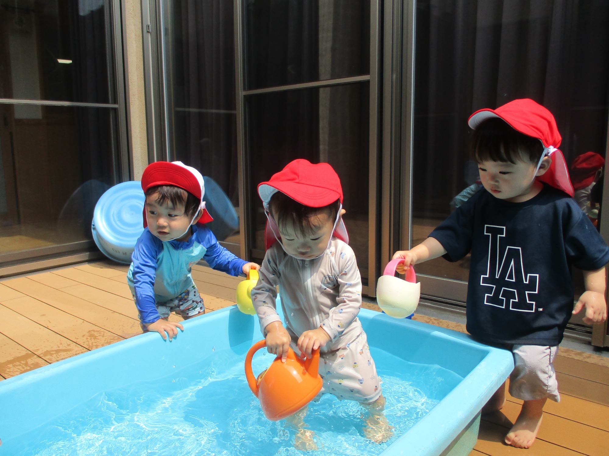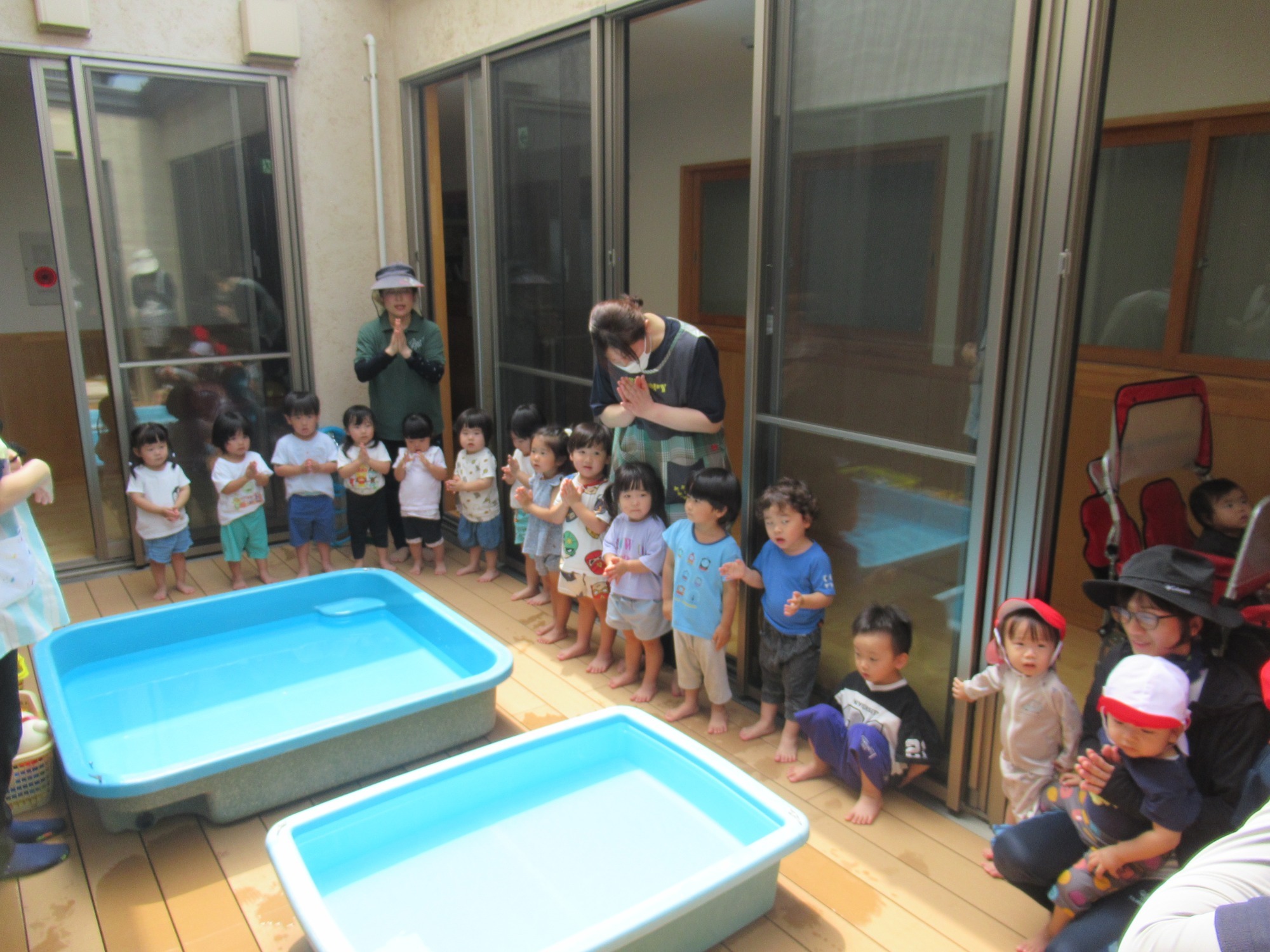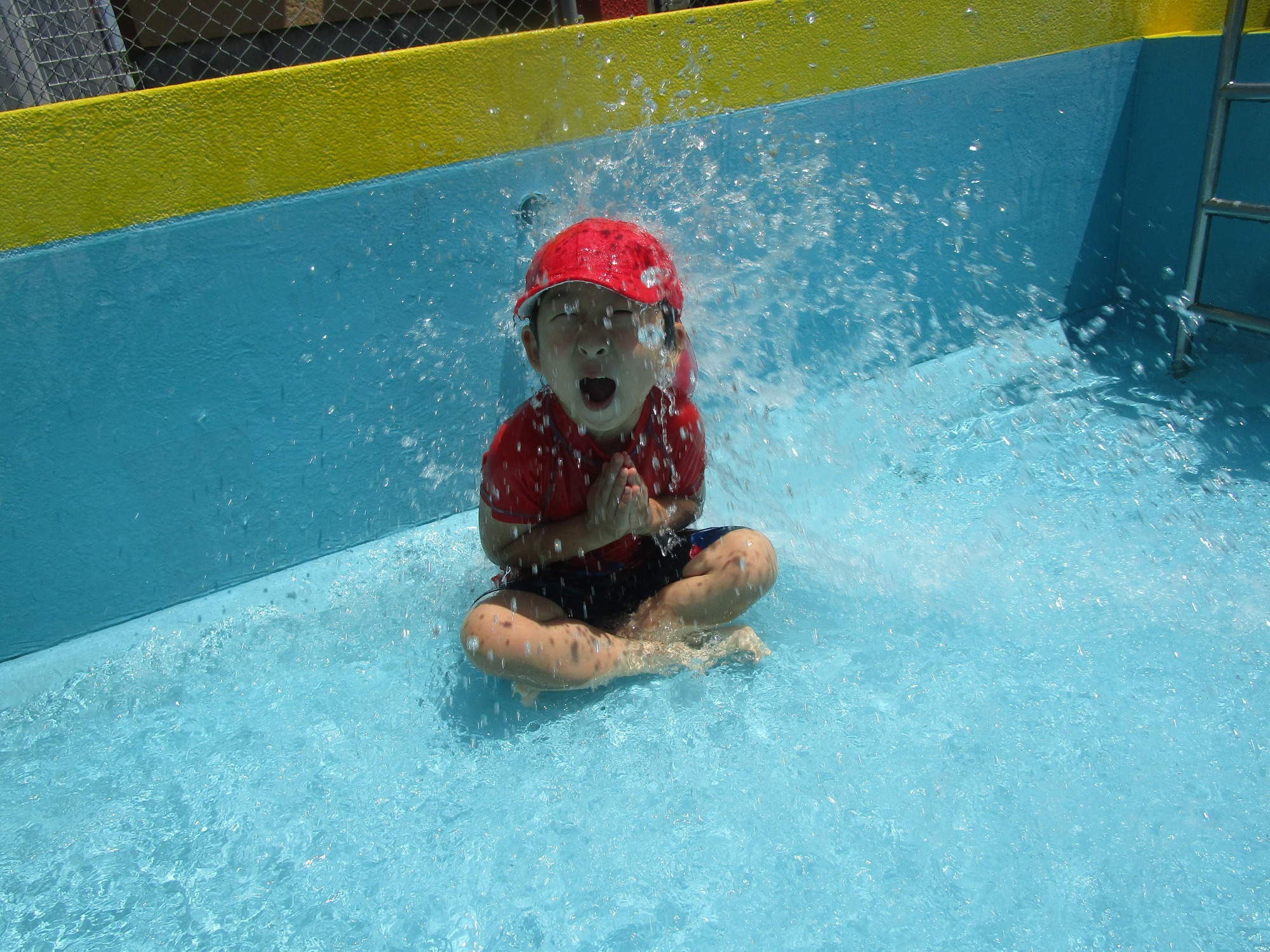 掃除が終わりきれいなプールに水をいれ少しだけ水遊びを楽しみました♬水が出るところに座り滝修行をしたり、ワニ歩きをしたりしてを楽しみました。