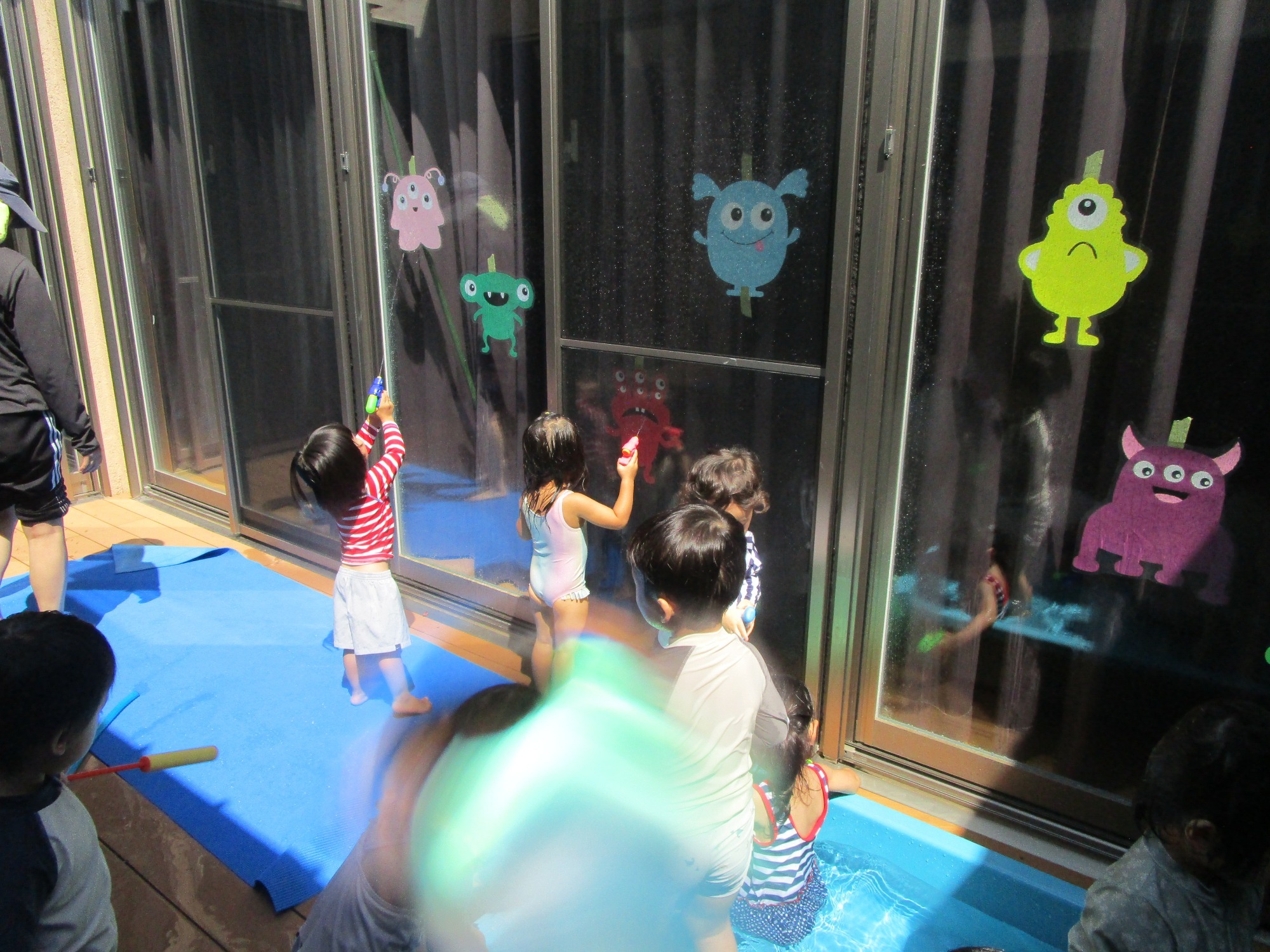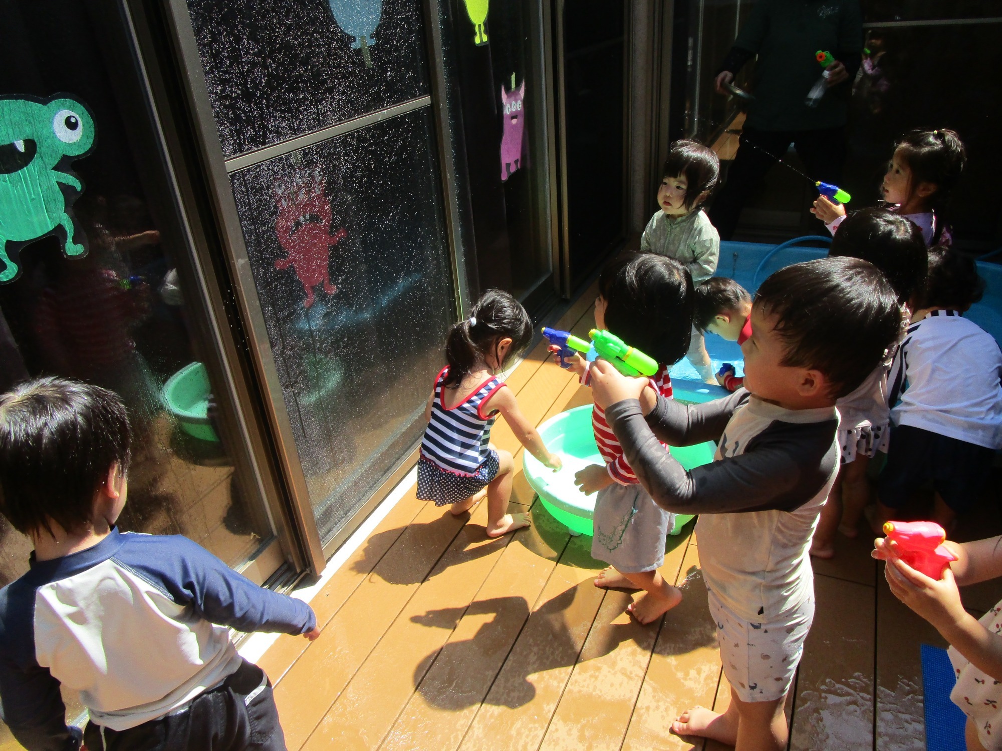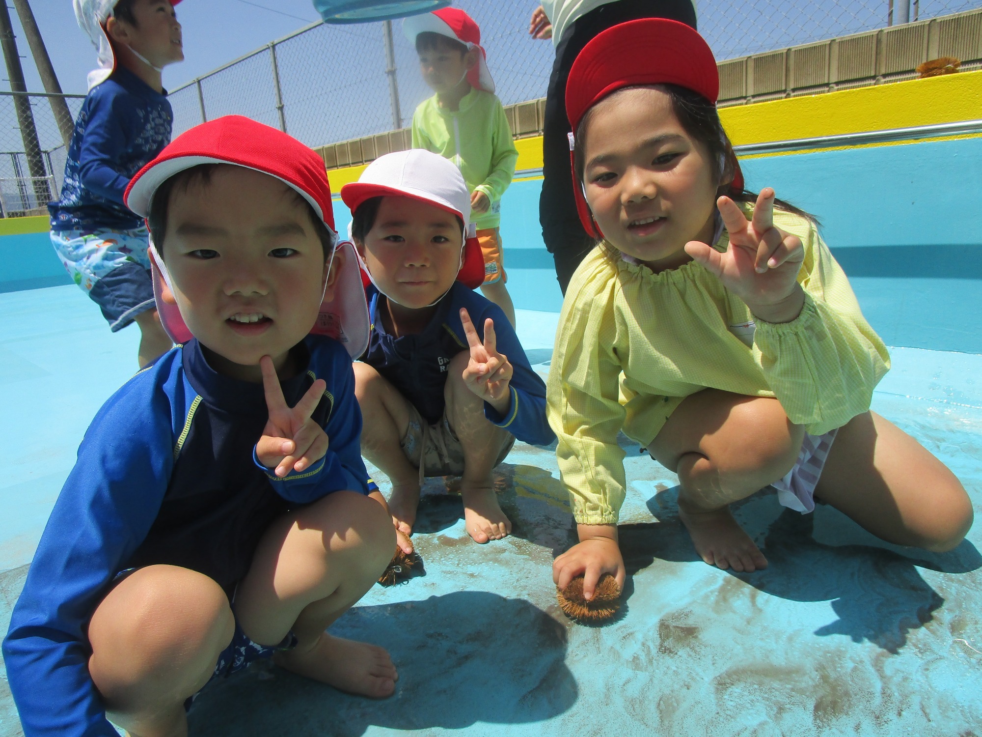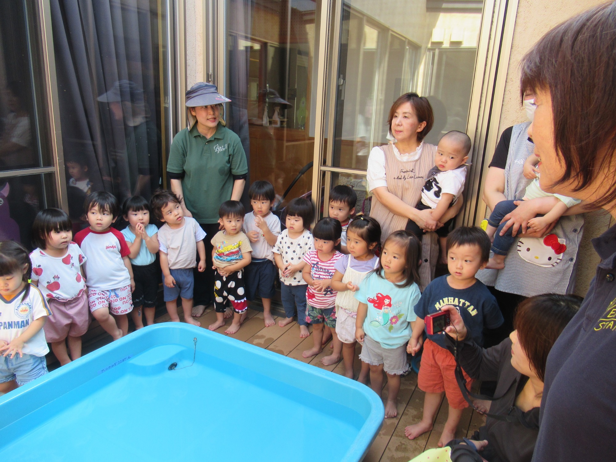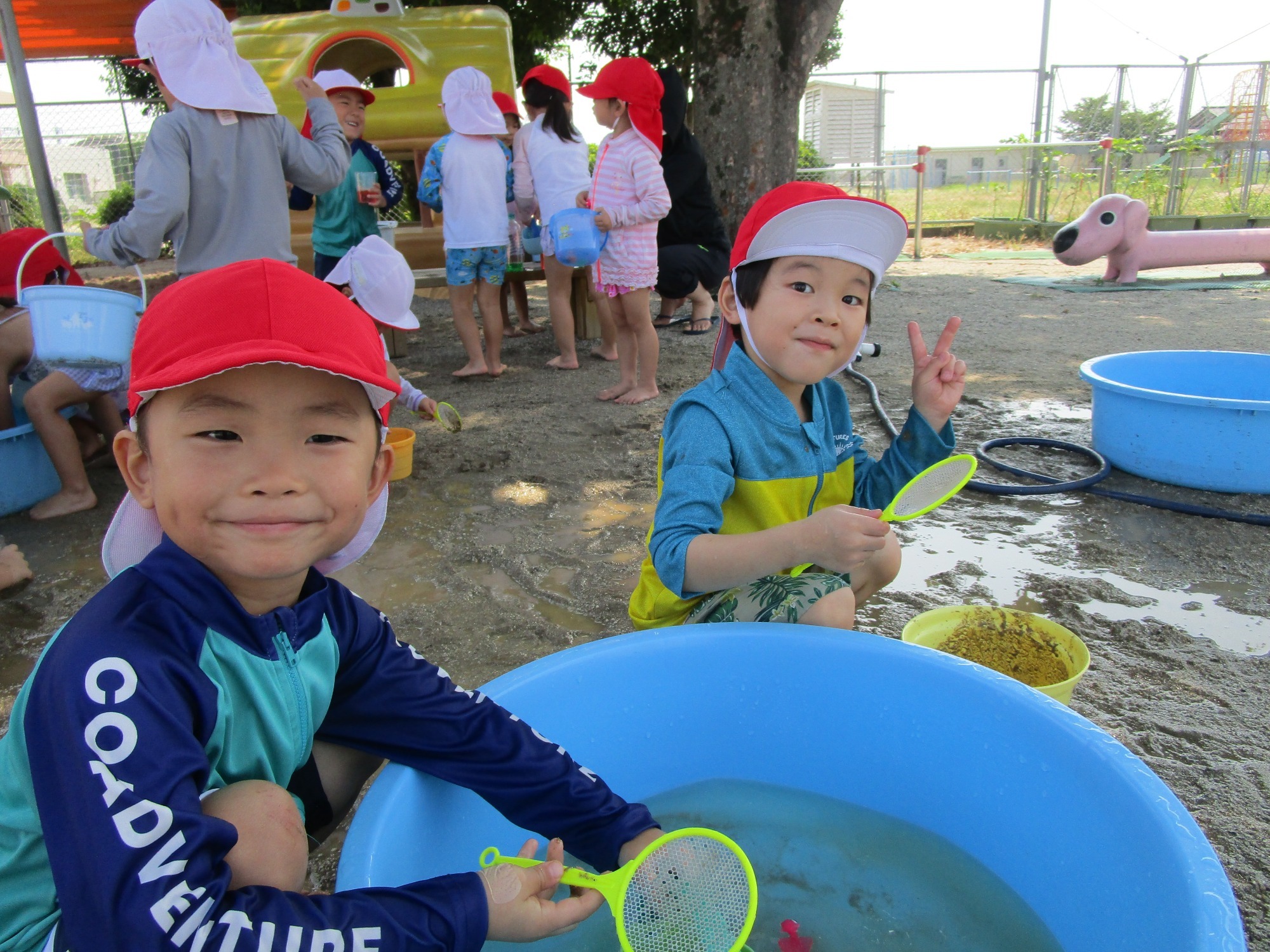 掃除が終わりきれいなプールに水をいれ少しだけ水遊びを楽しみました♬水が出るところに座り滝修行をしたり、ワニ歩きをしたりしてを楽しみました。