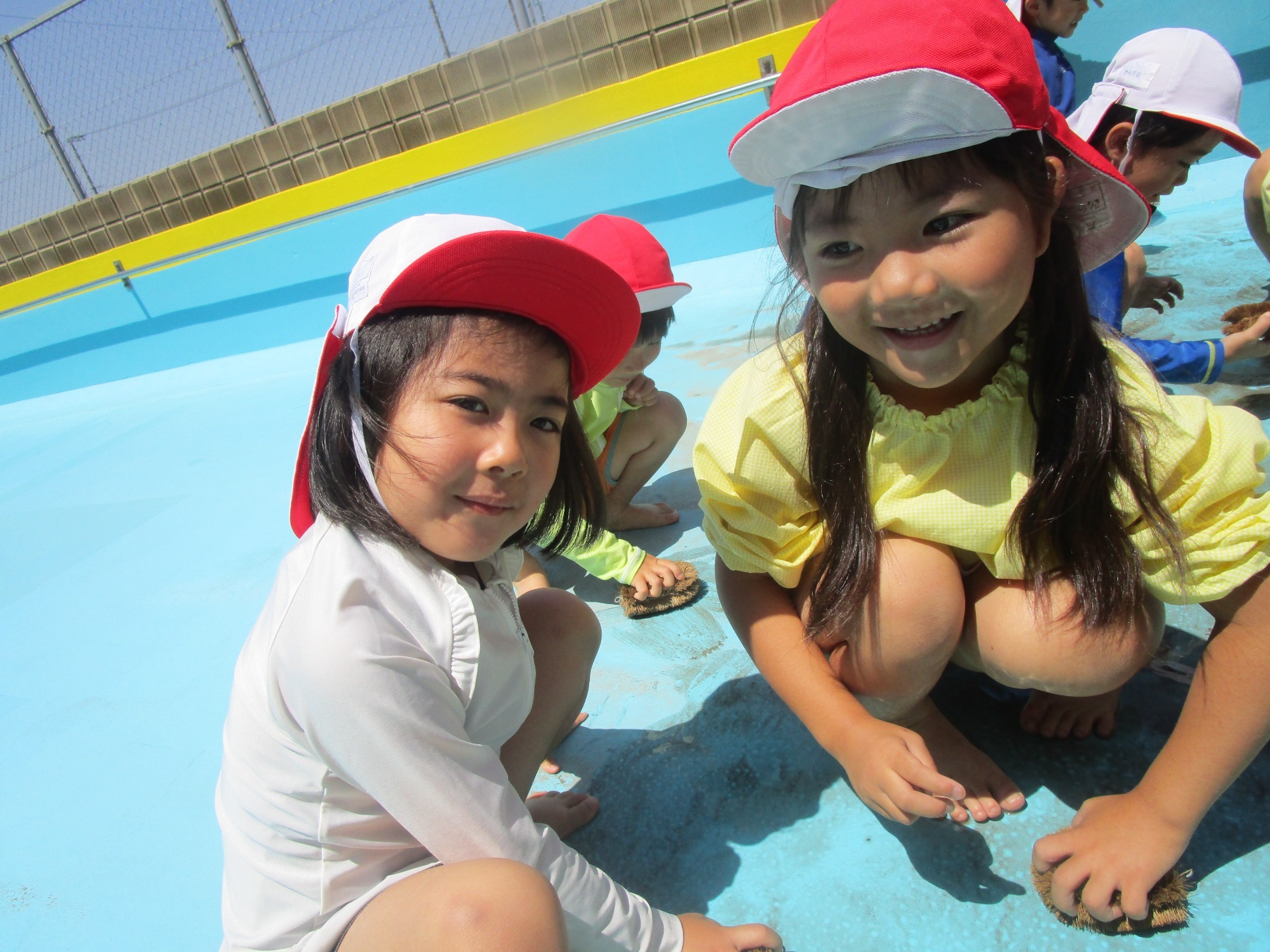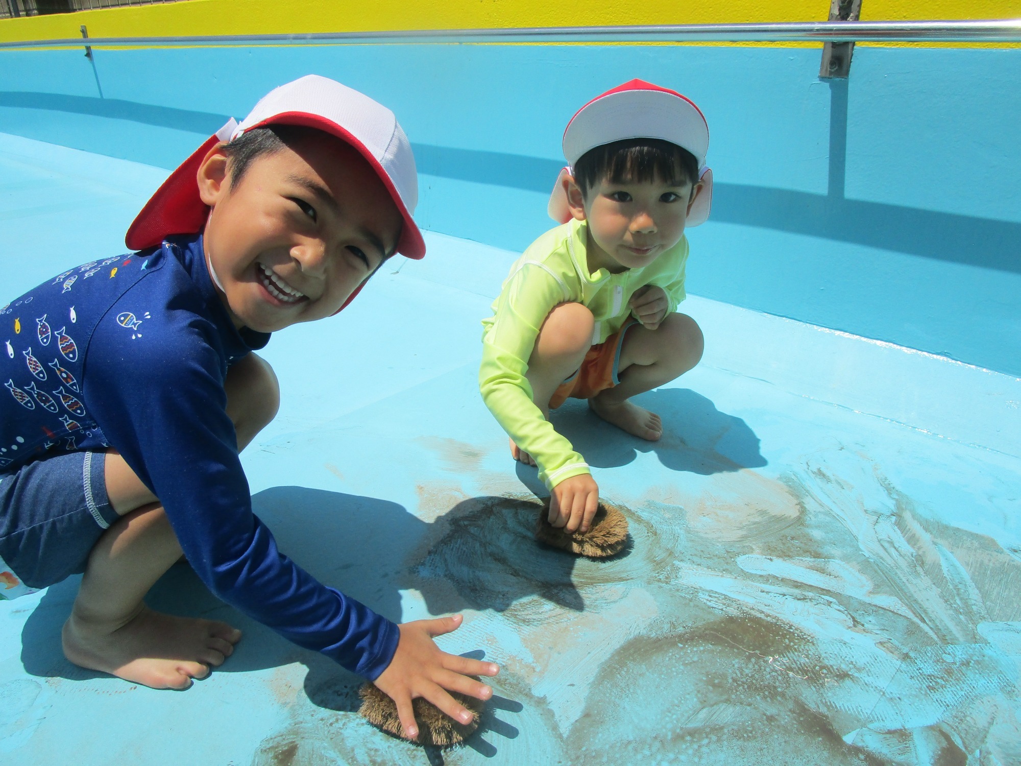 今年初めて水着に着替え、気合い満タンでいざプールへ!たくさんの汚れをたわしで丁寧に磨きながらきれいにお掃除をしました。