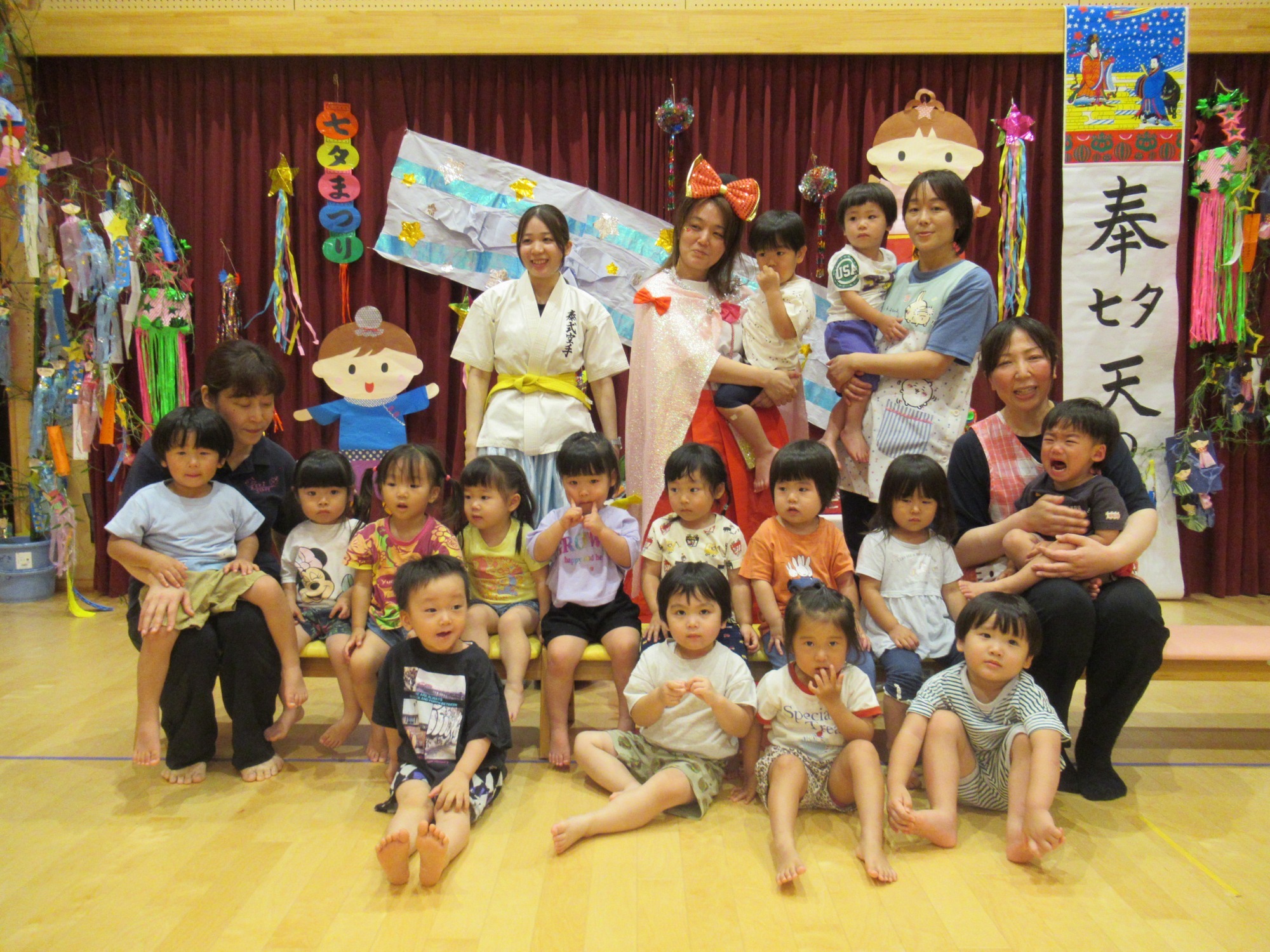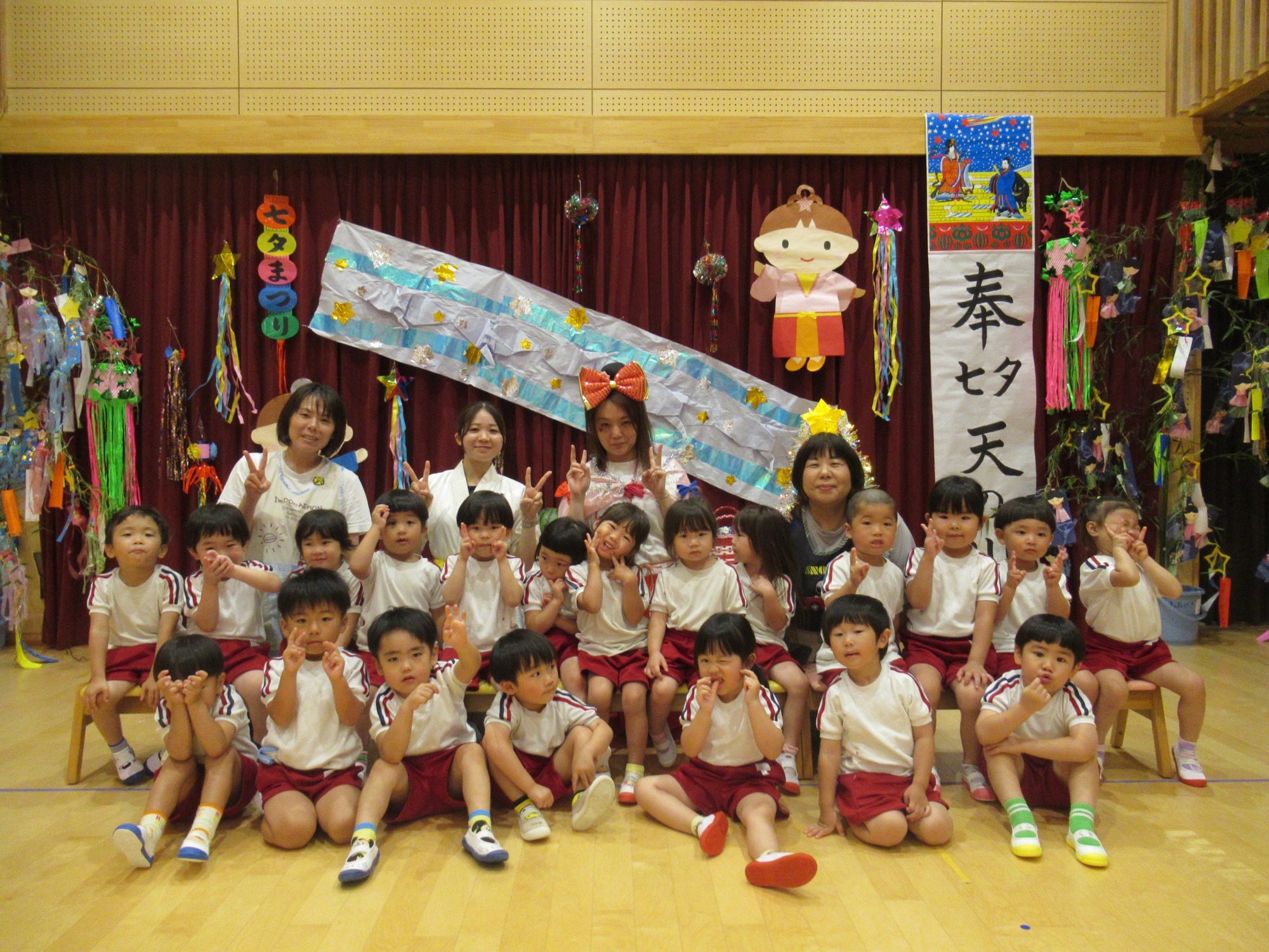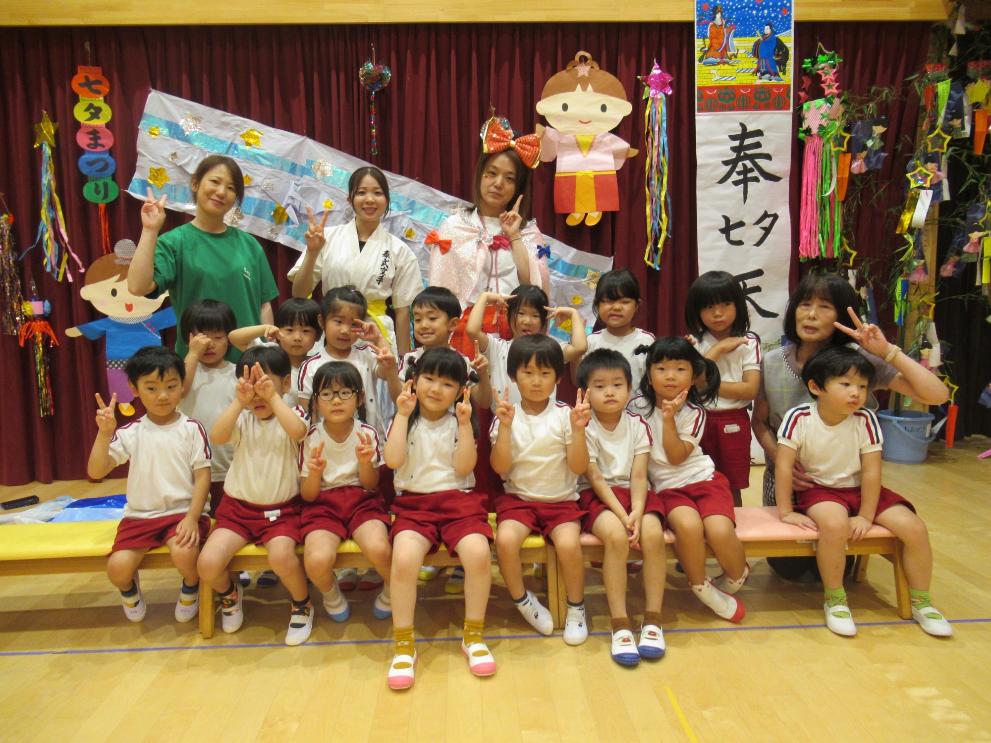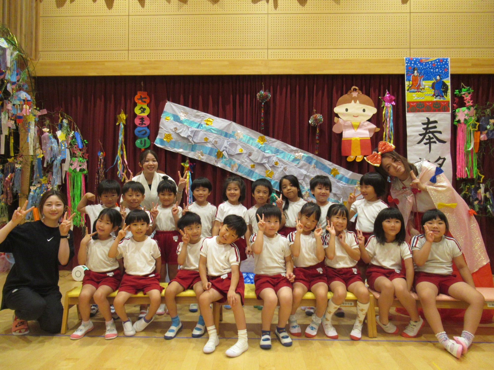 七夕祭りでは七夕の由来の話を聞いたり歌を歌ったりしました。今年も彦星と織姫が会いに来てくれ大盛り上がり☆一緒に写真を記念撮影もしました!