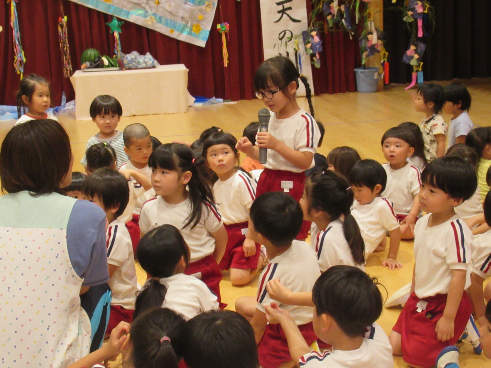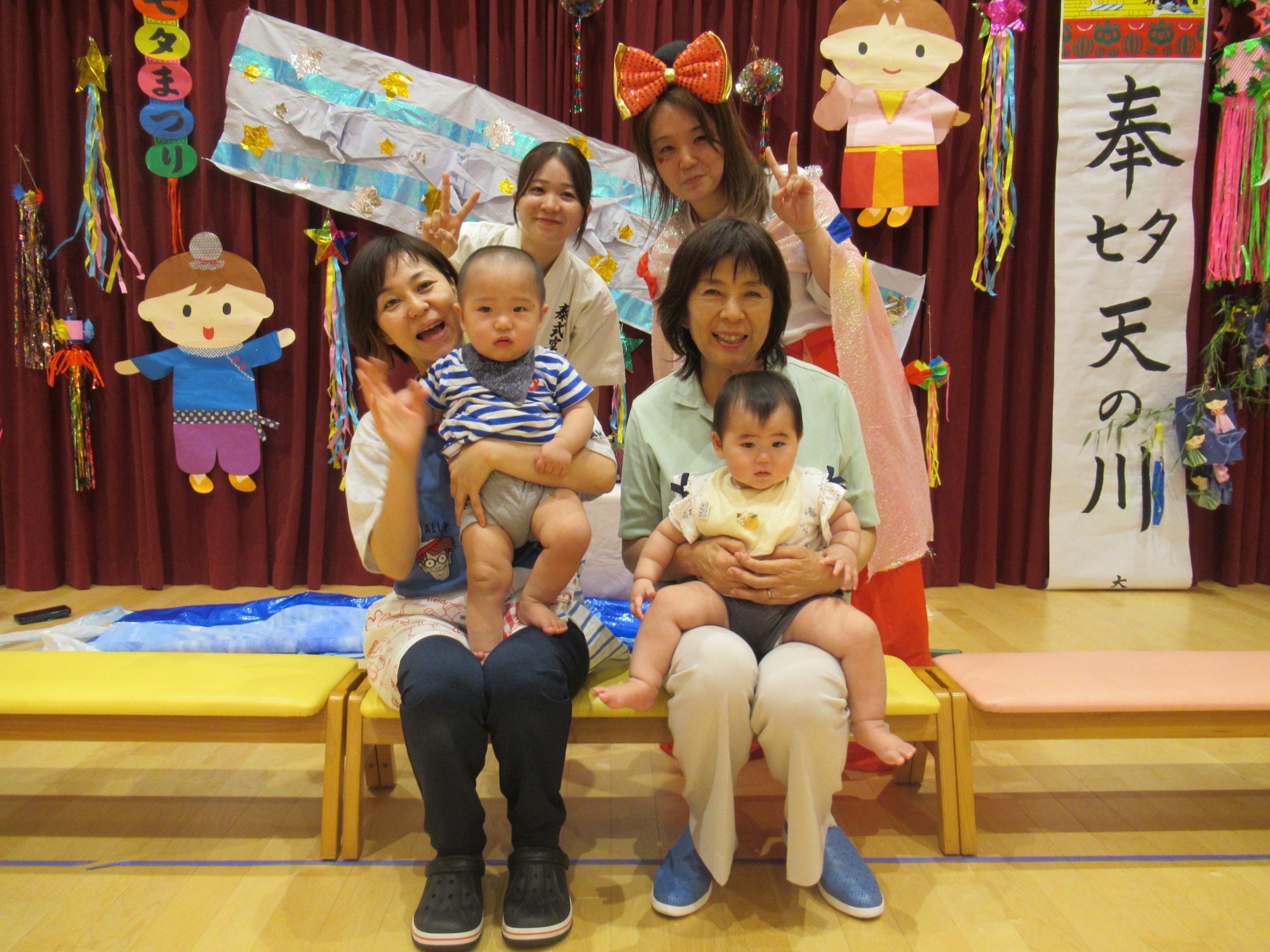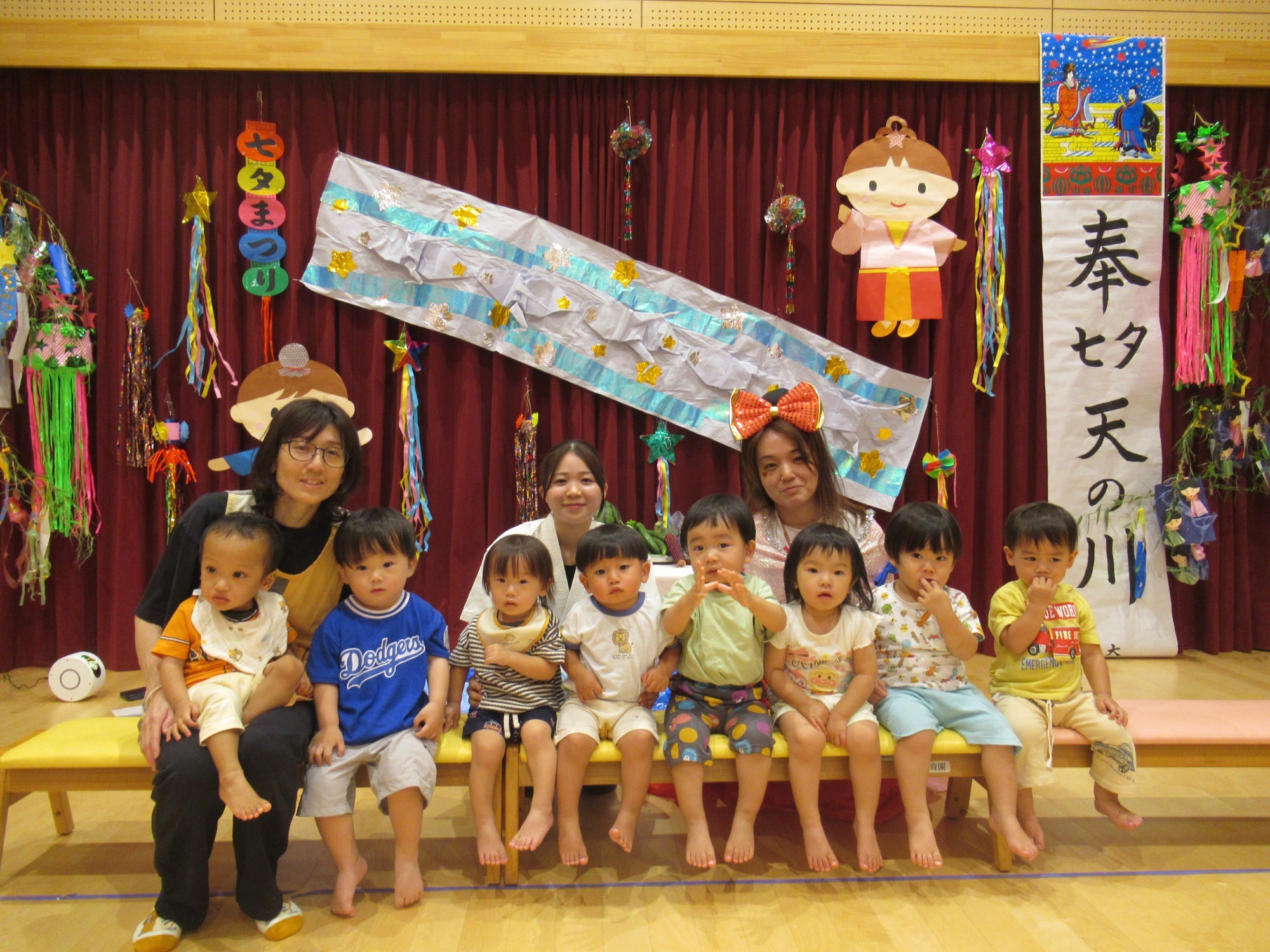 七夕祭りでは七夕の由来の話を聞いたり歌を歌ったりしました。今年も彦星と織姫が会いに来てくれ大盛り上がり☆一緒に写真を記念撮影もしました!