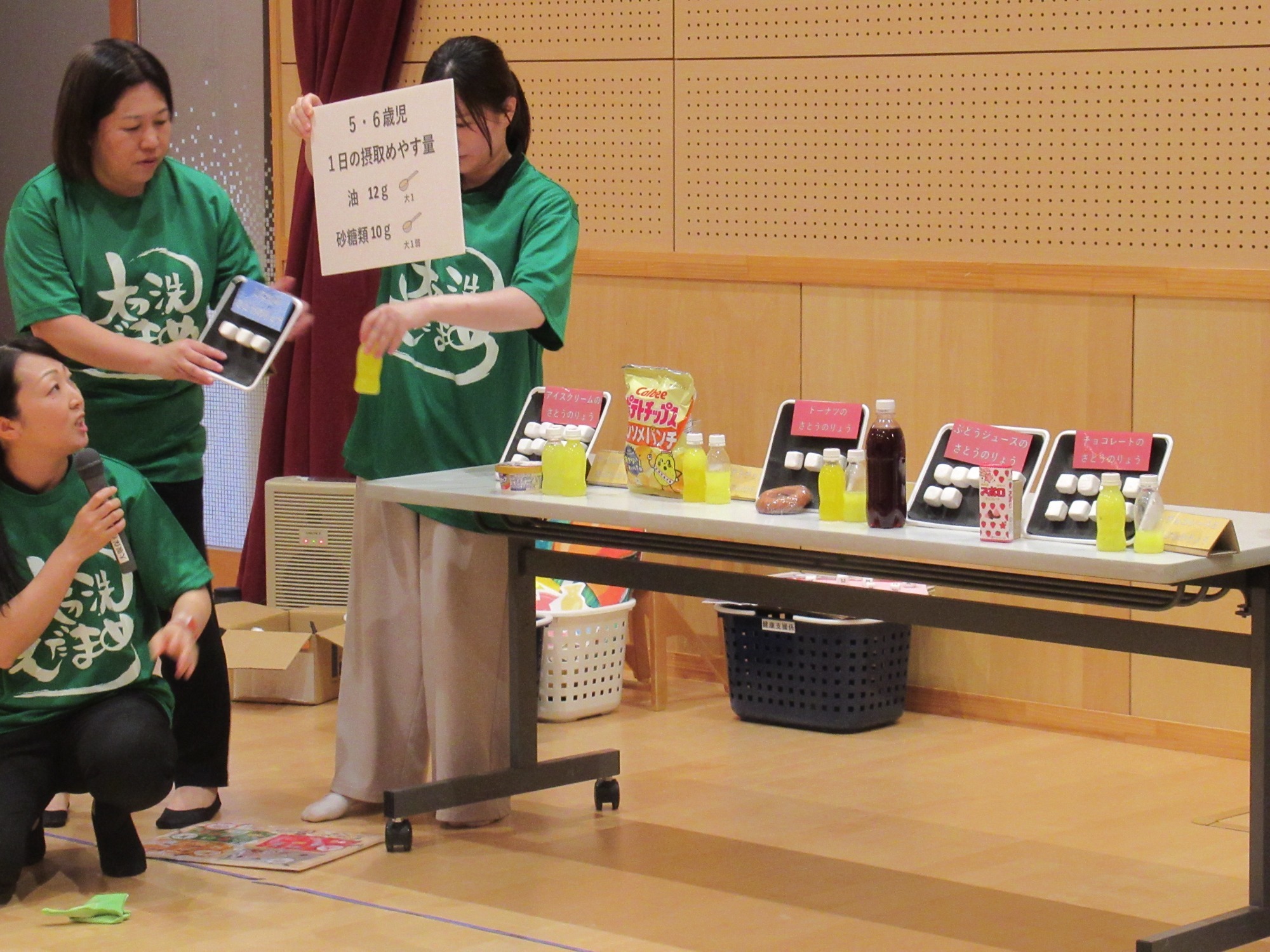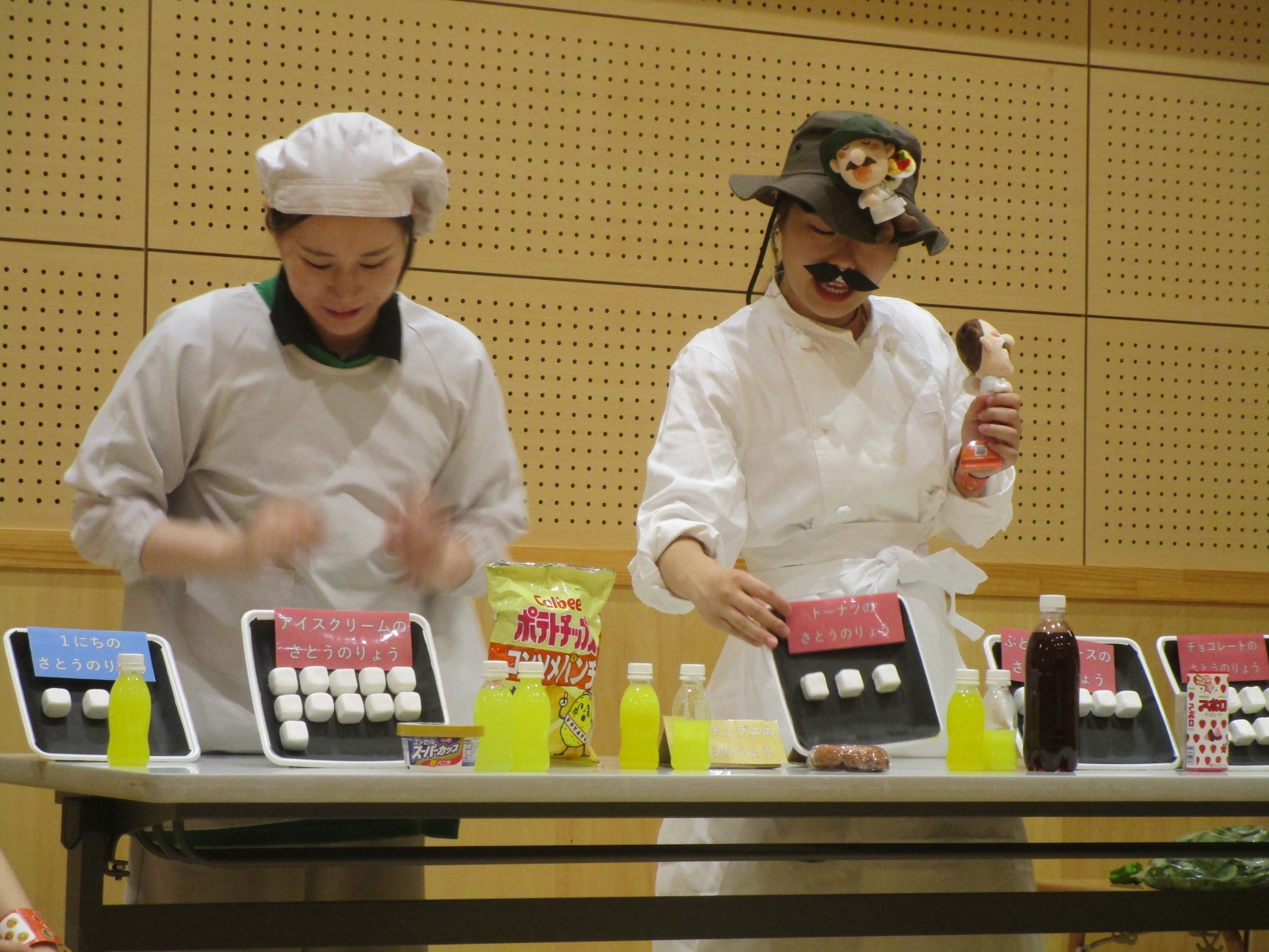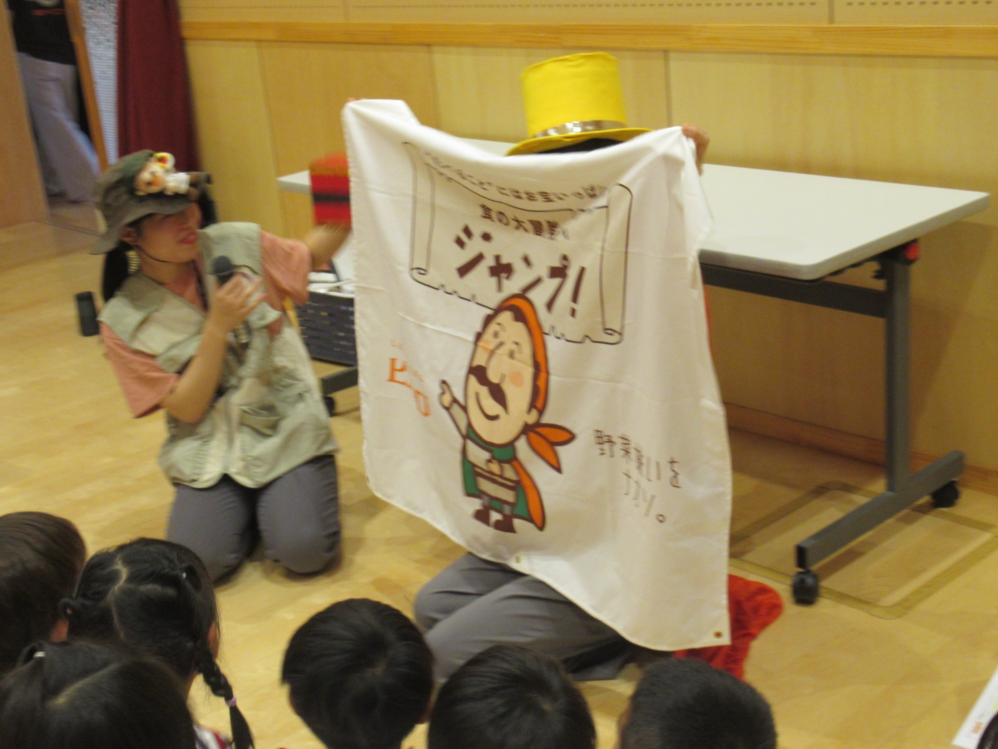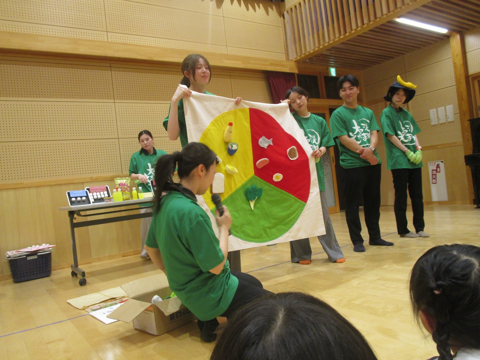 昨年に続き、今年もピエトロさんと一緒に食育イベント「食の大冒険へジャンプ!」が行われました。 今年は保護者の方にもご参加いただきました。子どもたちと一緒に、大刀洗町の野菜生産者さんのお話を聞いたり、ピエトロさんや役場の方による劇やクイズを楽しんだりしました。食材や食べることの魅力を子どもたち、保護者の方に伝えてくださいました。最後にはみんなで給食タイム☆ 大刀洗の野菜を使った『だいぼうけんサラダ』にピエトロドレッシングをかけると野菜が苦手な子も「美味し~!」と笑顔でパクパク。食べることの楽しさを感じられたようです。お家の方と一緒に食べる給食は格別で、たくさんの笑顔が溢れていました。