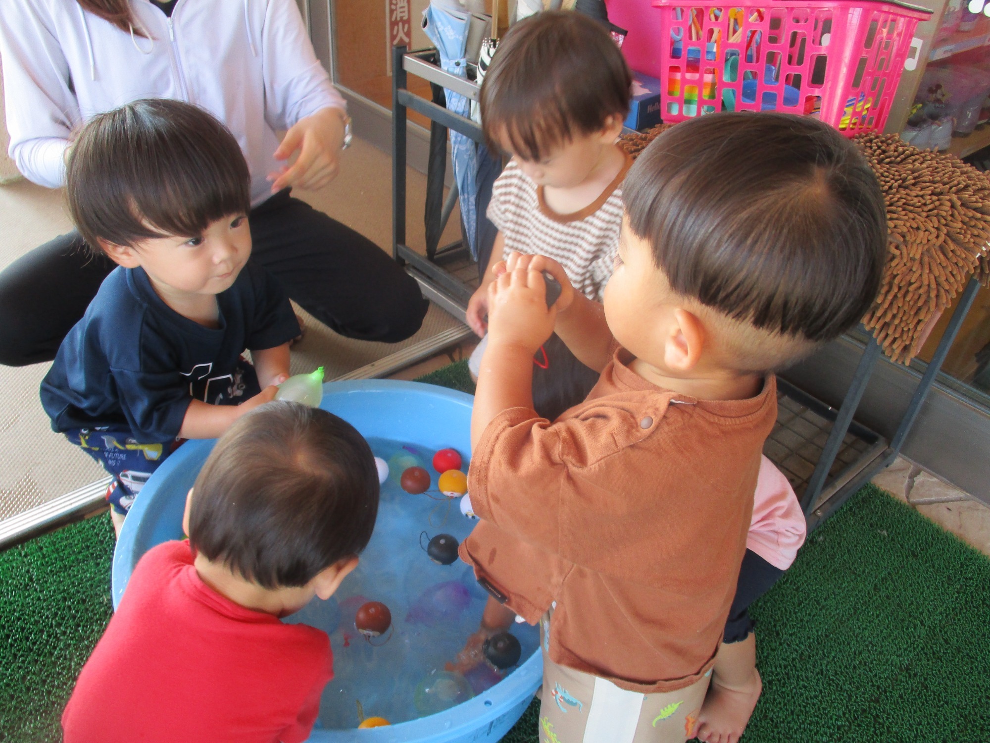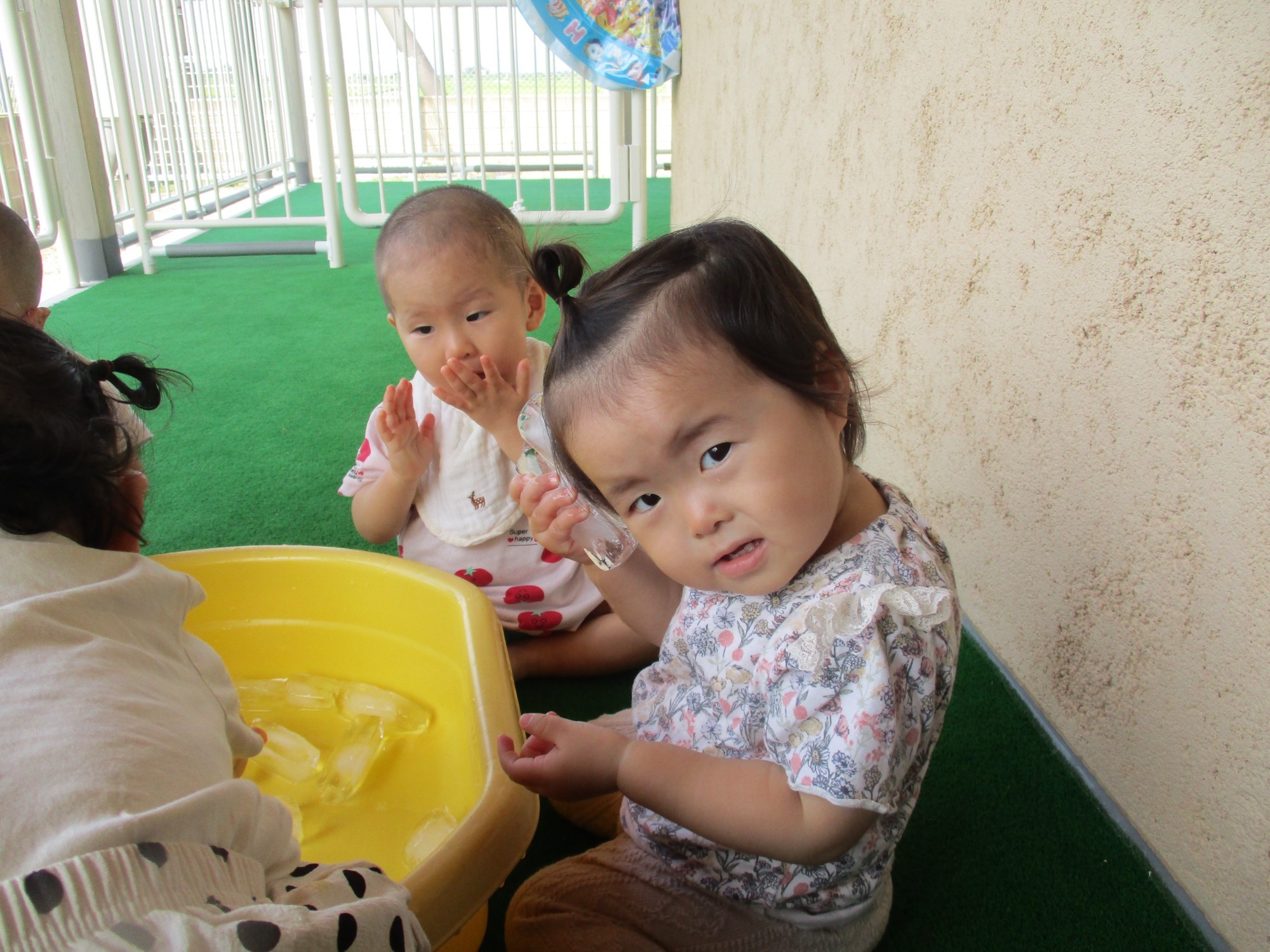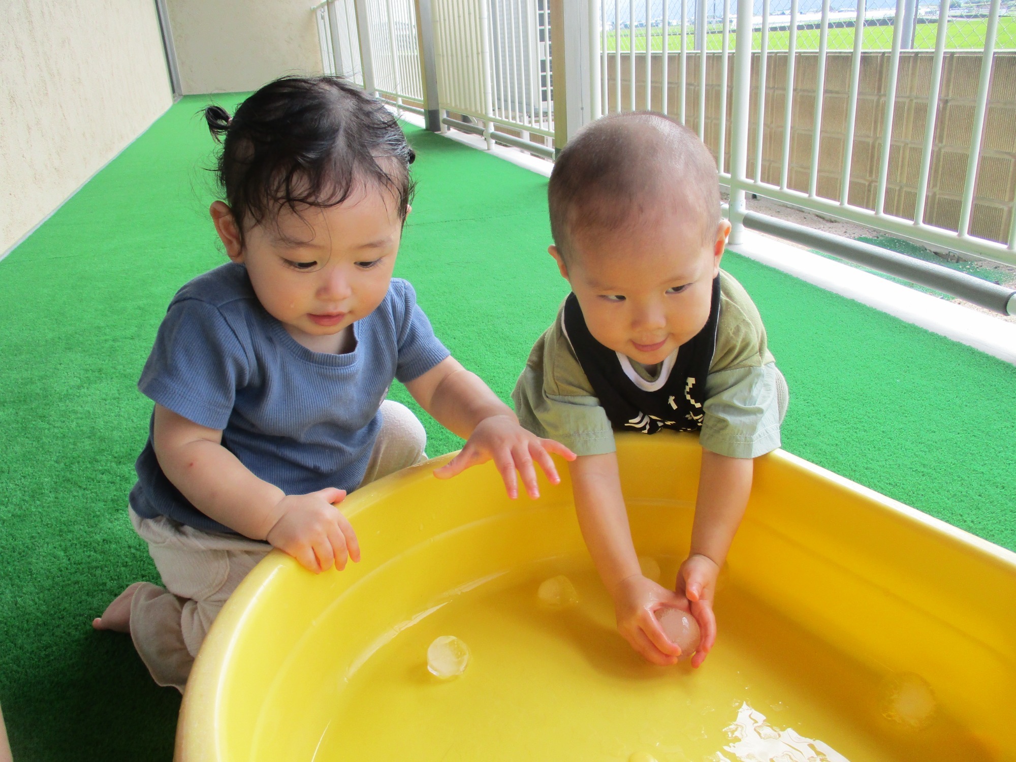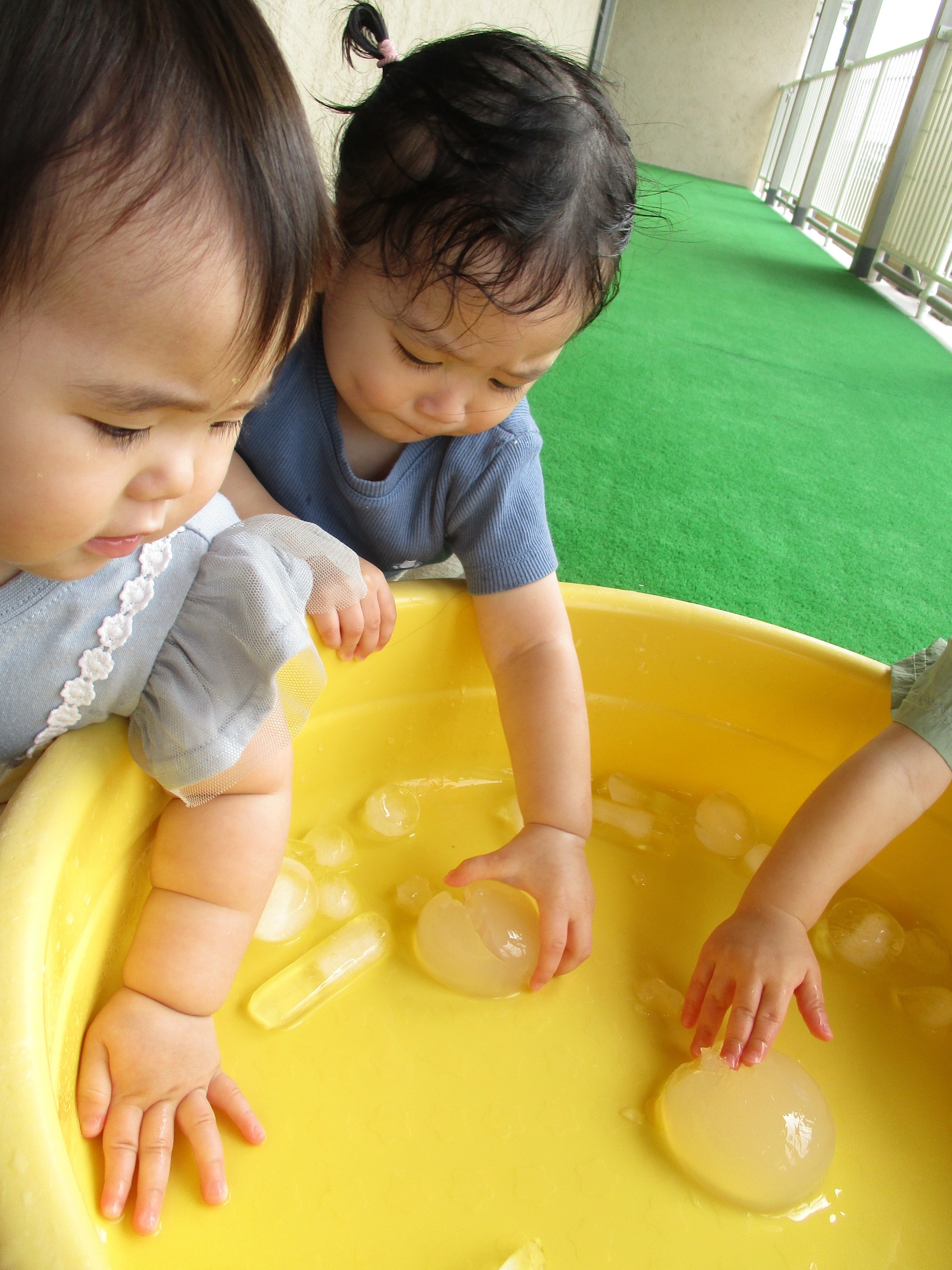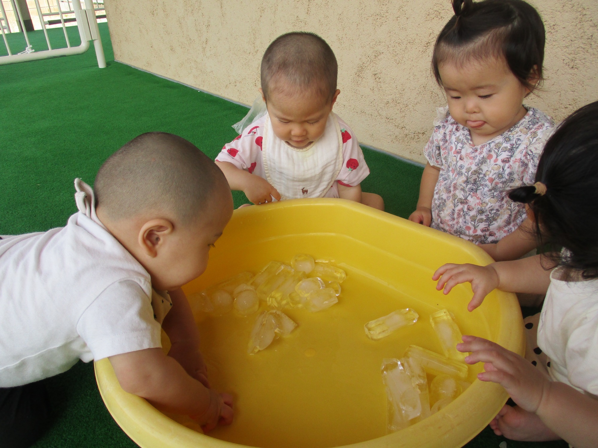 0歳児さんは、氷の感触あそびや、色水あそび、泥あそびを楽しみました。