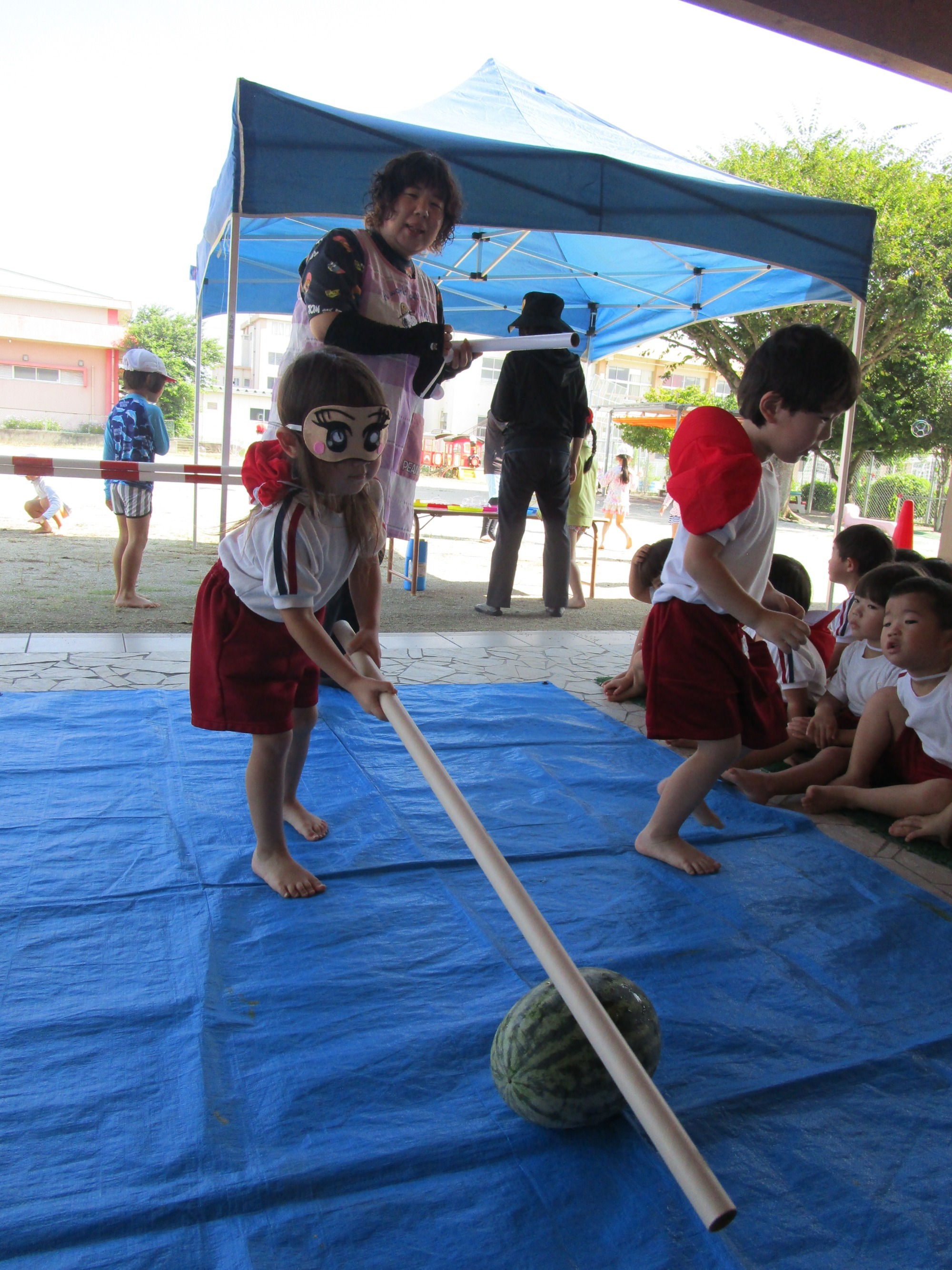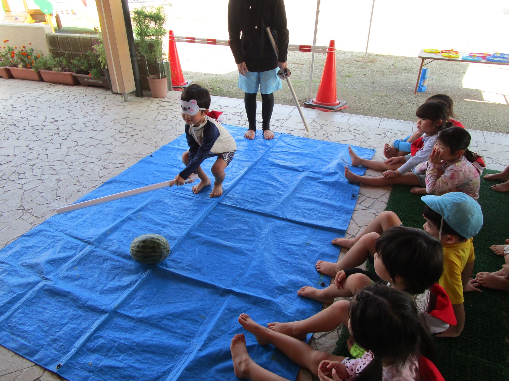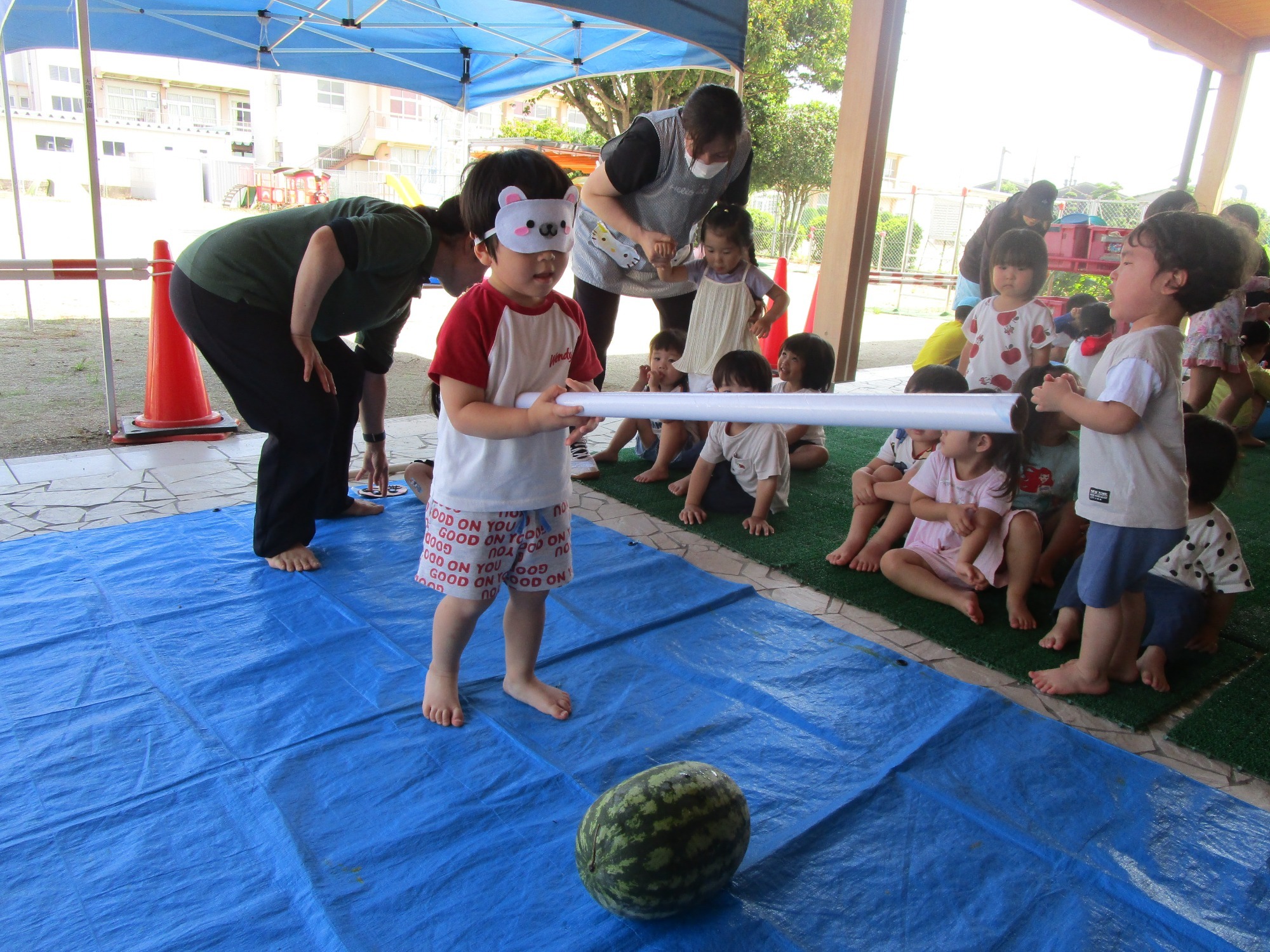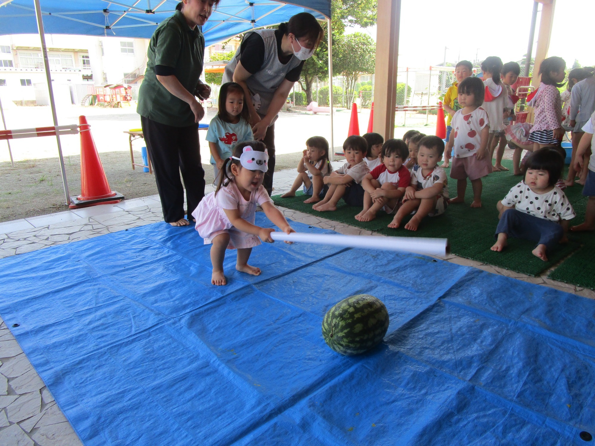 夏の間、子どもたちが大好きだったプール遊び。プール納会では「プールさん、ありがとう」と元気いっぱいに声を合わせてお礼をし、事故やケガもなく安全に楽しく水遊びができたことに感謝しました。 そのあと、ヨーヨー釣りでは「とれたよ!」と嬉しそうな笑顔があふれ、シャボン玉ではキラキラ光る泡が青空にとんでいき子どもたちは大はしゃぎでした。さらに保護者の方からたくさんのスイカを頂き、みんなでスイカ割りを楽しみました。「まっすぐ!」「元右だよー」と元気な声援の中、スイカにヒビが入ると子どもたちからは大歓声。あまーい美味しいスイカをみんなでいただきました。