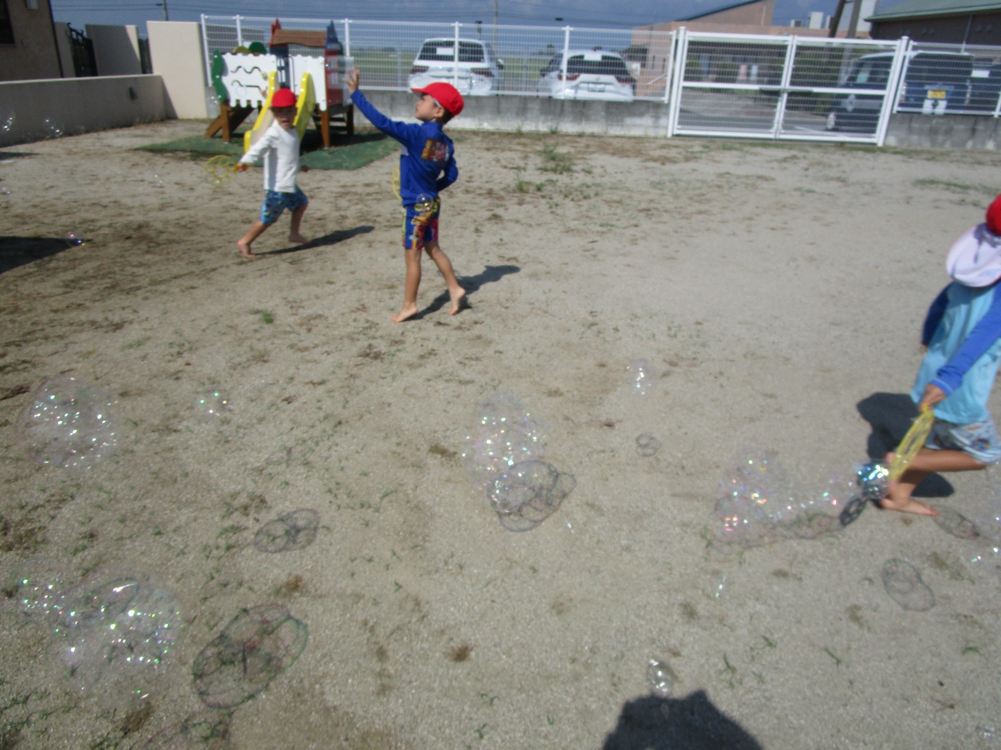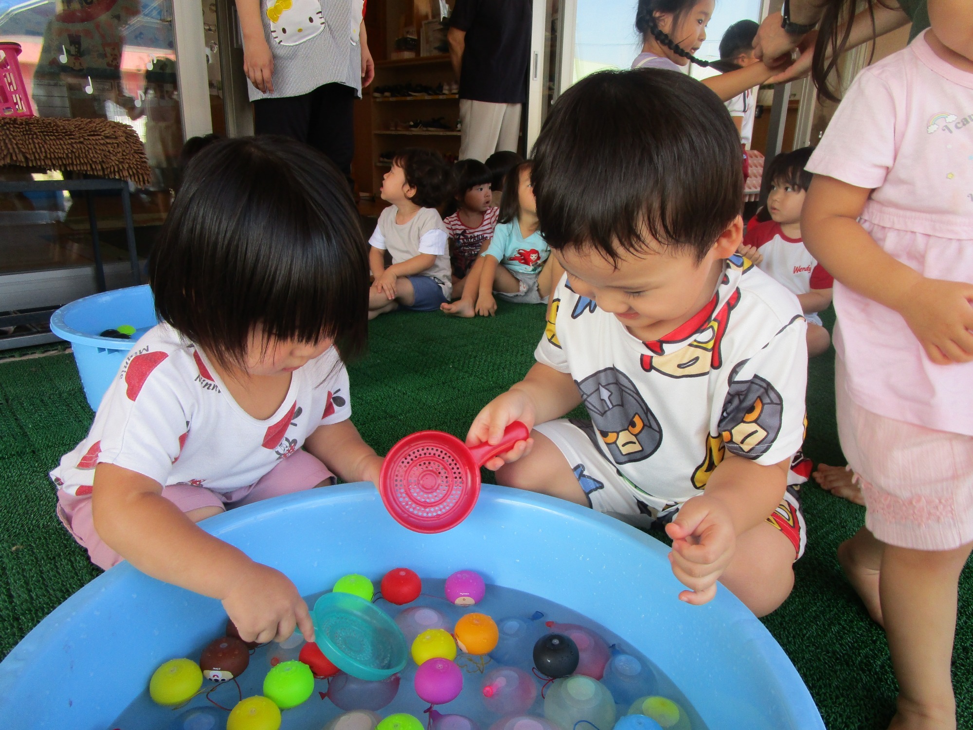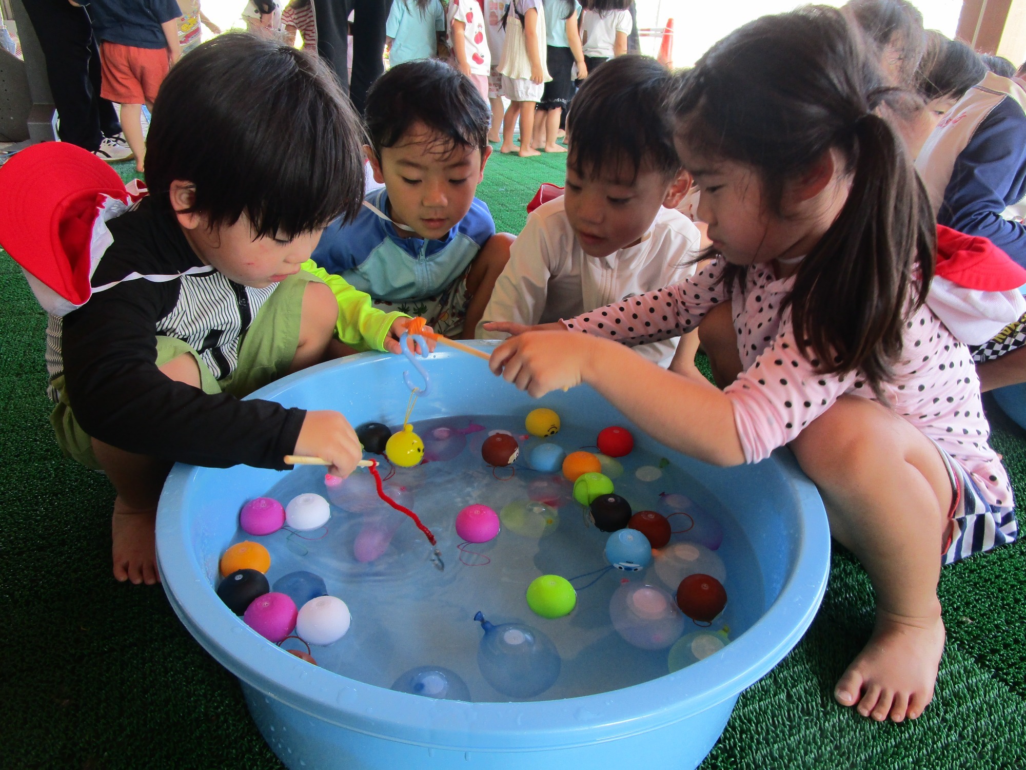 夏の間、子どもたちが大好きだったプール遊び。プール納会では「プールさん、ありがとう」と元気いっぱいに声を合わせてお礼をし、事故やケガもなく安全に楽しく水遊びができたことに感謝しました。 そのあと、ヨーヨー釣りでは「とれたよ!」と嬉しそうな笑顔があふれ、シャボン玉ではキラキラ光る泡が青空にとんでいき子どもたちは大はしゃぎでした。さらに保護者の方からたくさんのスイカを頂き、みんなでスイカ割りを楽しみました。「まっすぐ!」「元右だよー」と元気な声援の中、スイカにヒビが入ると子どもたちからは大歓声。あまーい美味しいスイカをみんなでいただきました。
