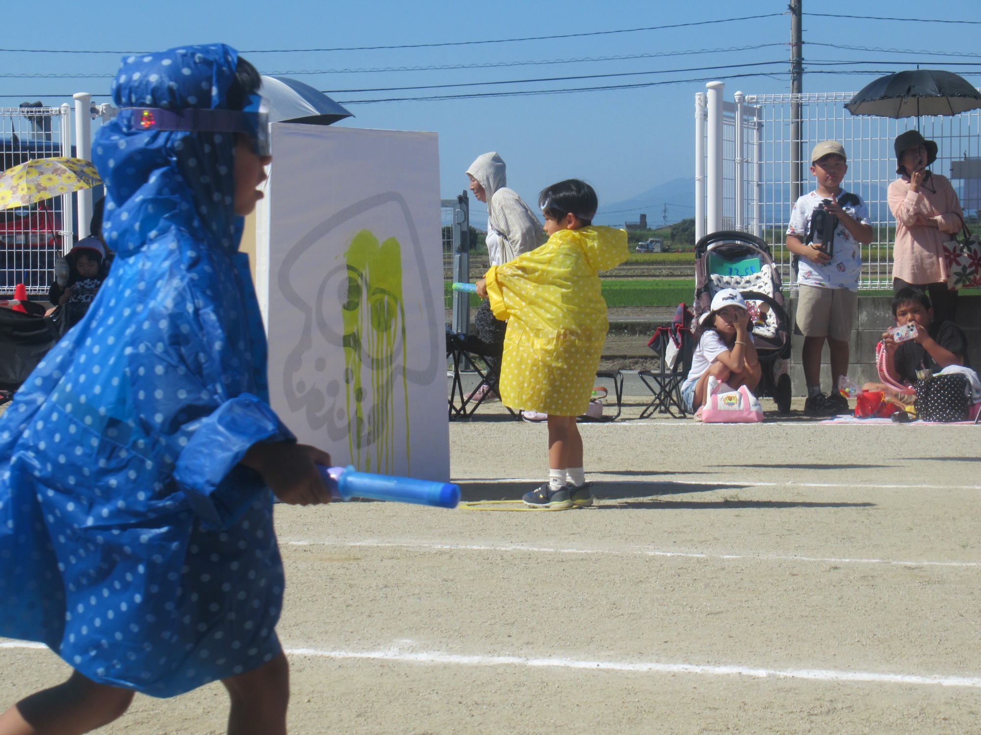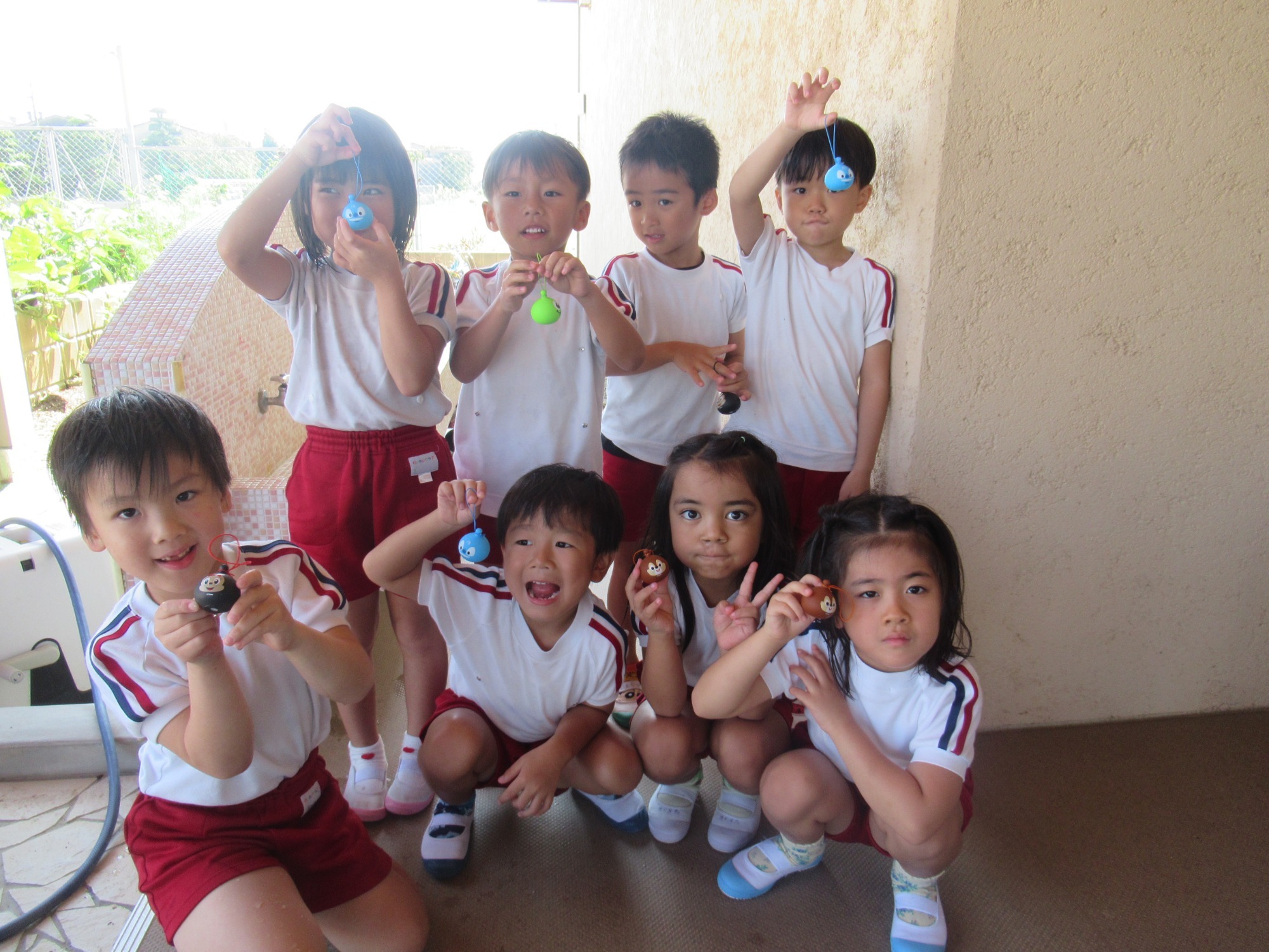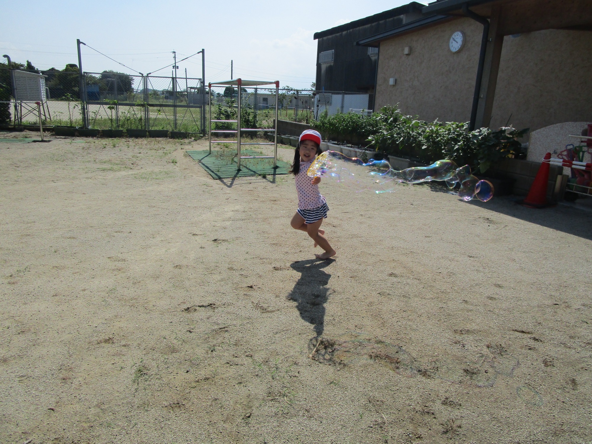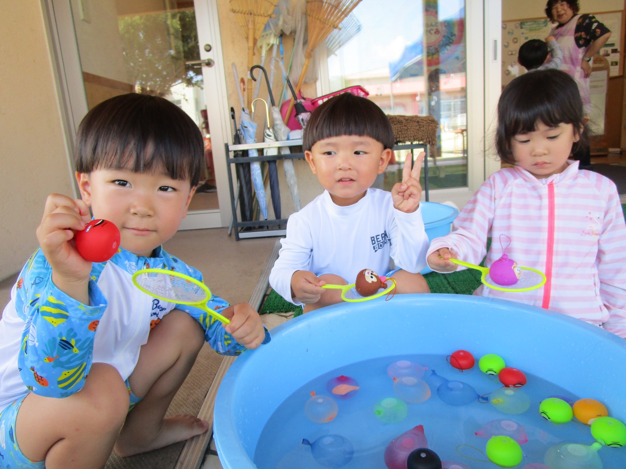 夏の間、子どもたちが大好きだったプール遊び。プール納会では「プールさん、ありがとう」と元気いっぱいに声を合わせてお礼をし、事故やケガもなく安全に楽しく水遊びができたことに感謝しました。 そのあと、ヨーヨー釣りでは「とれたよ!」と嬉しそうな笑顔があふれ、シャボン玉ではキラキラ光る泡が青空にとんでいき子どもたちは大はしゃぎでした。さらに保護者の方からたくさんのスイカを頂き、みんなでスイカ割りを楽しみました。「まっすぐ!」「元右だよー」と元気な声援の中、スイカにヒビが入ると子どもたちからは大歓声。あまーい美味しいスイカをみんなでいただきました。