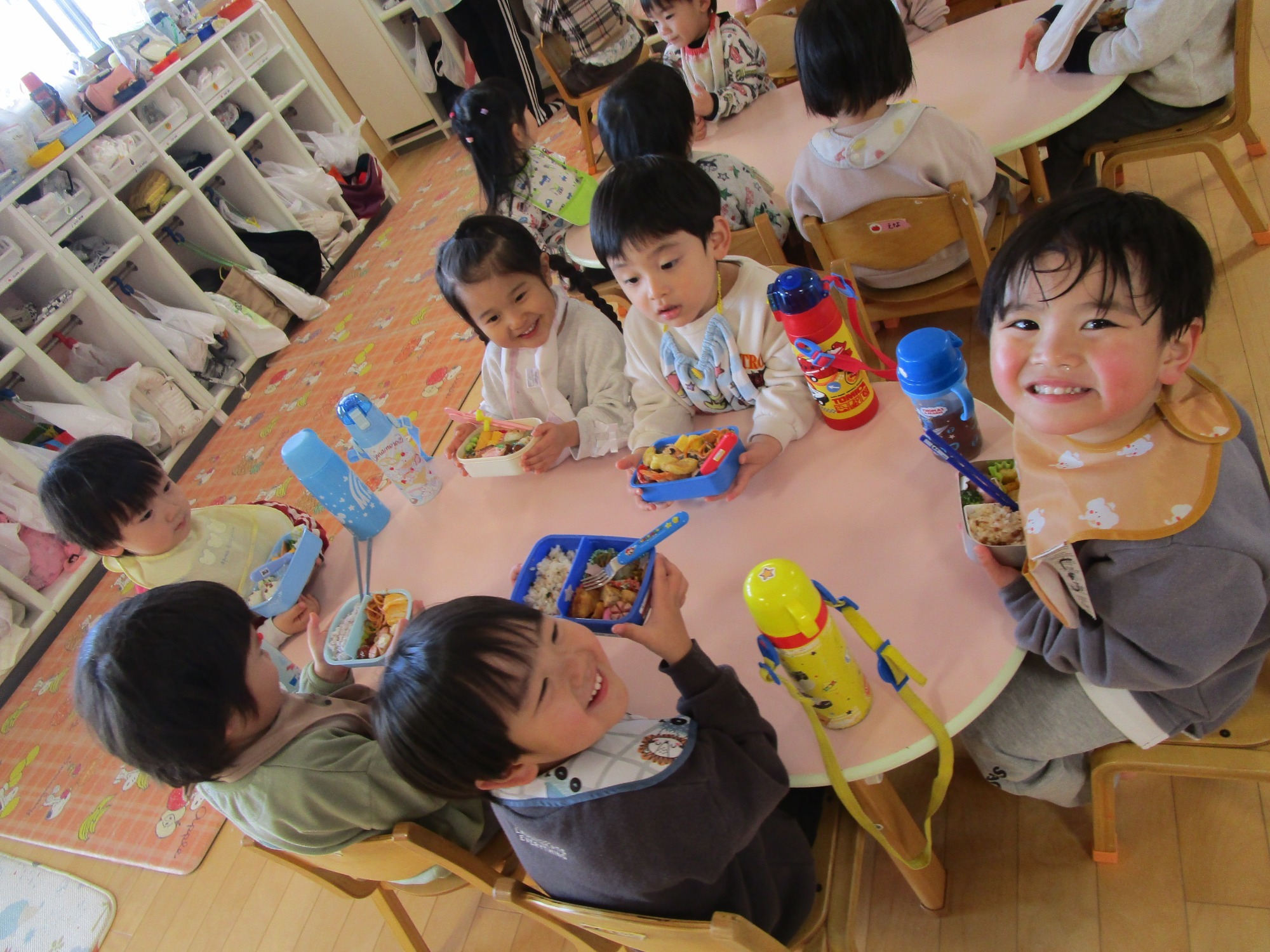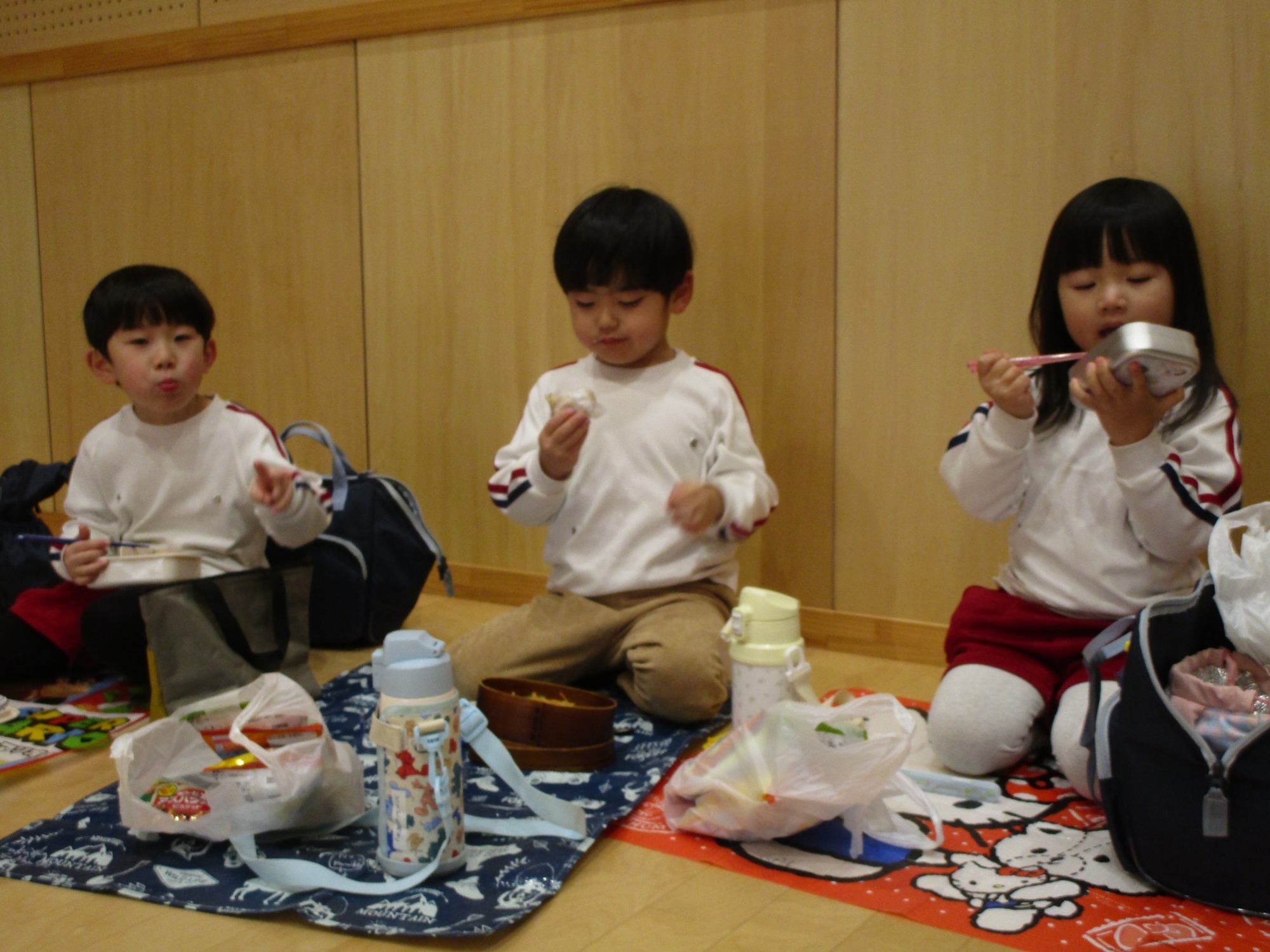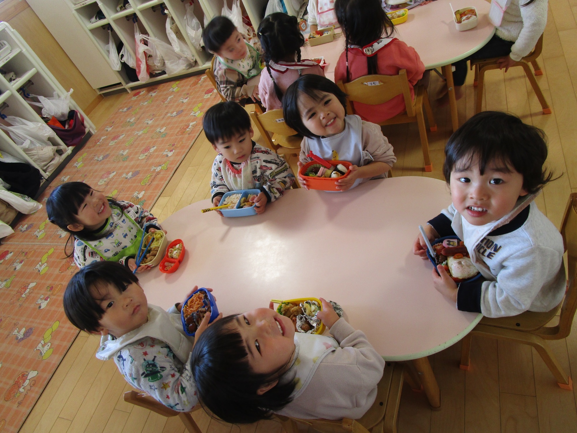 園に戻った子どもたちは、お腹ペコペコで楽しみにしていたお弁当を喜んでパクパク食べました。