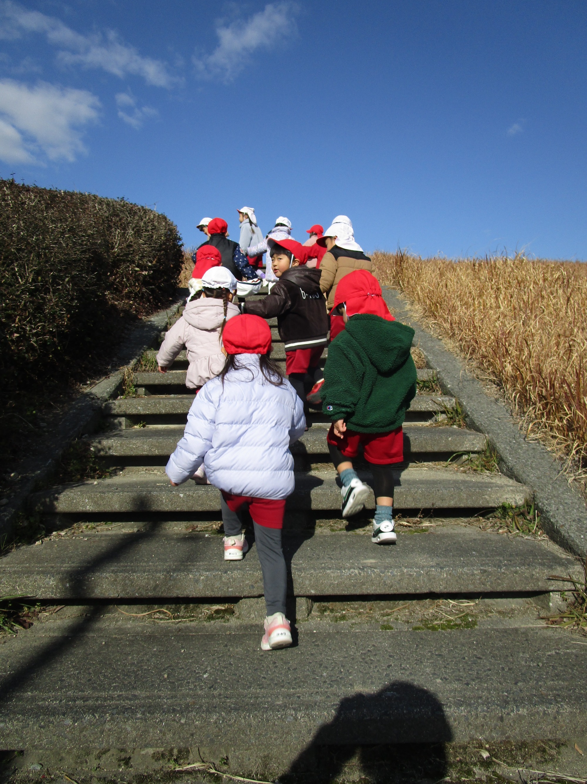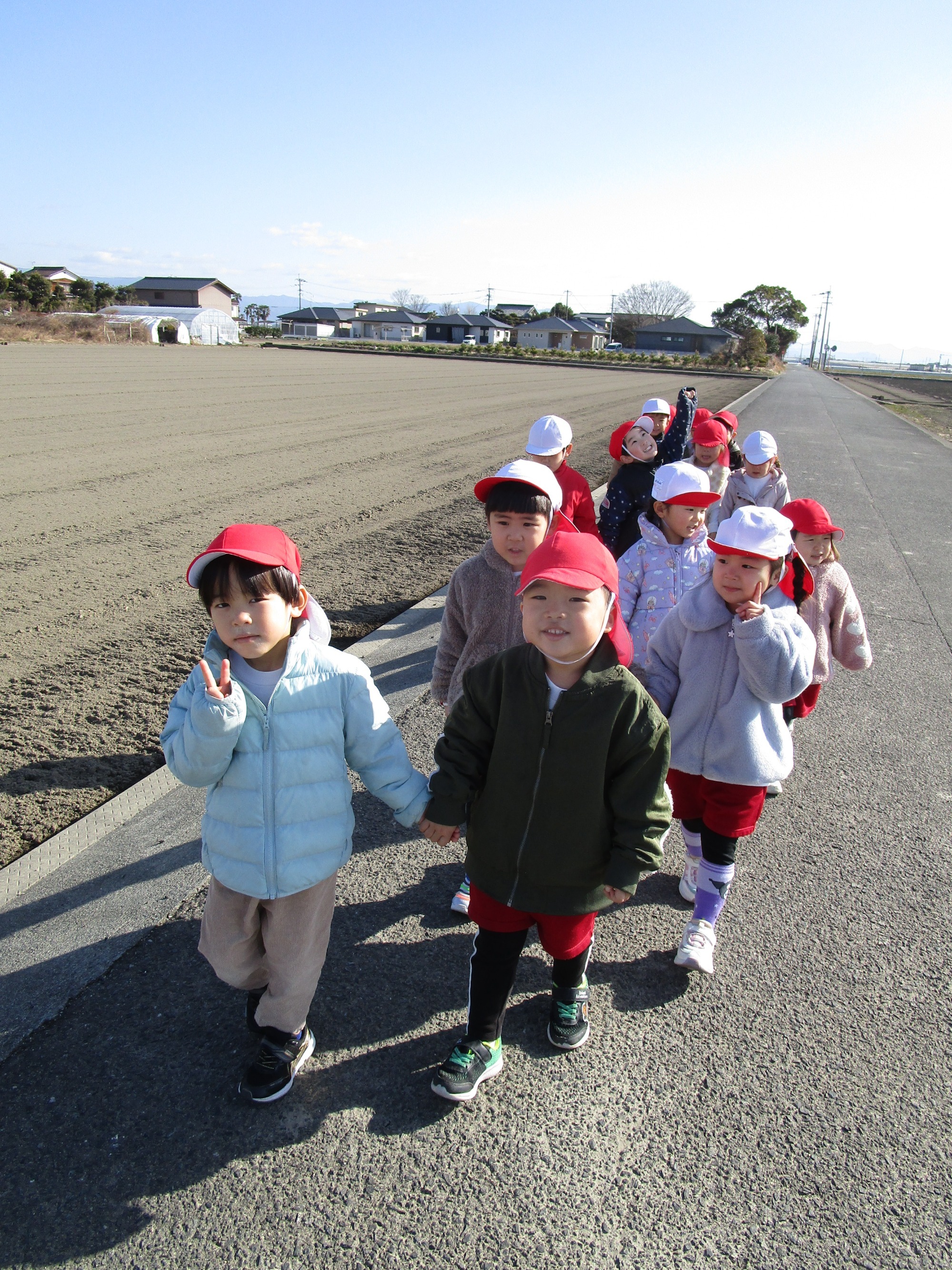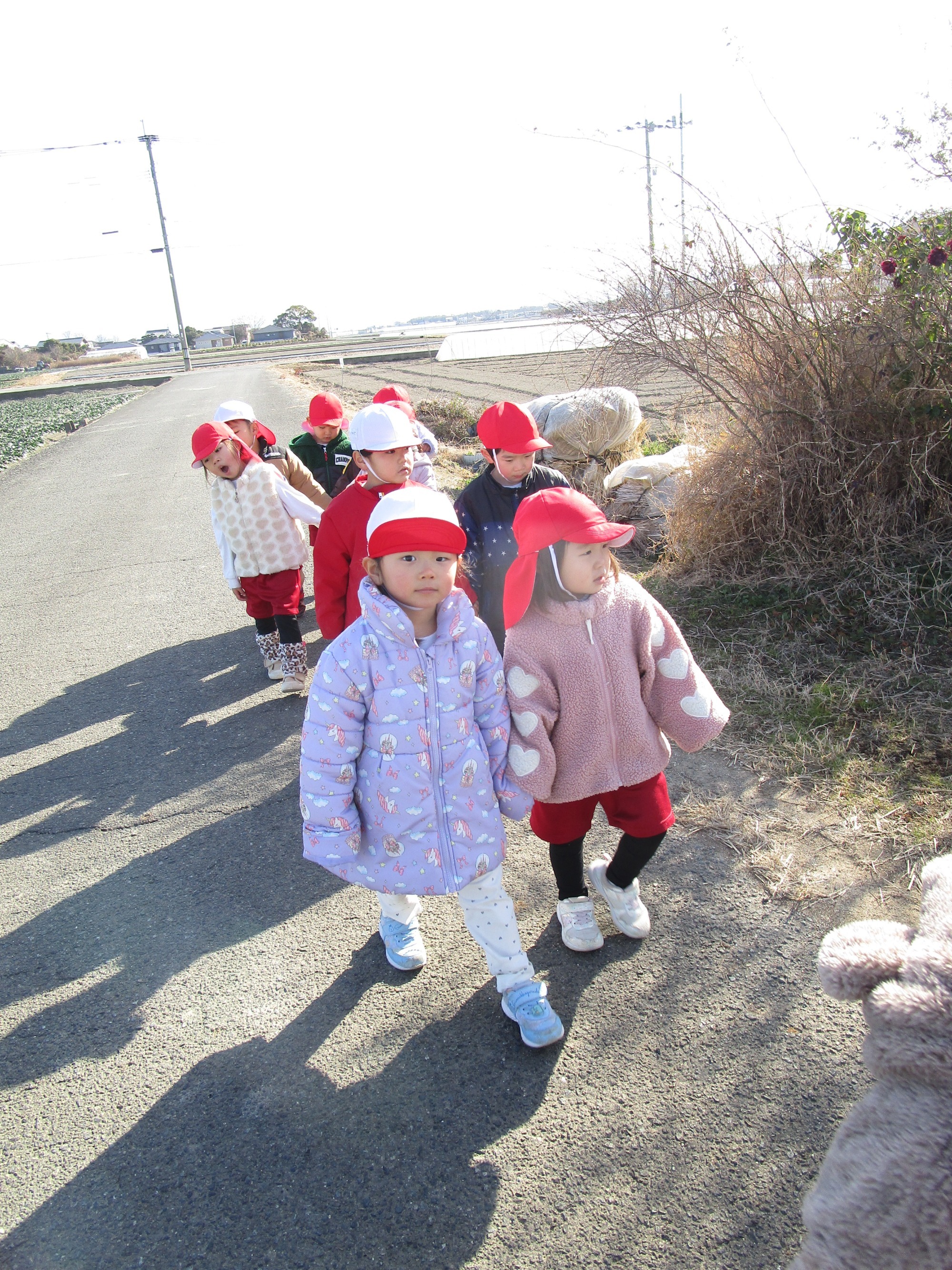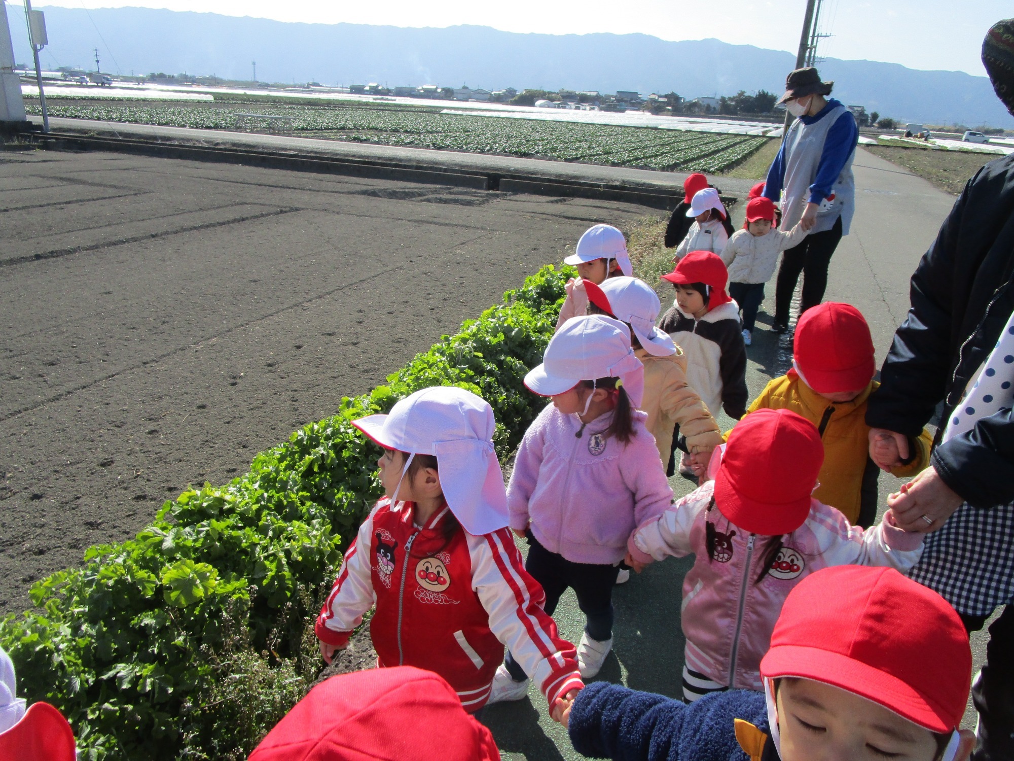 風がちょっと冷たかったですが、子どもたちは元気に歩き、冬の野菜“ほうれん草、大根、レタス、白菜”