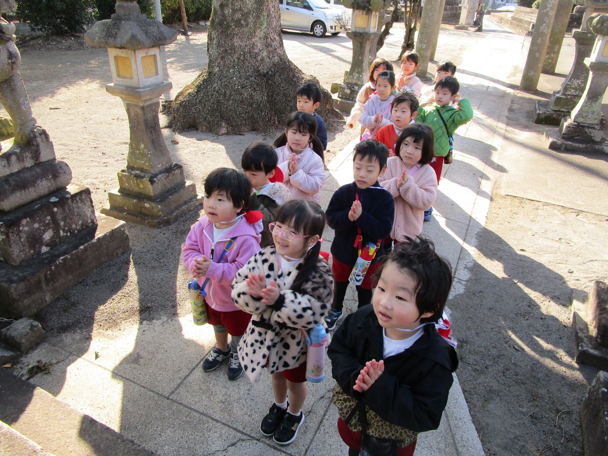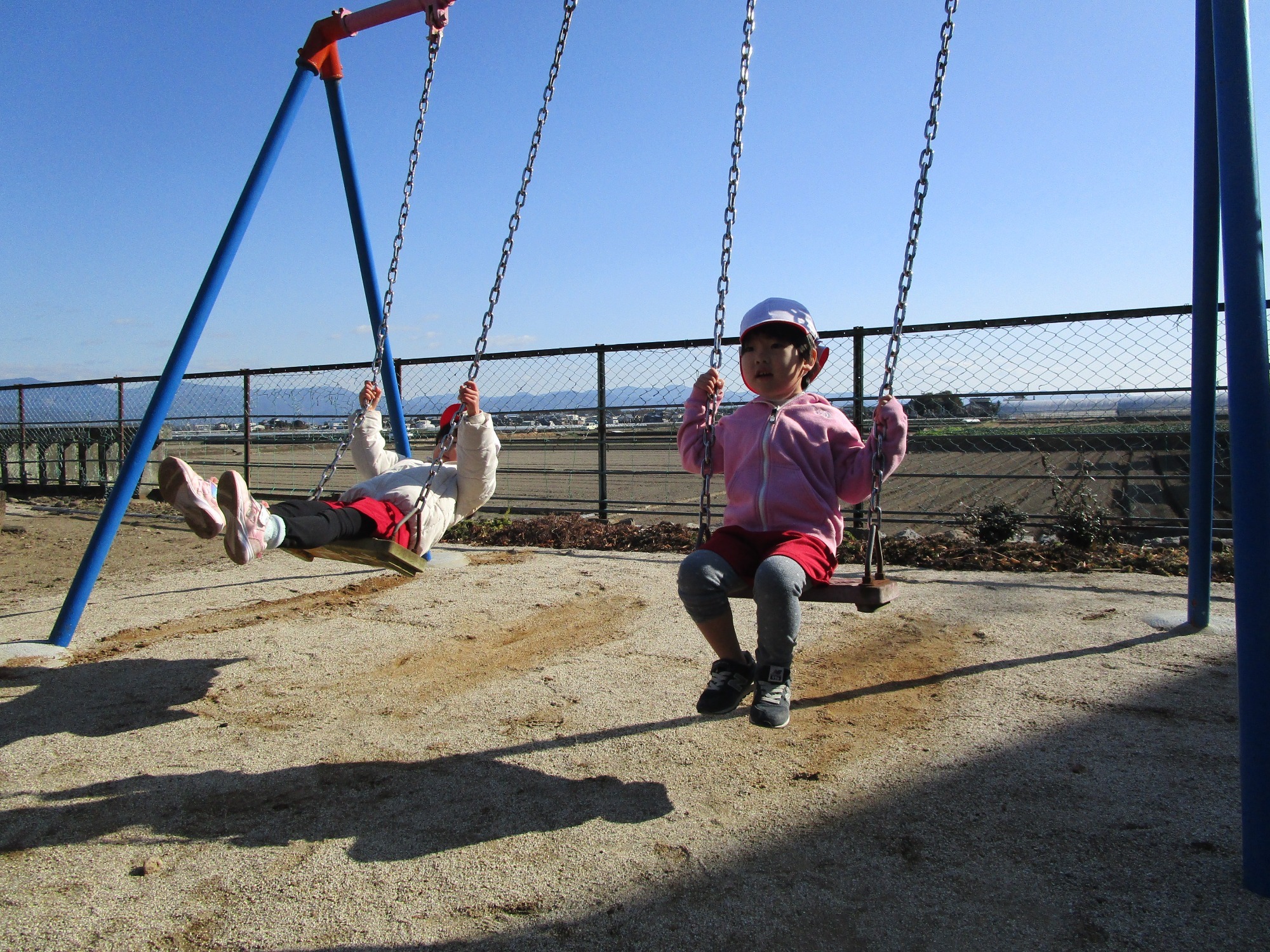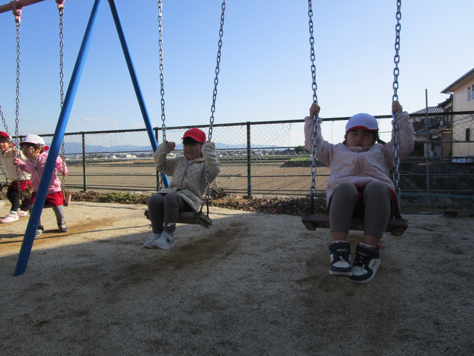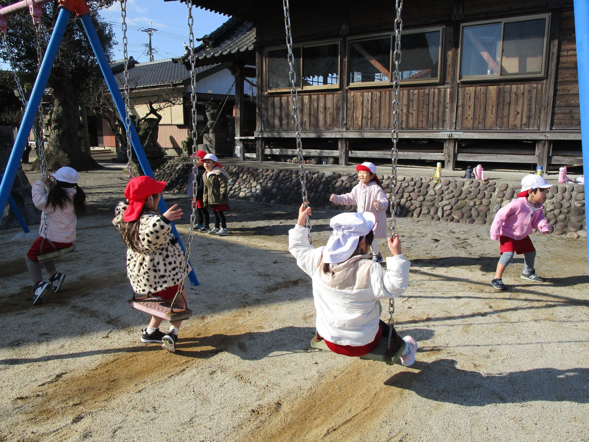 神社でお参りした後は、ブランコや鉄棒をしたりして楽しく遊びました。