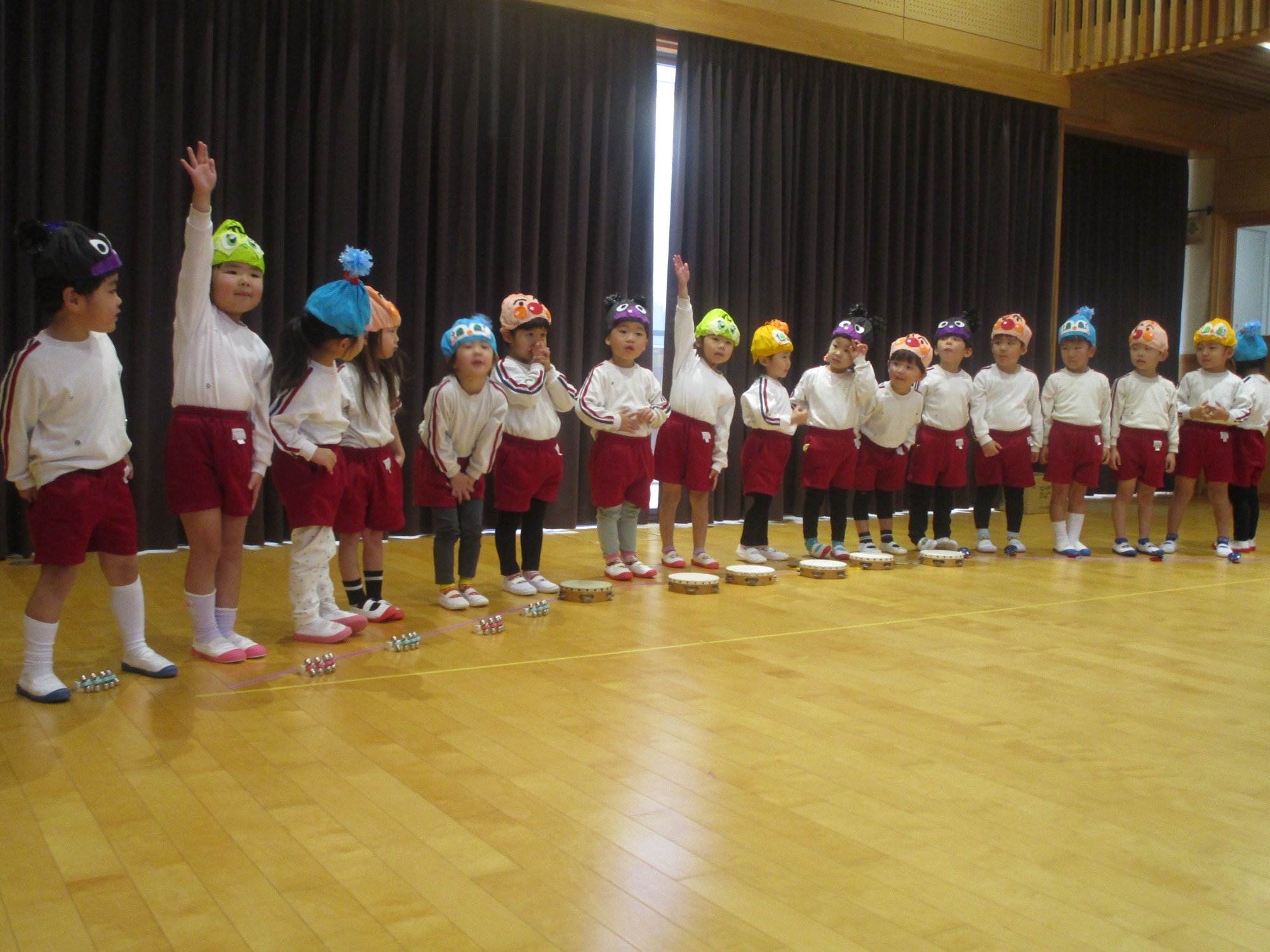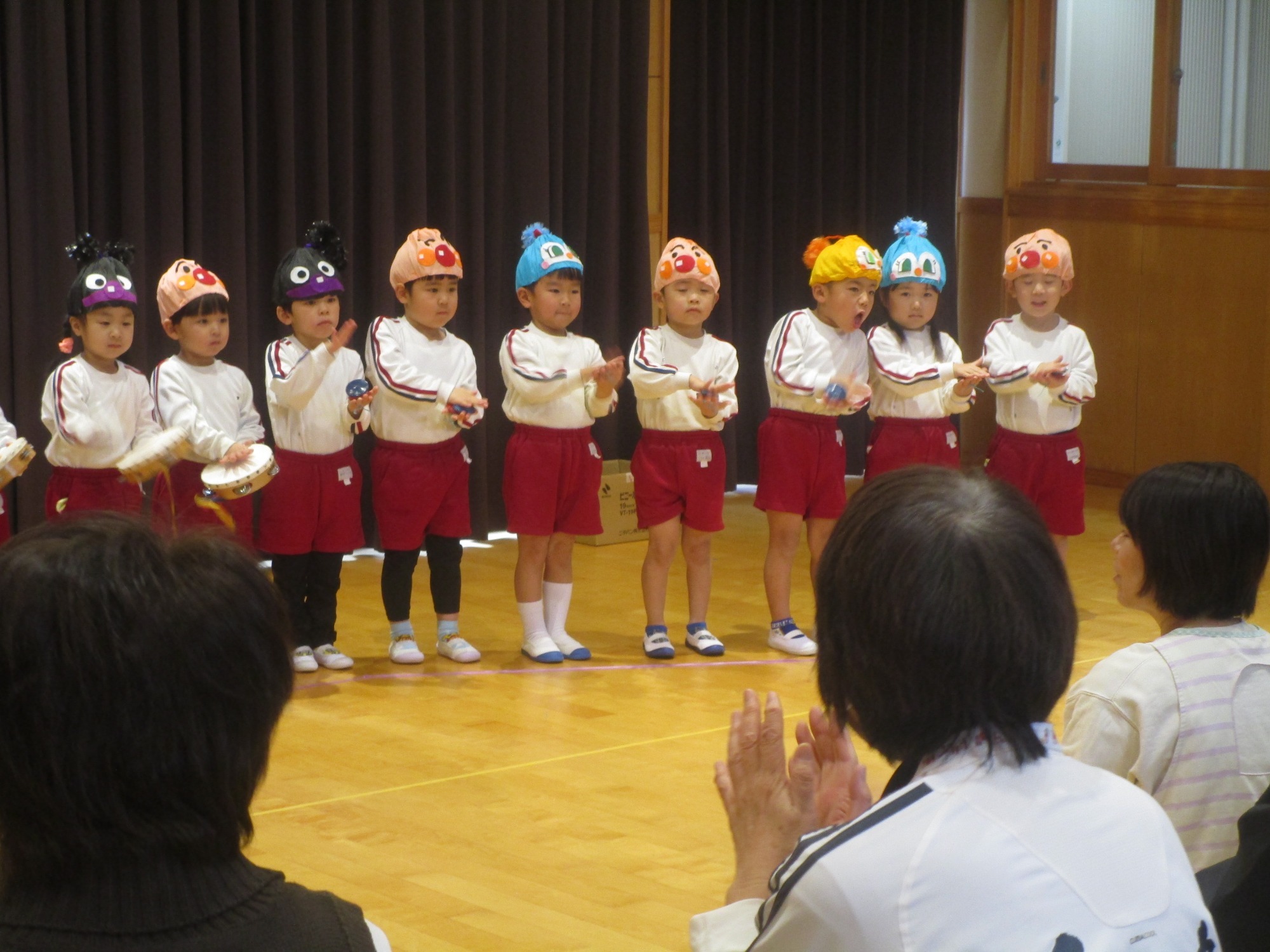 はな組さんは劇「おおかみと12ひきのこやぎ」合奏・歌「アンパンマンマーチ、勇気りんりん」