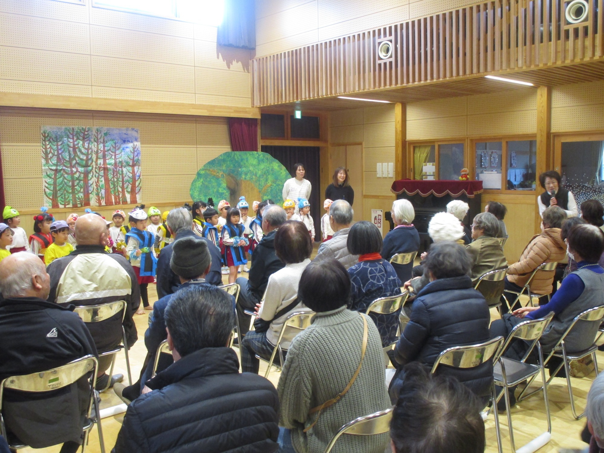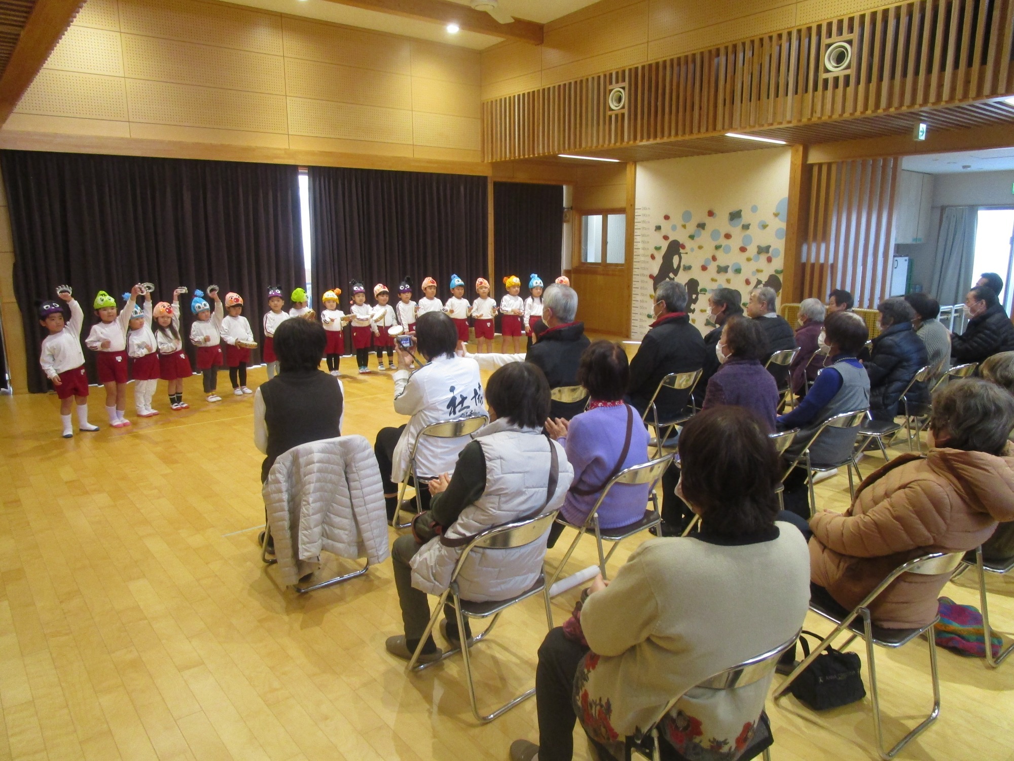 保育園の広場で季節の歌や12月の発表会で披露した歌や合奏、劇を楽しんでいただきました。