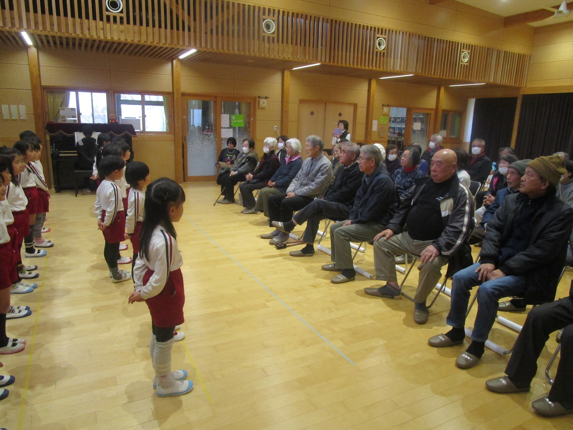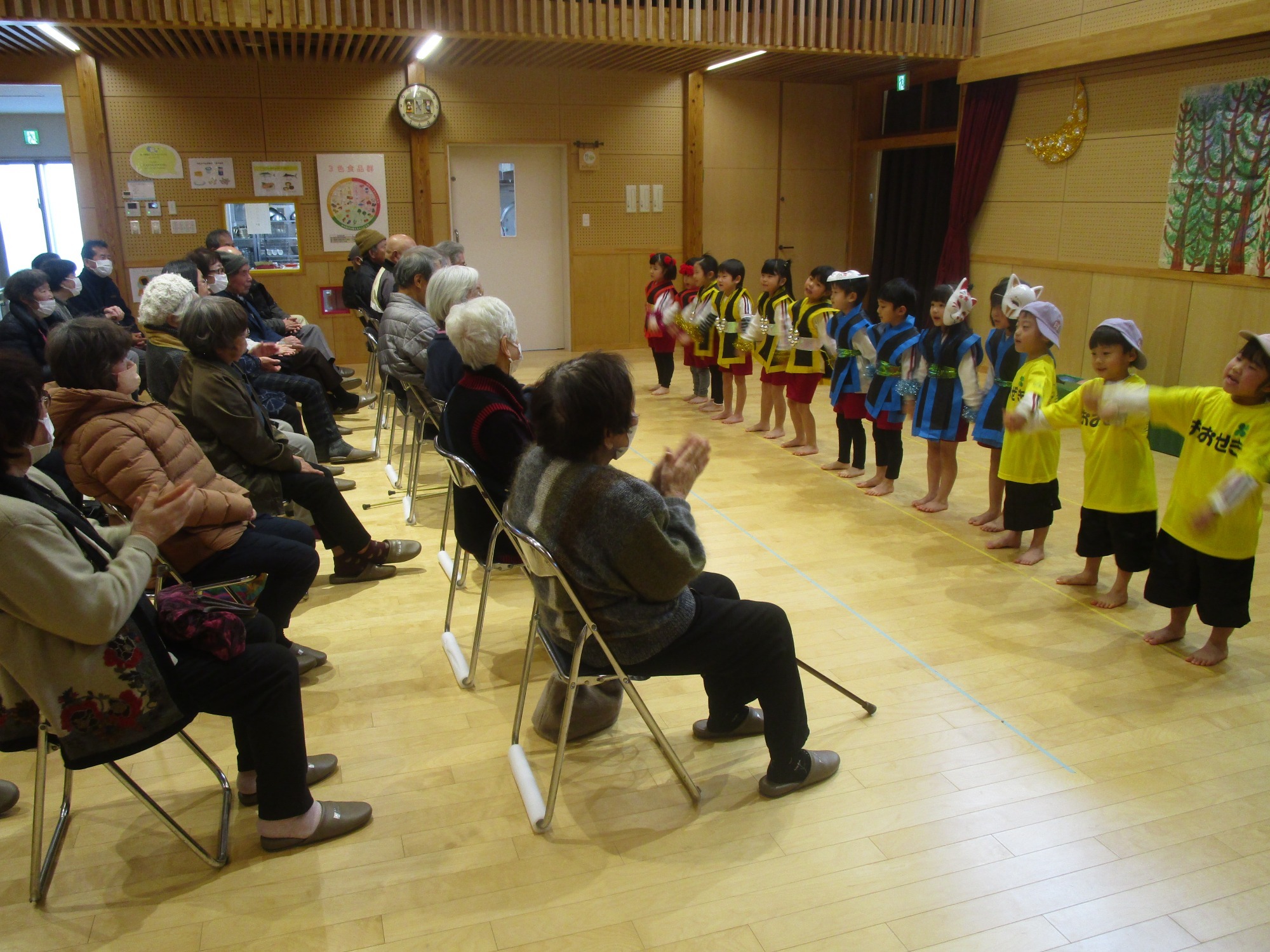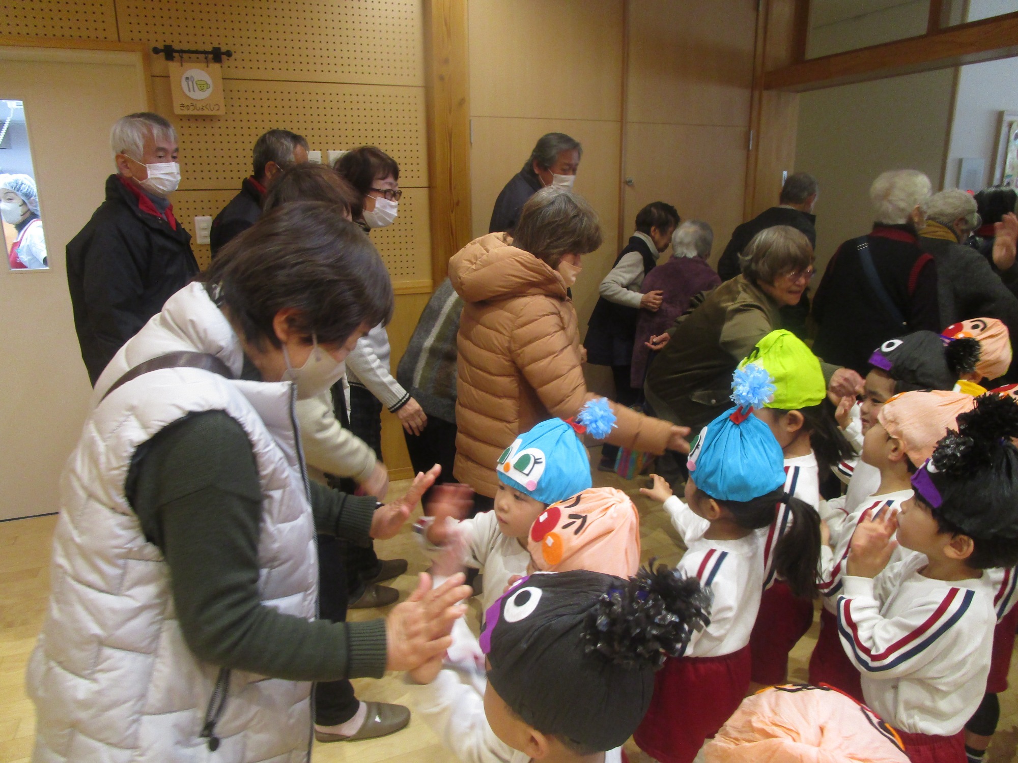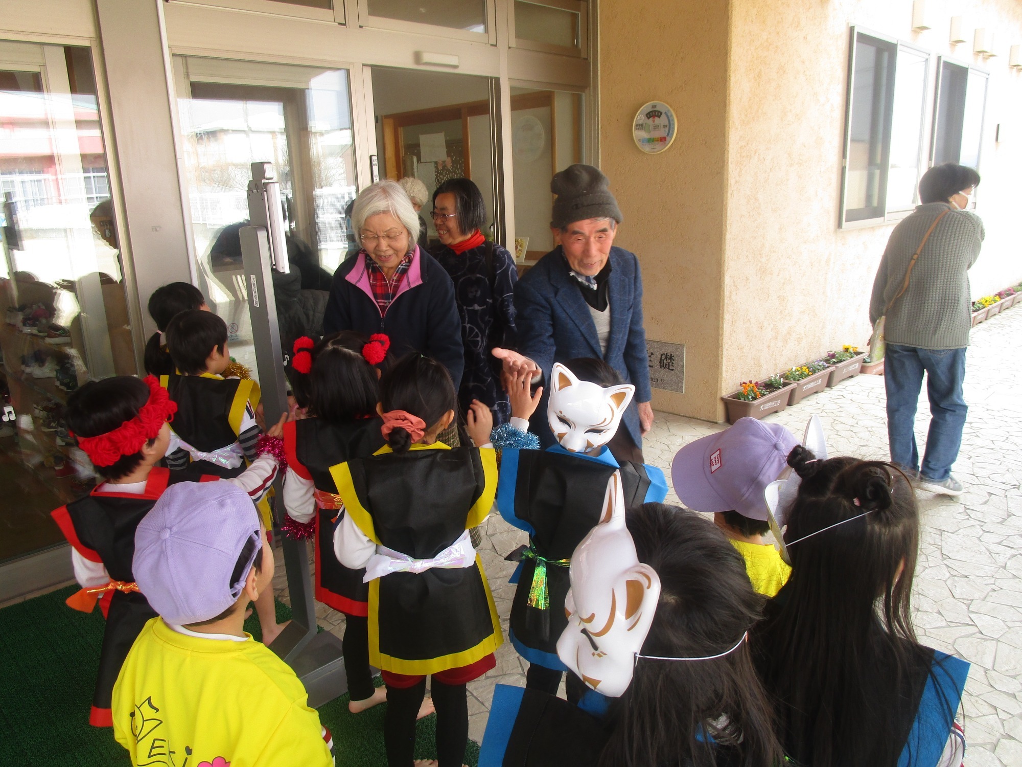 地域の方に「上手だったよ!!」と温かい言葉をかけていただき、たくさんの拍手を頂きました。子どもたちは「また、遊びに来てください」と声をかけながら、地域の方とタッチして玄関までお見送りをして楽しいひとときを過ごすことができました。