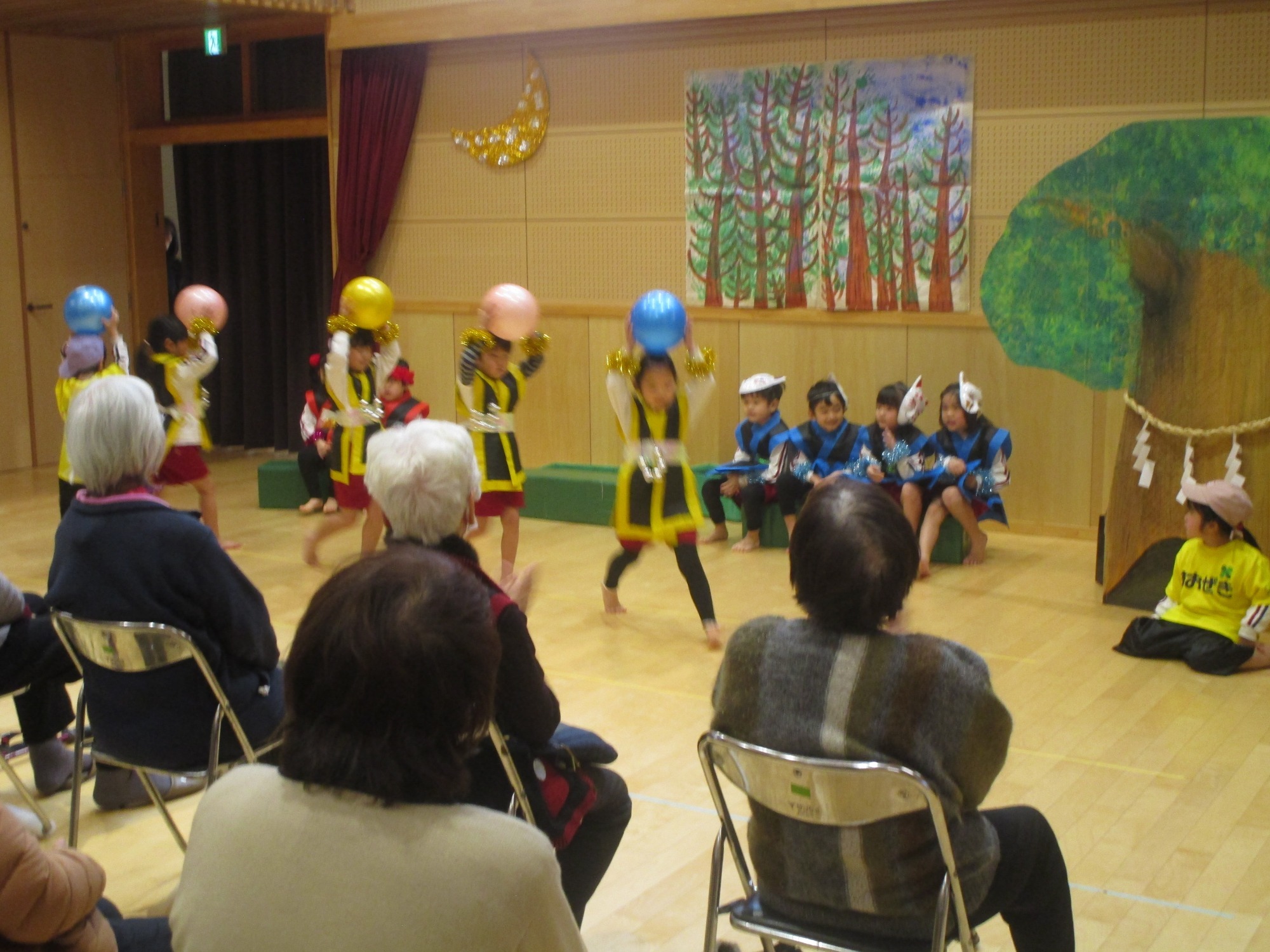 音楽に合わせて体を動かしリズムに乗ったり、先生やお友だちと一緒に名前やセリフを言う姿が可愛らしく、一人ひとりの成長を感じる発表会でした。