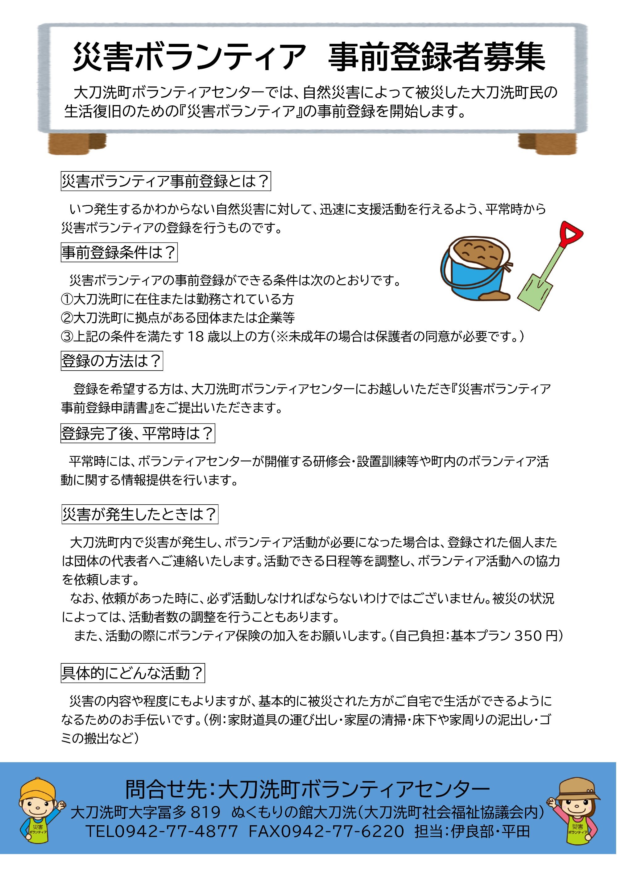 大刀洗町ボランティアセンターでは、自然災害によって被災した大刀洗町民の生活復旧のための『災害ボランティア』の事前登録を行っています。